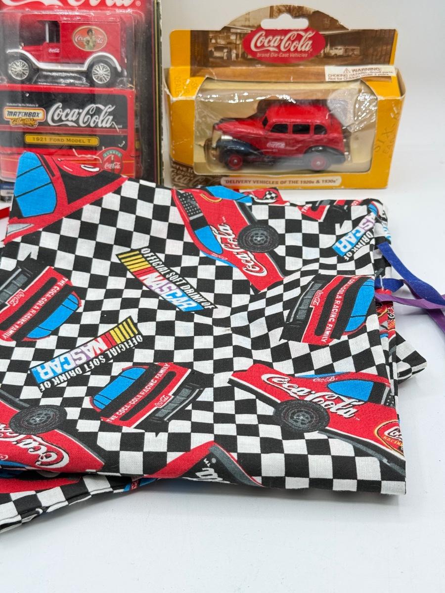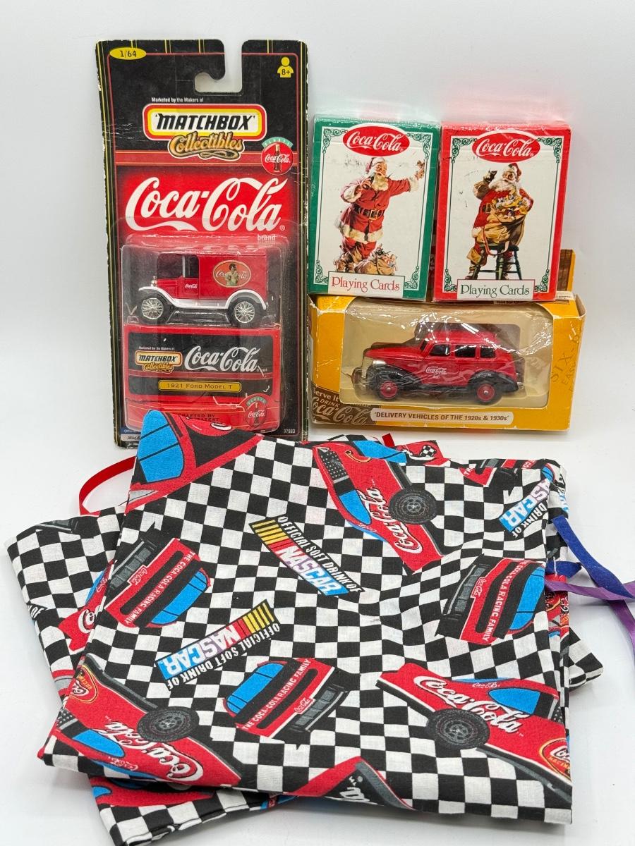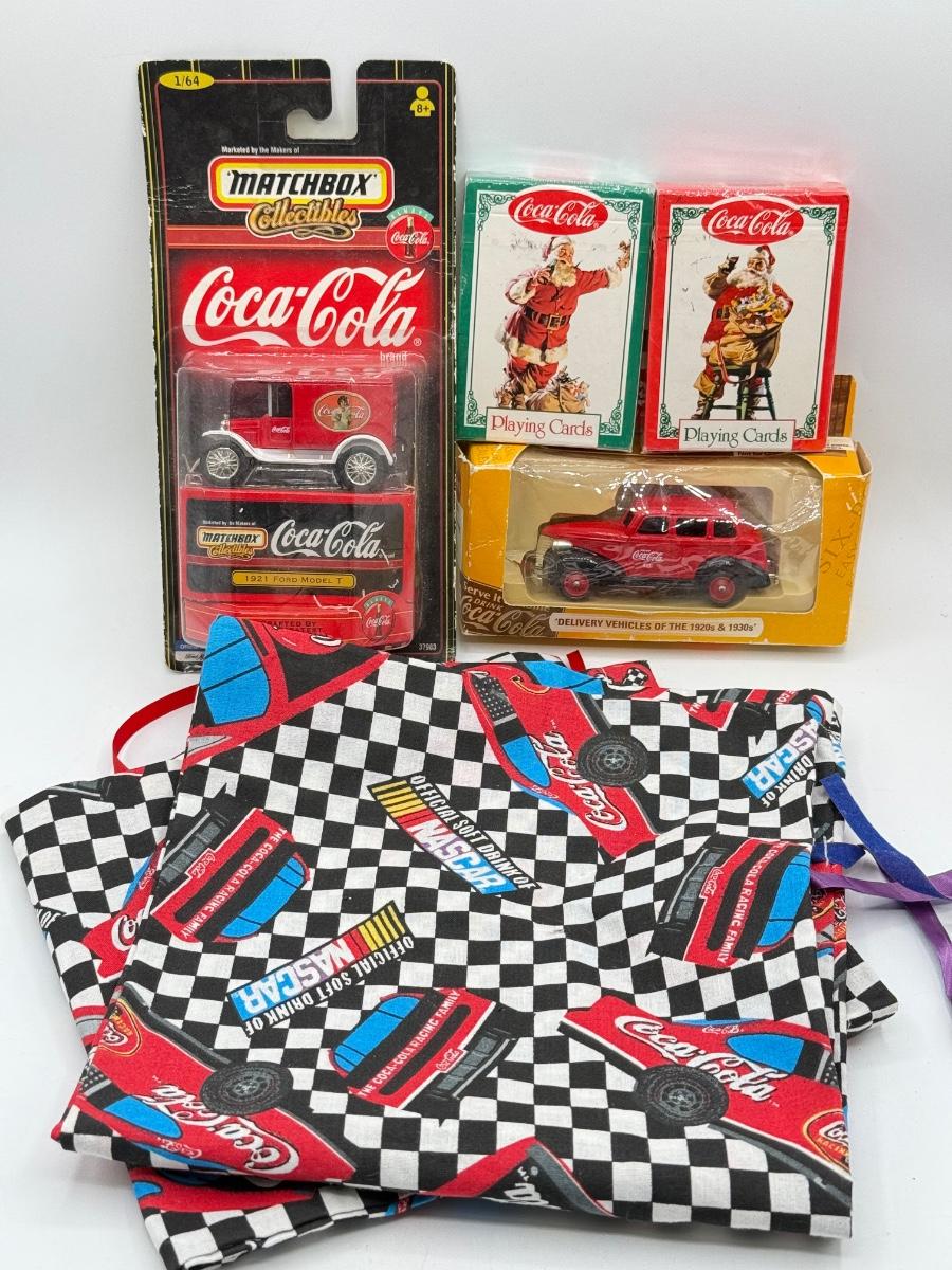 LOT 116: Coca Cola Collection: Matchbox Cars, Santa Playing Cards & NASCAR Fabric
