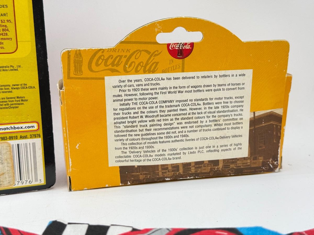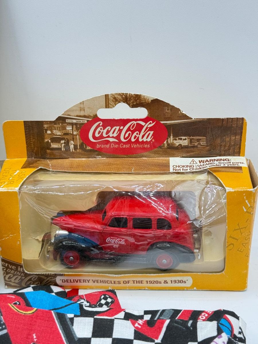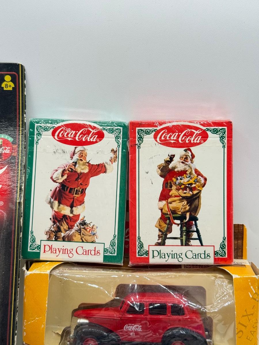 LOT 116: Coca Cola Collection: Matchbox Cars, Santa Playing Cards & NASCAR Fabric