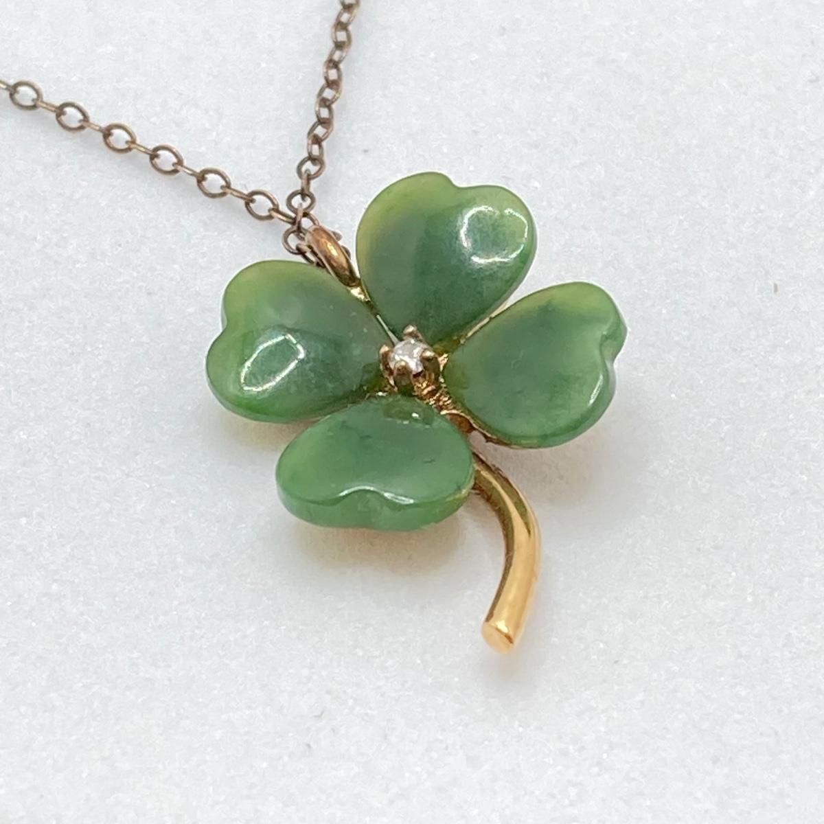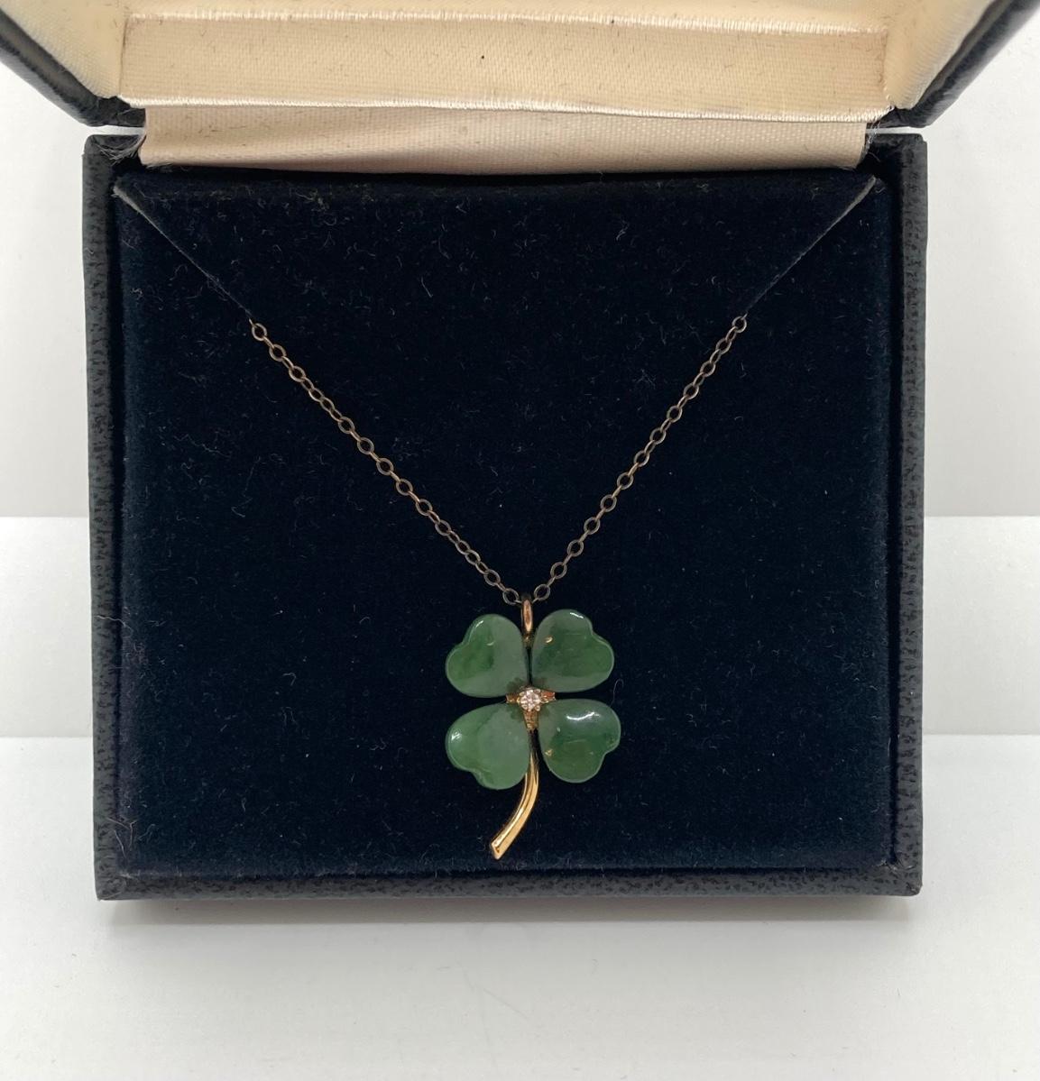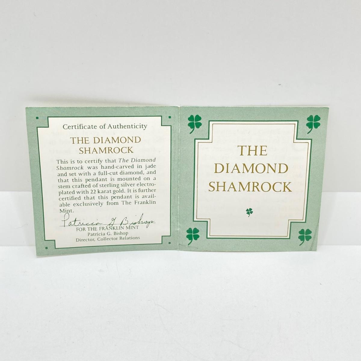 LOT 57: Vintage / Rare The Franklin Mint "The Diamond Shamrock" - Jade Four (4) Leaf Clover with Diamond Center and Sterling Pendant Necklace