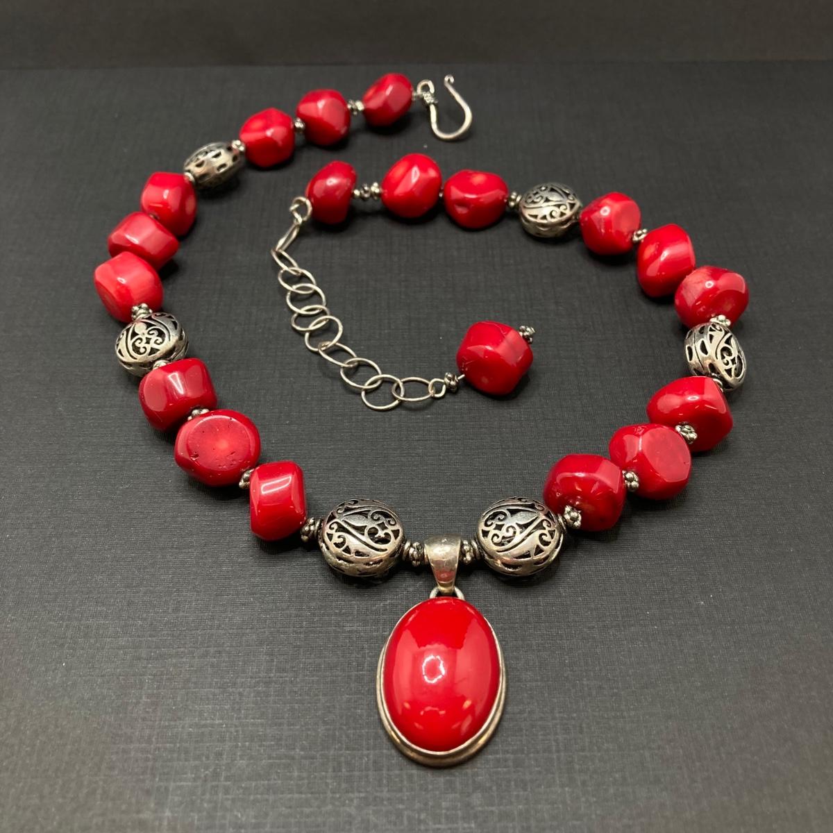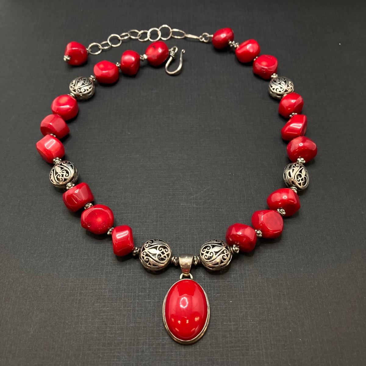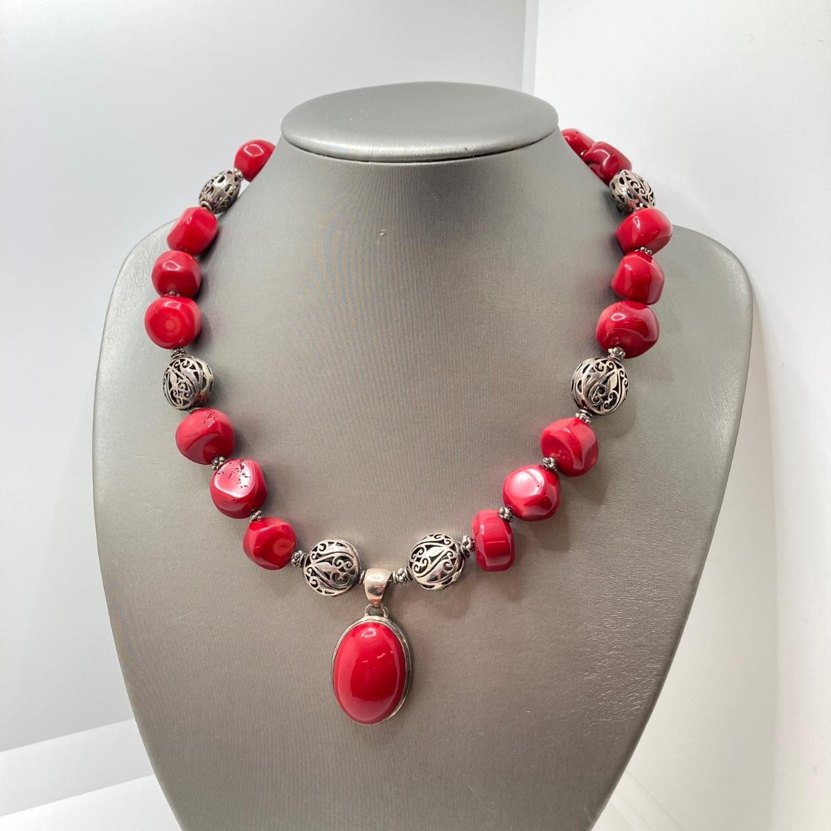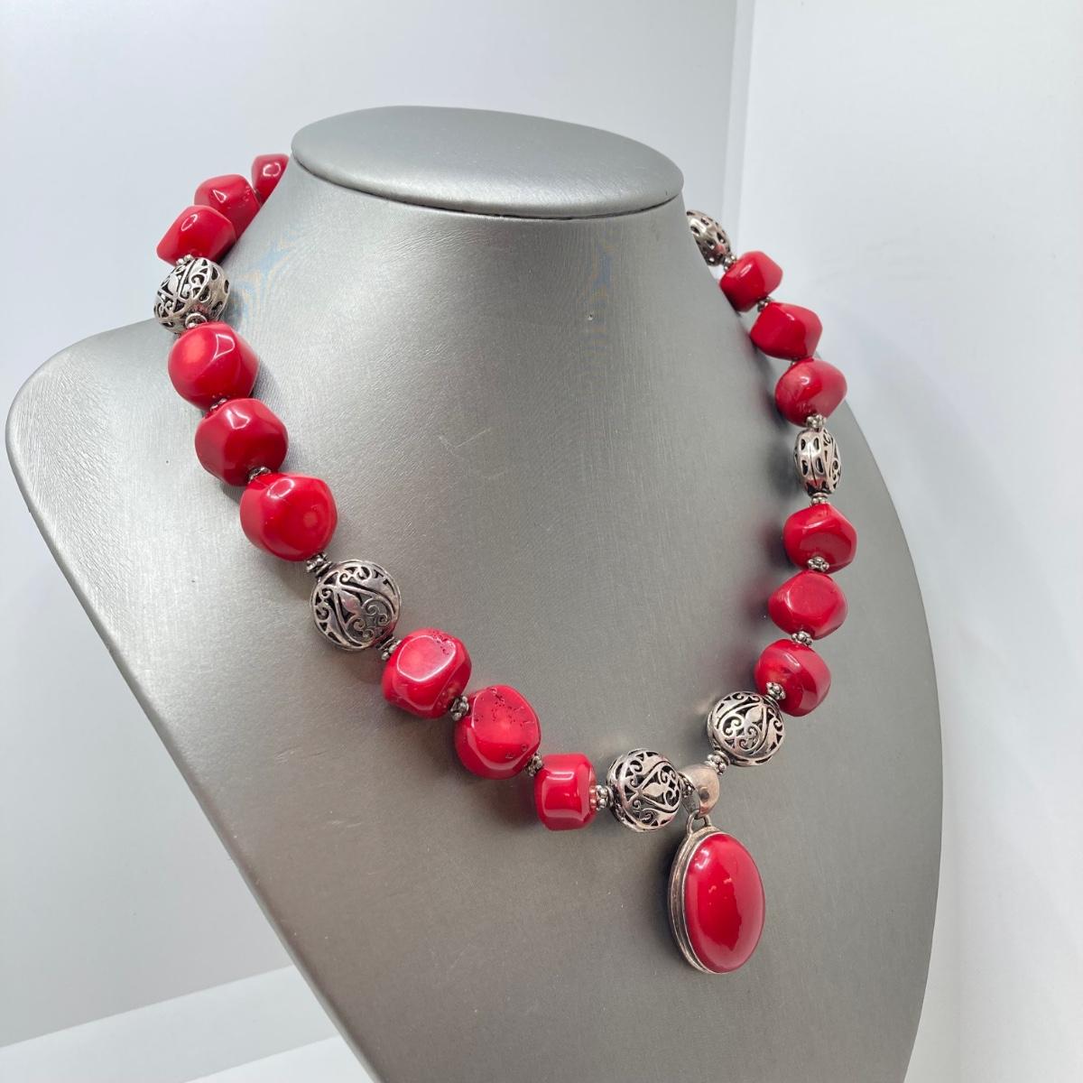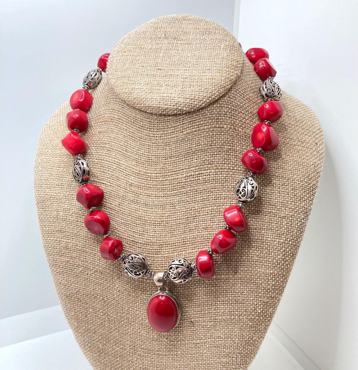 LOT 67: Stunning Vintage Artisan Red Coral / Sterling Pendant Necklace