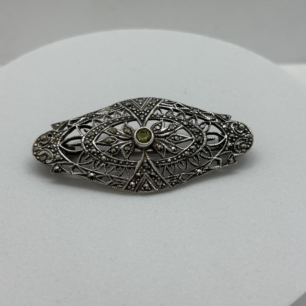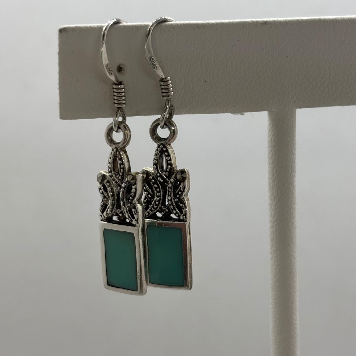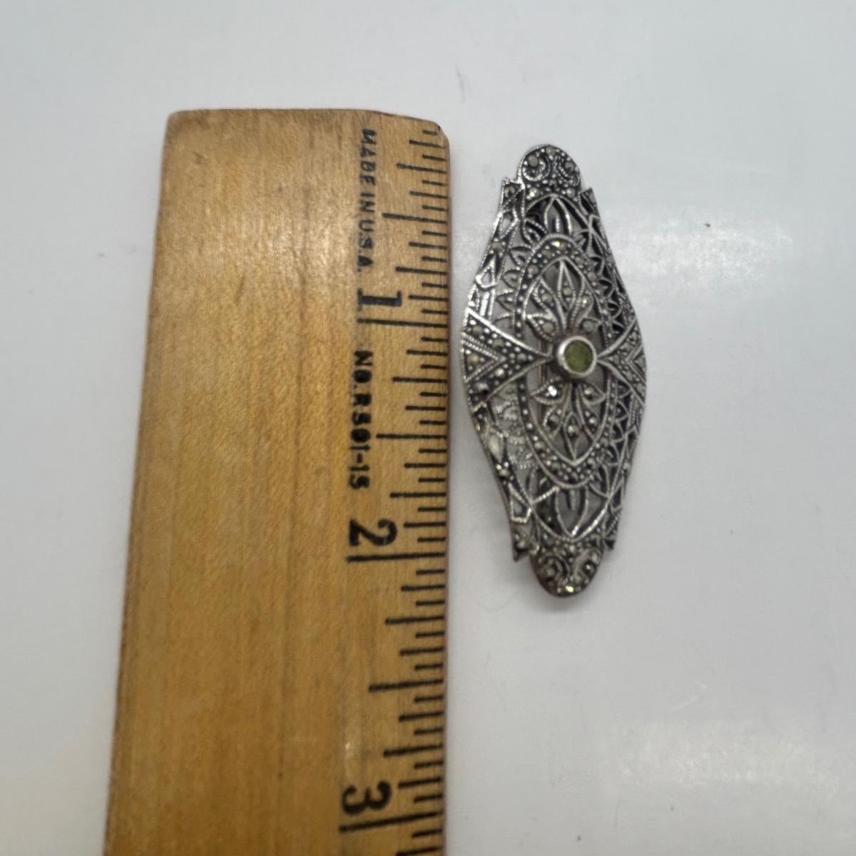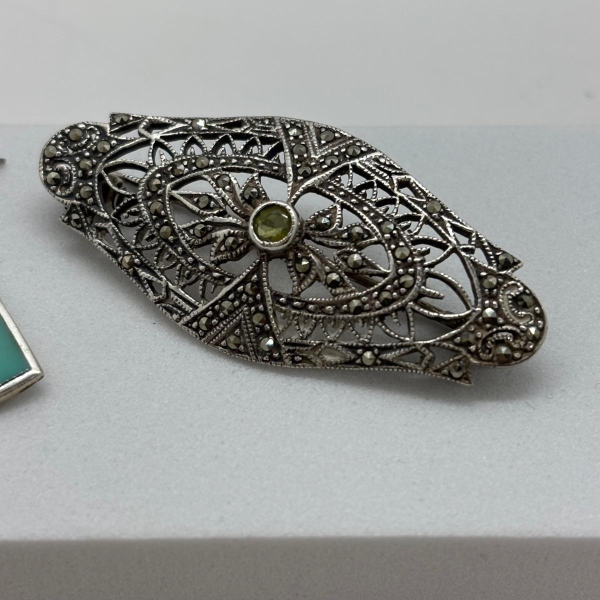 LOT 86: Vintage Art Deco Sterling Silver Marcasite Brooch w/Center Green Stone along w/ Sterling Silver 925 Dangling Earring w/Blue-Green Stone & Marcasite Accents