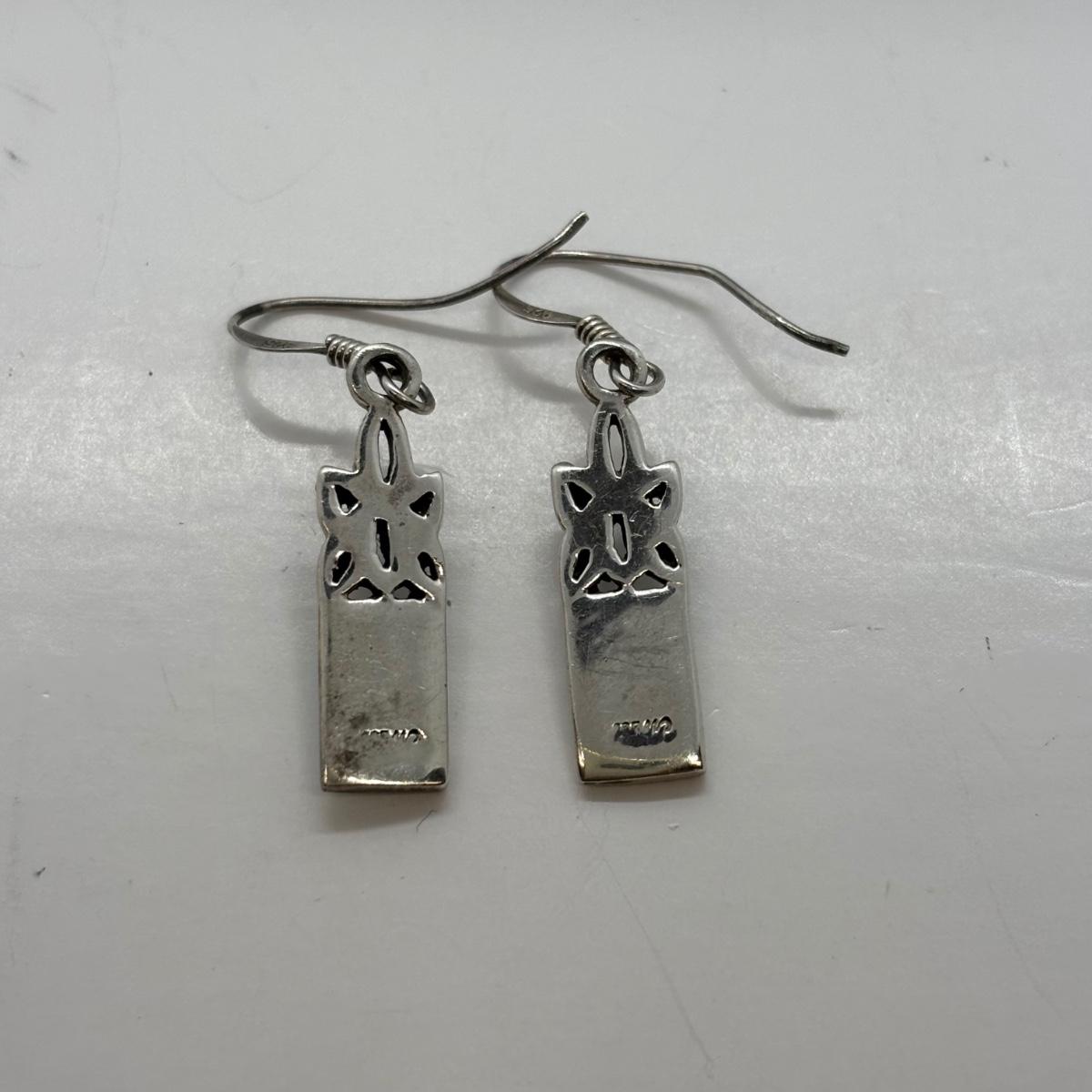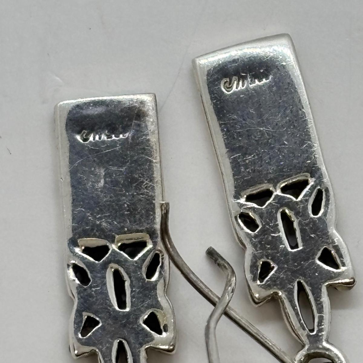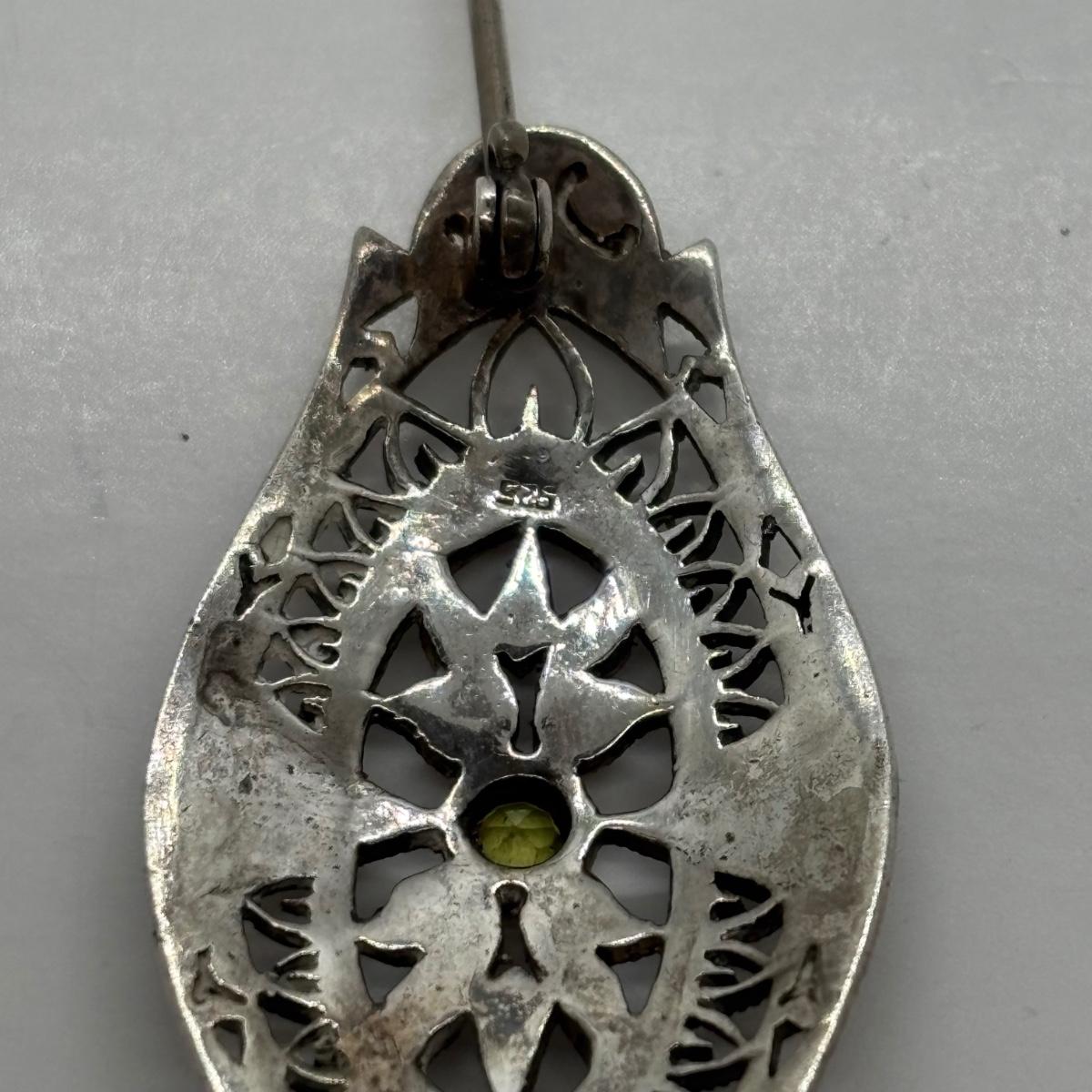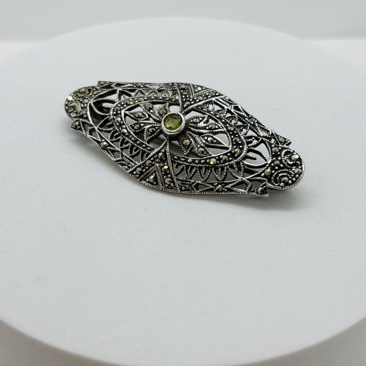 LOT 86: Vintage Art Deco Sterling Silver Marcasite Brooch w/Center Green Stone along w/ Sterling Silver 925 Dangling Earring w/Blue-Green Stone & Marcasite Accents
