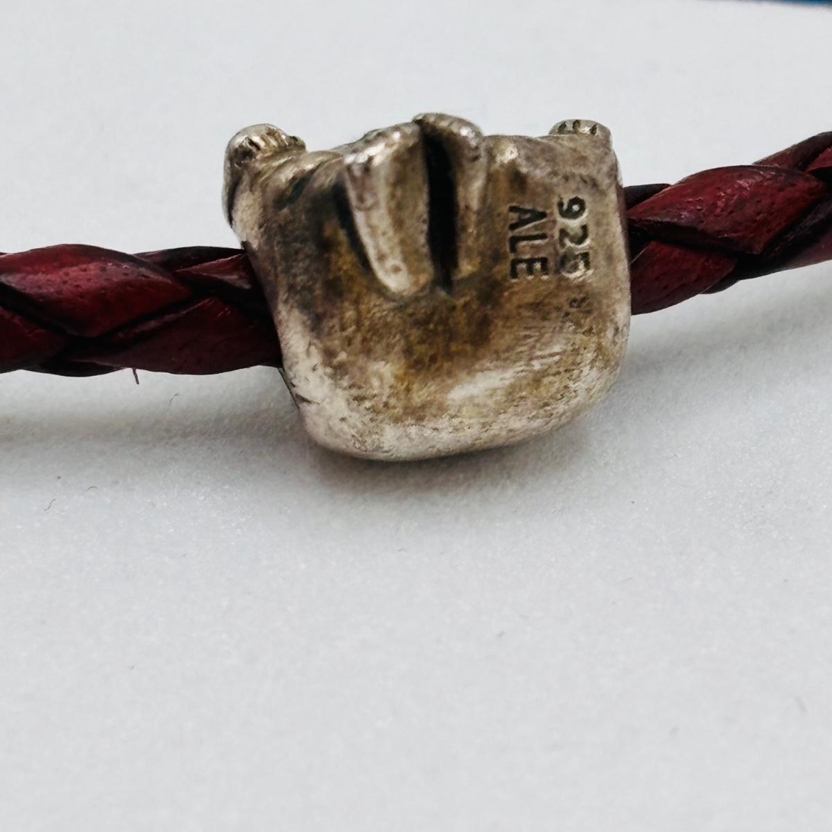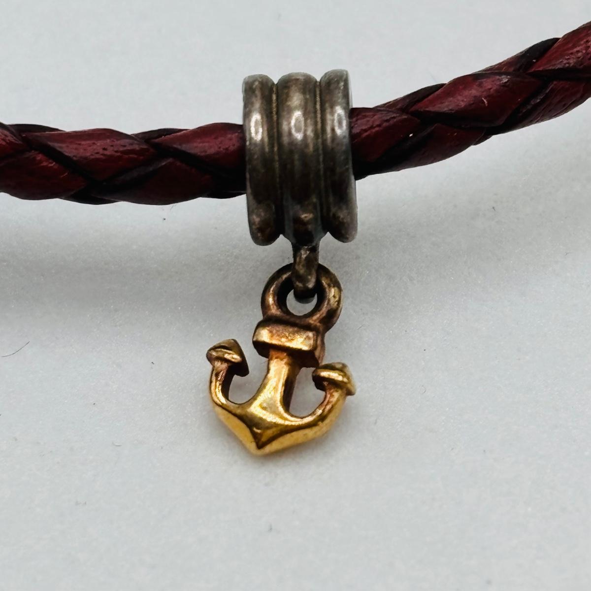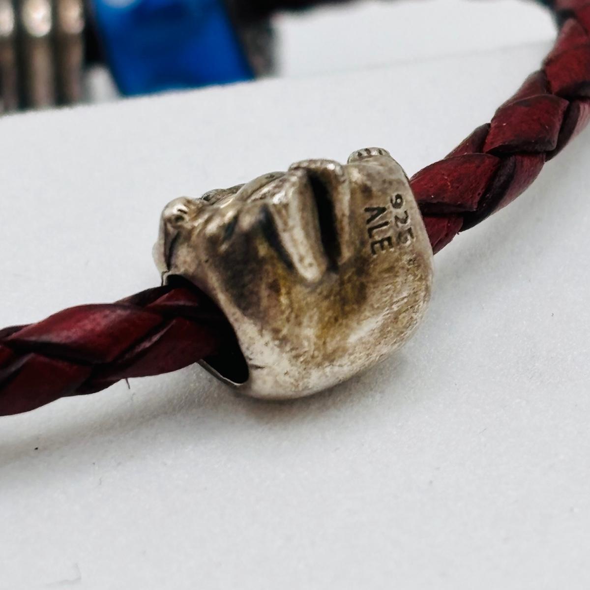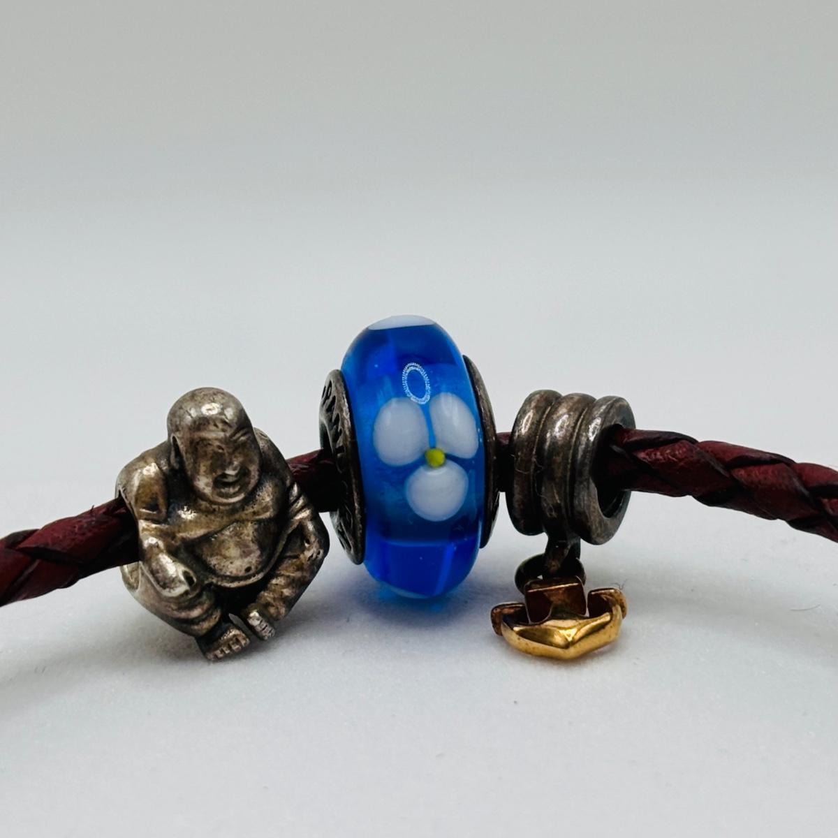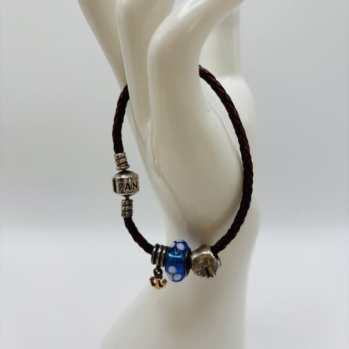 LOT 99; Pandora Leather Braided Bracelet, Blue Glass Floral Charm, Sterling Silver Smiling Budha Charm and a Dangling Anchor Charm