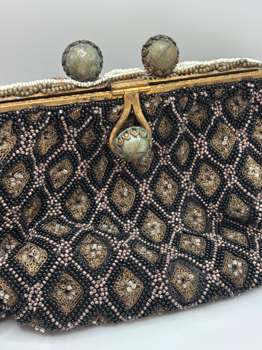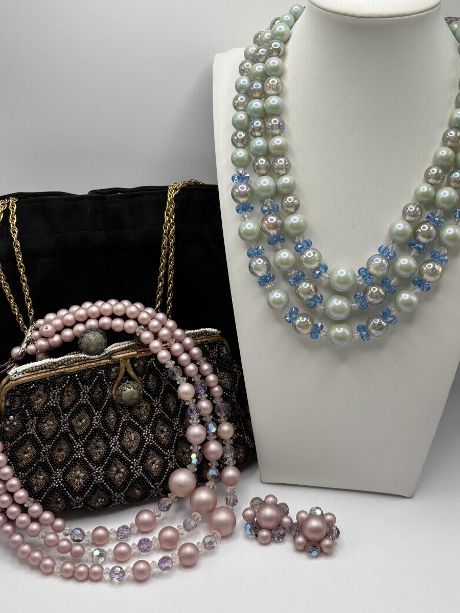 LOT. 112: Gorgeous Black & Gold Beaded Evening Purse, Triple Strand Faux Pearl & Crystal Necklaces & More