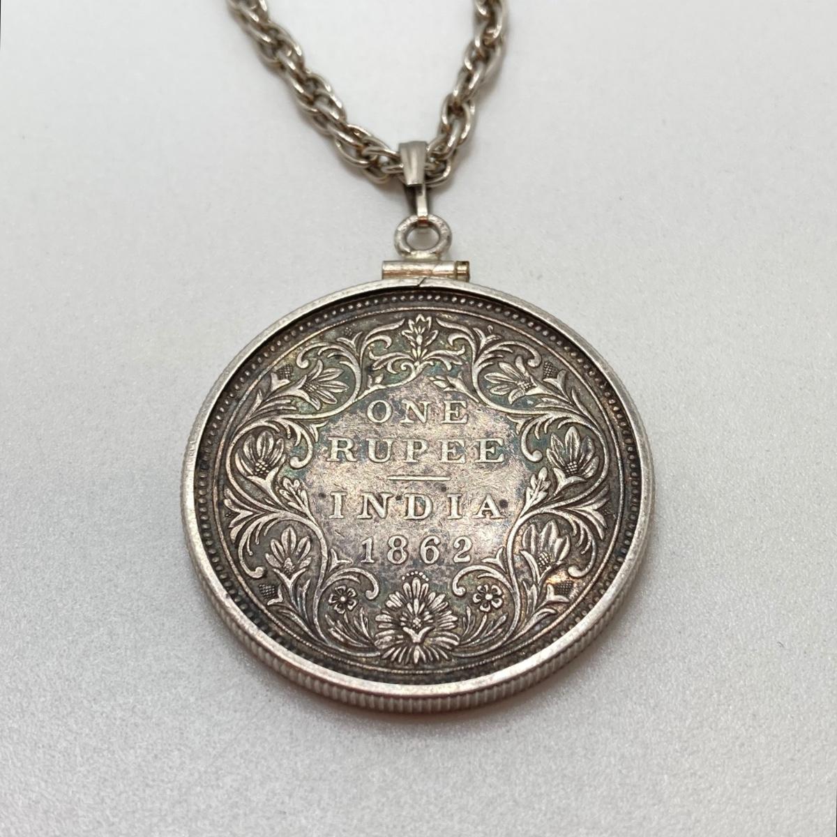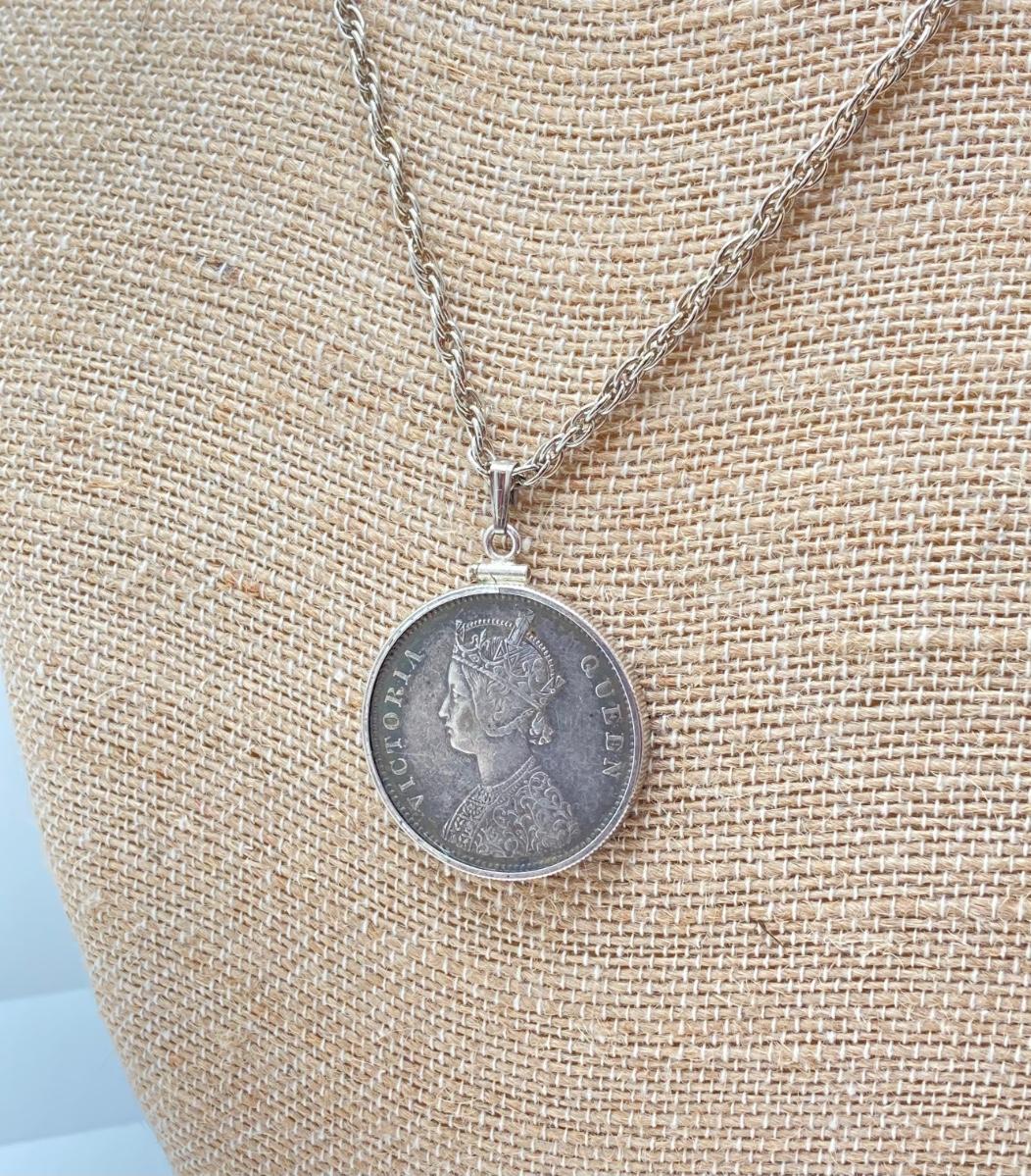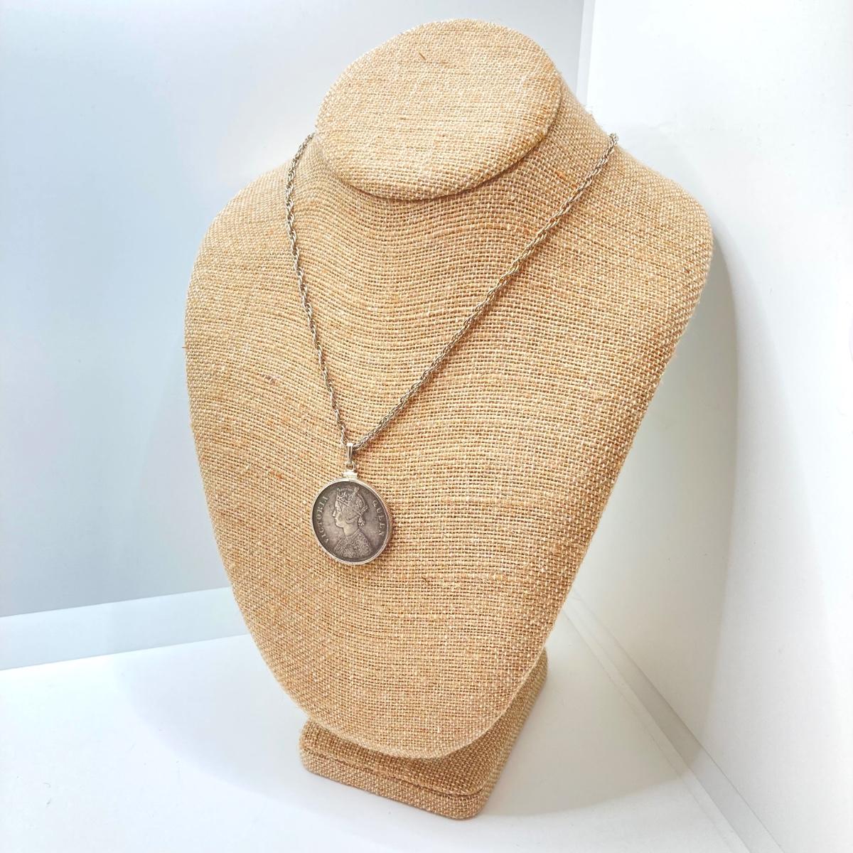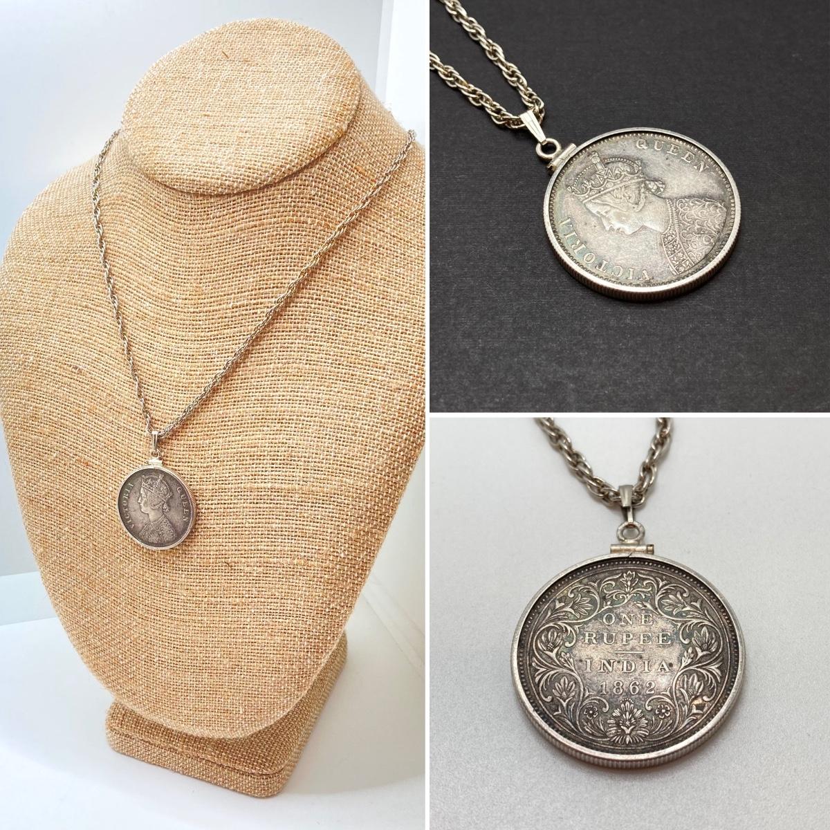 LOT 141: Vintage Pendant Necklace with British India 1862 One Rupee Silver Coin Featuring Queen Victoria