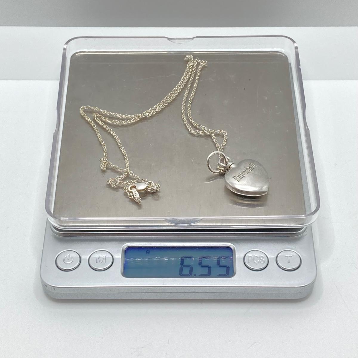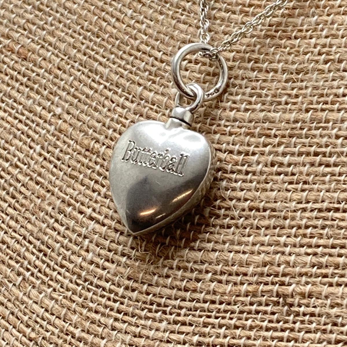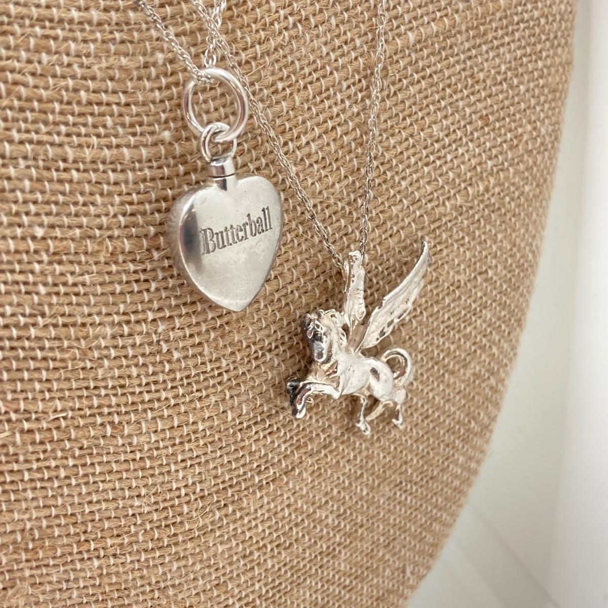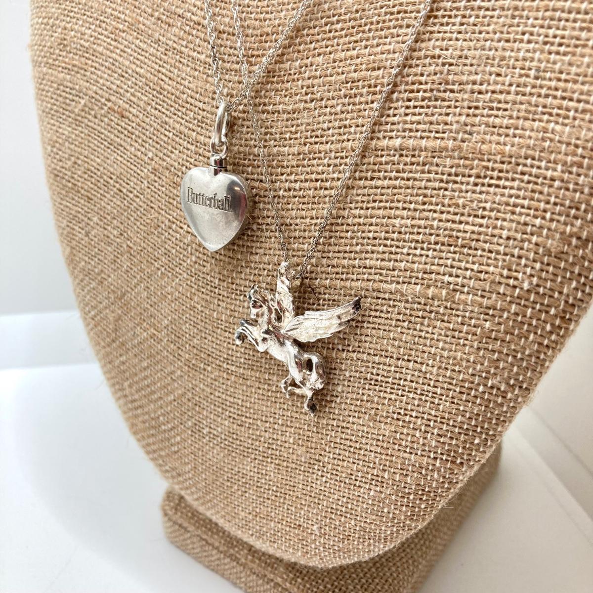 LOT 142: Sterling Silver Heart Shaped Monogrammed "Butterball" Pendant Urn Necklace and Silver Tone Pegusus Pendant with Sterling Chain