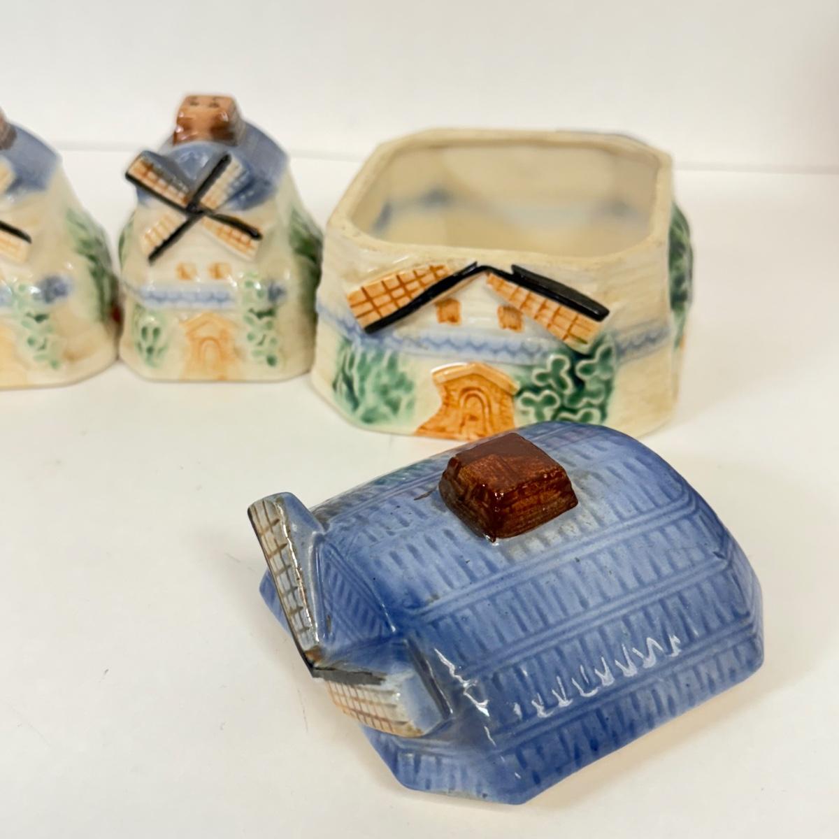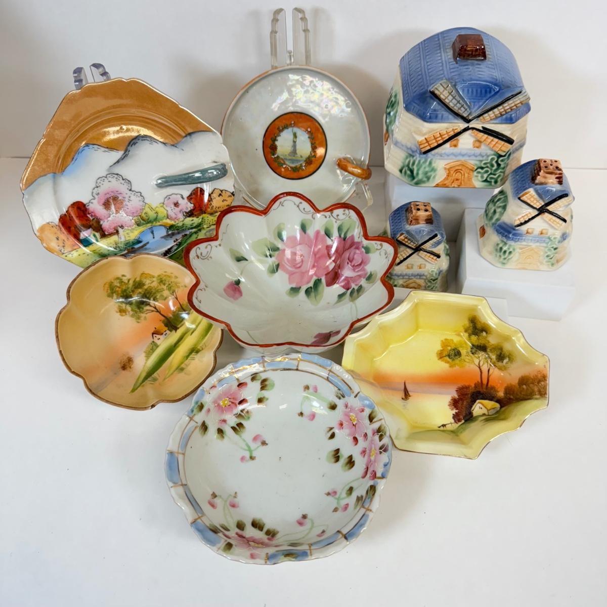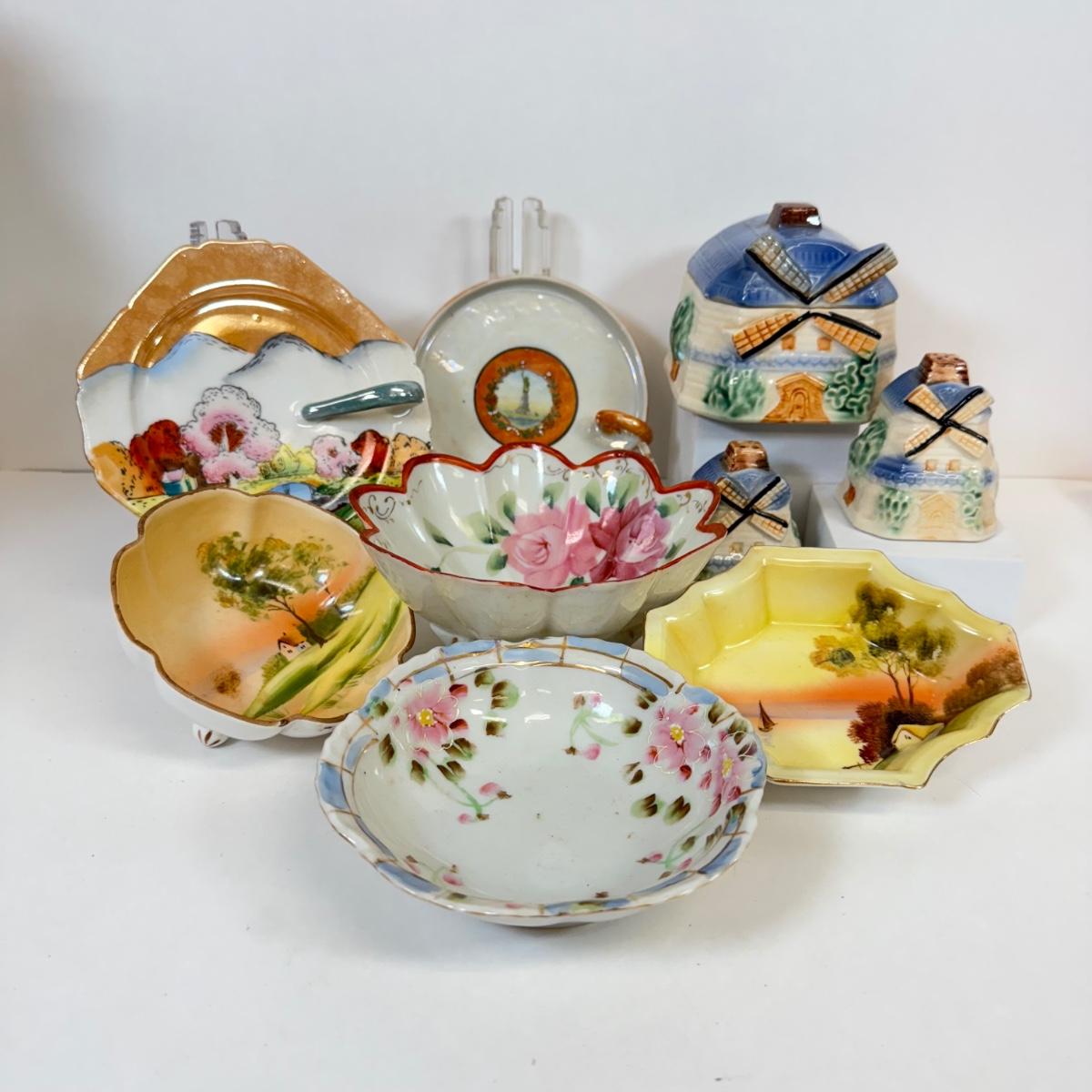 LOT 8: Hand Painted Japanese Porcelain Bowls (incl Nippon) & Windmill Sugar Bowl w/ Matching Salt & Pepper Shakers