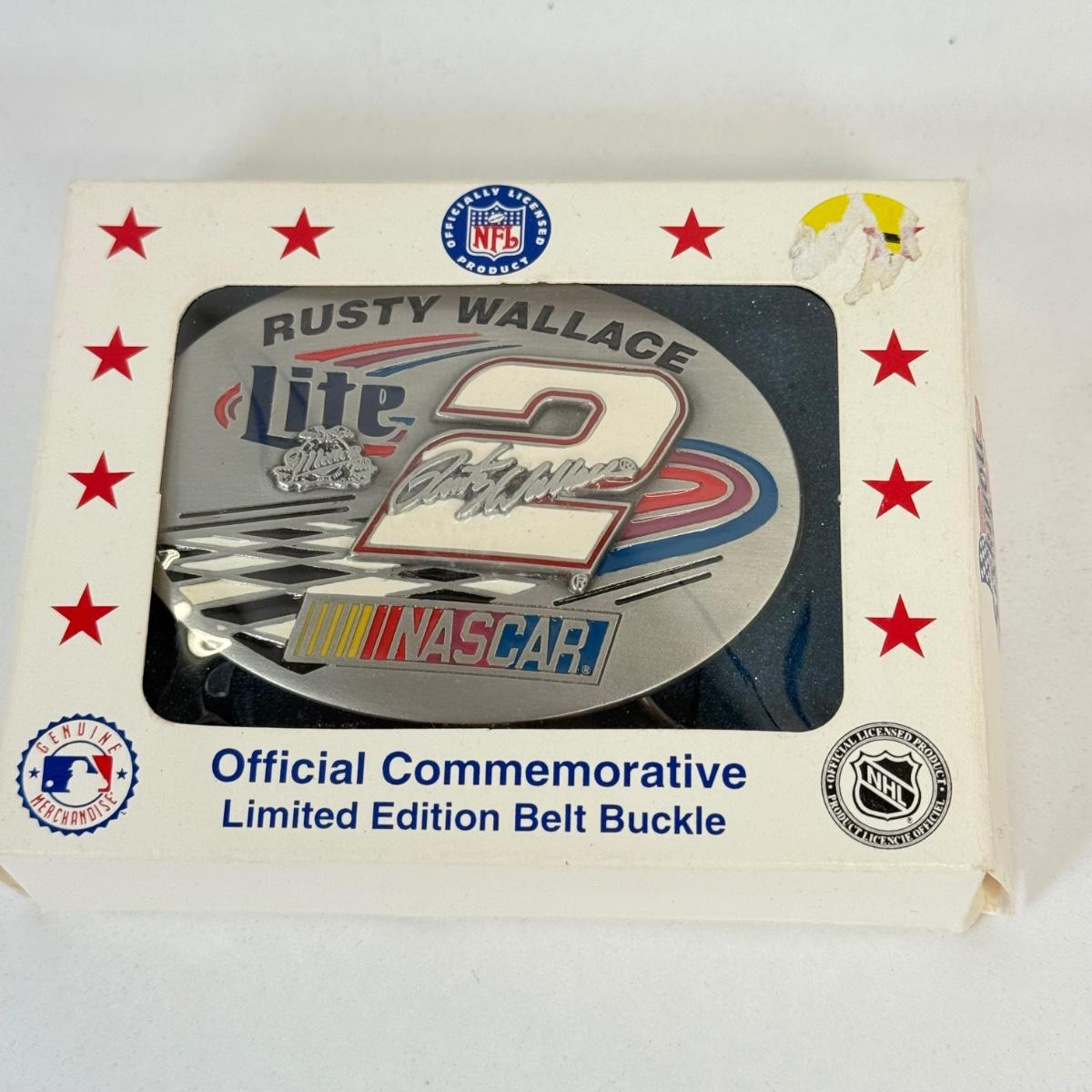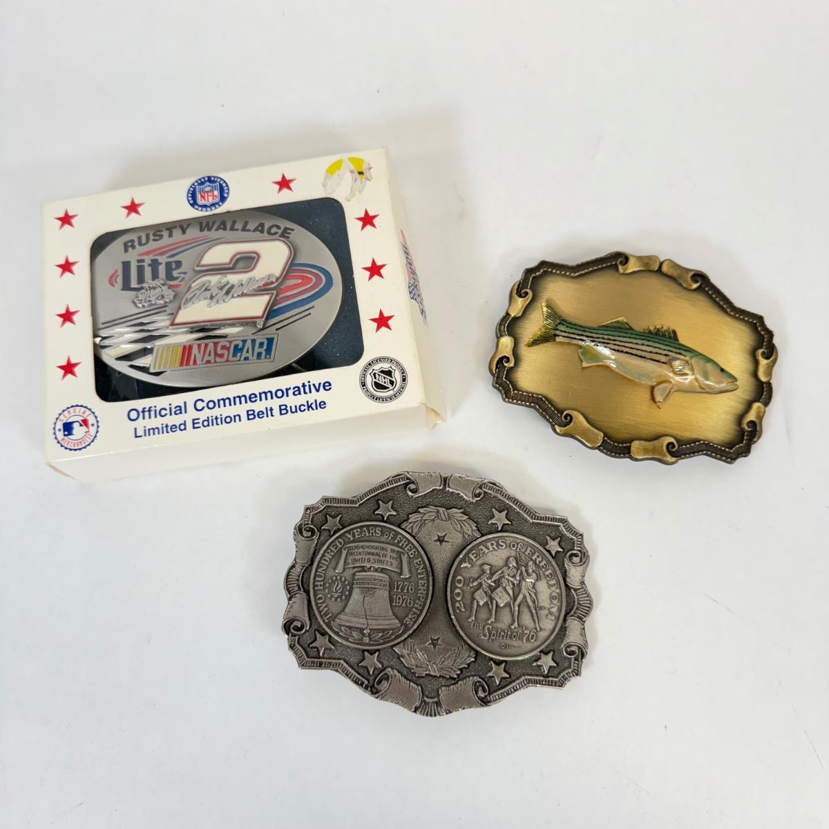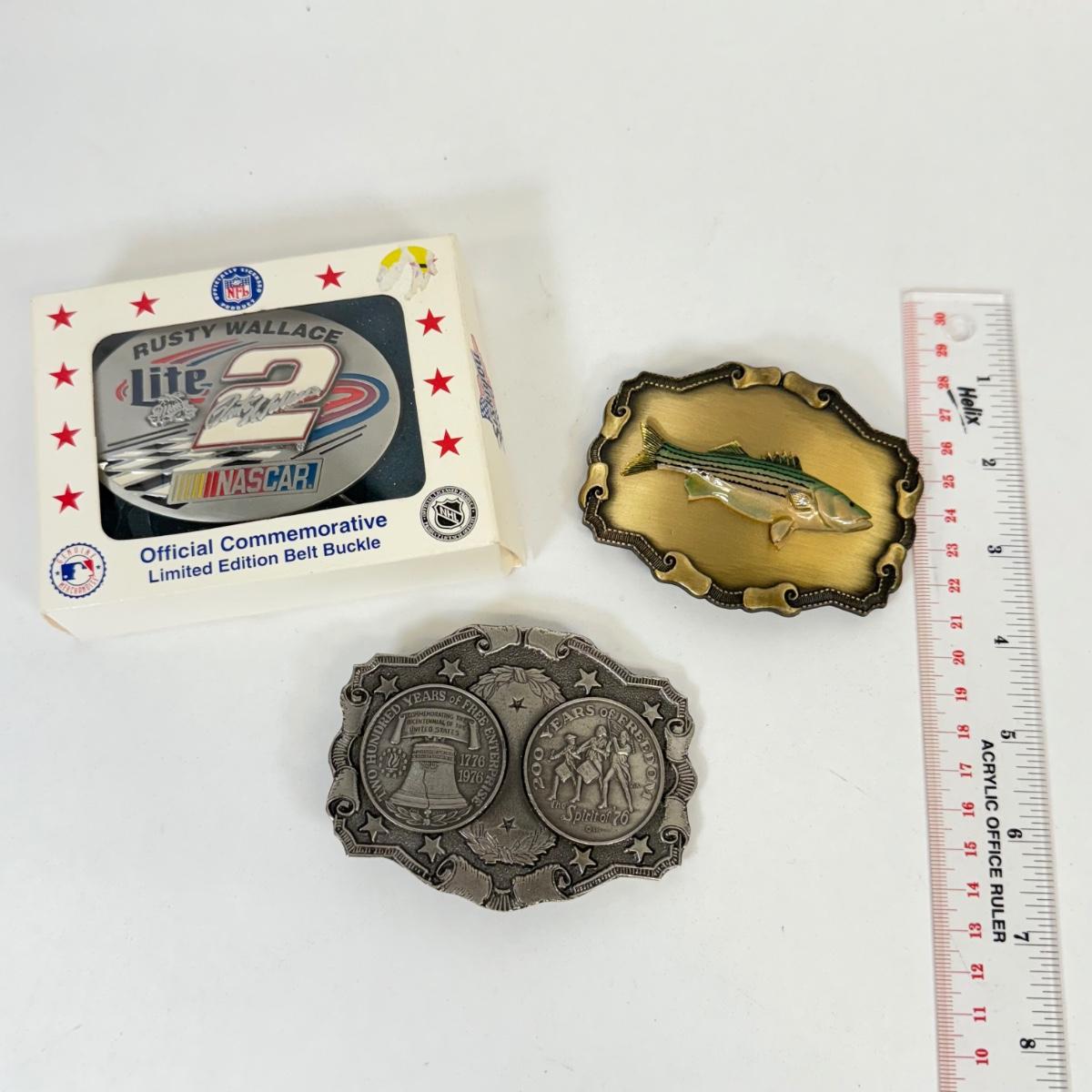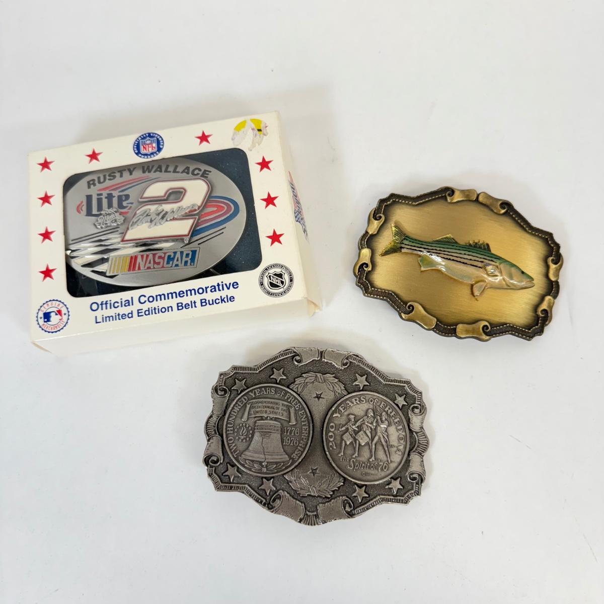 LOT 15: Belt Buckles: Rusty Wallace Miller Lite NASCAR in Box, Brass Bass & Liberty Bell