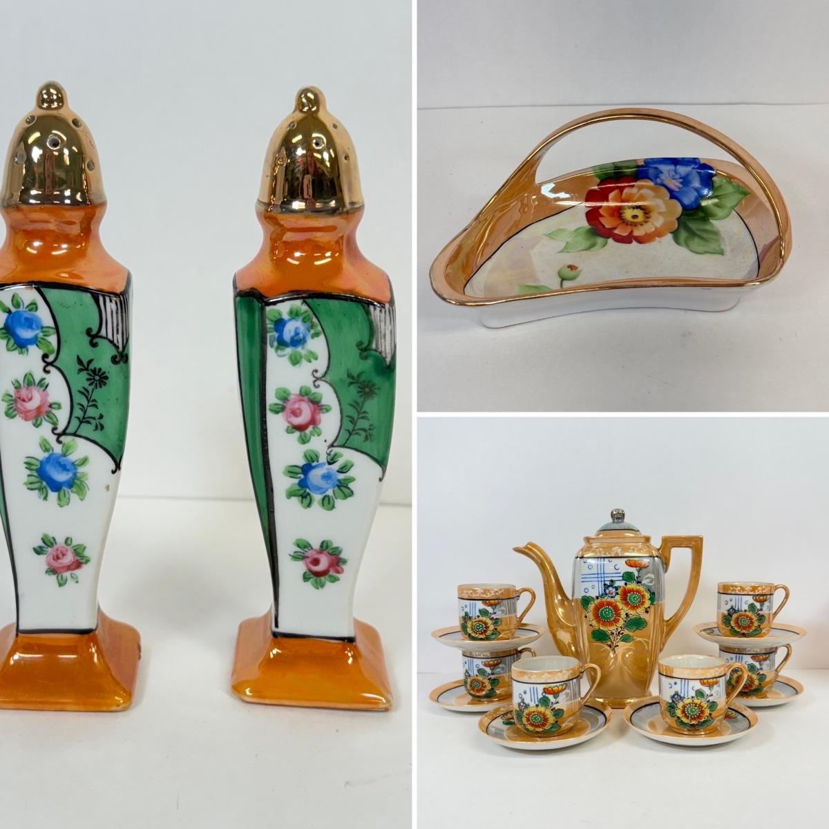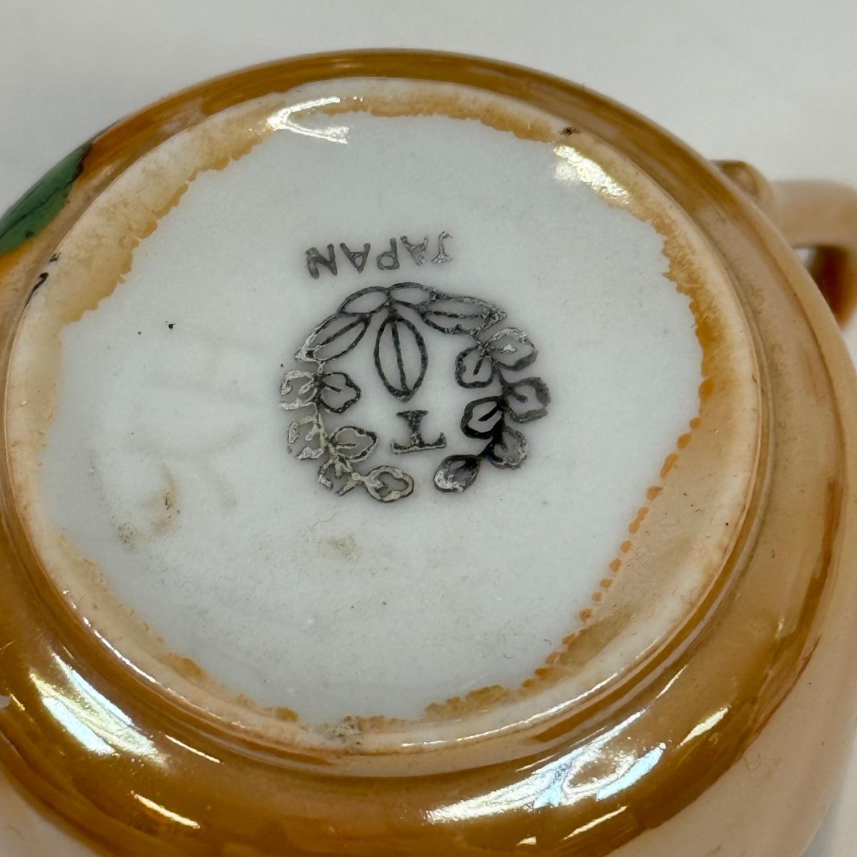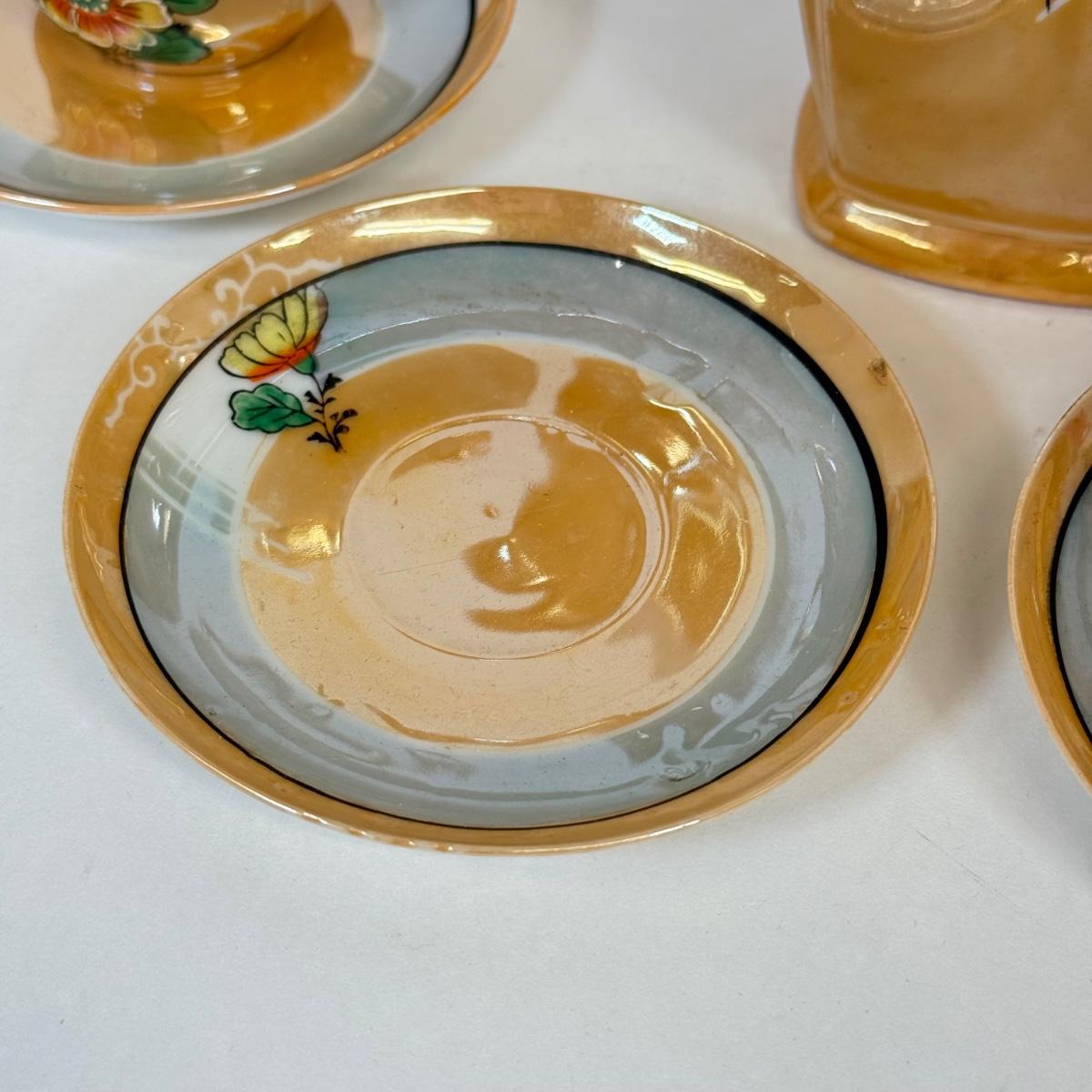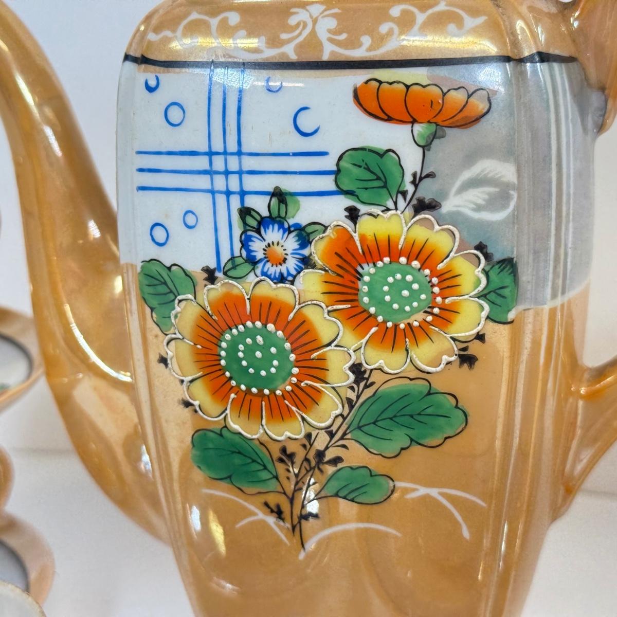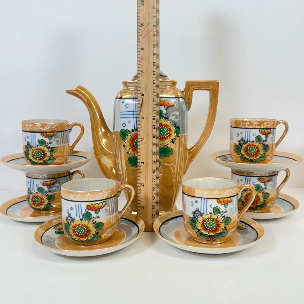 LOT 18: Beautiful Orange Japanese Lusterware Hot Chocolate Pot w/ 6 Matching Mugs and Saucers