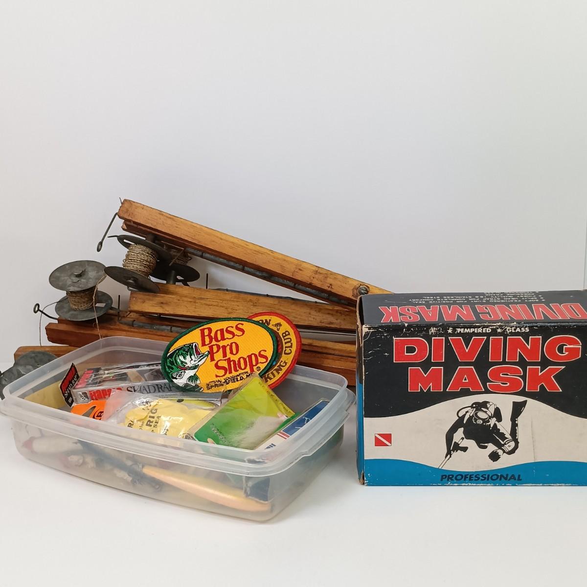 LOT 28: Vintage Ice Fishing Tip Ups with NIB Pantoskope Diving Mask, Fishing Lures & More
