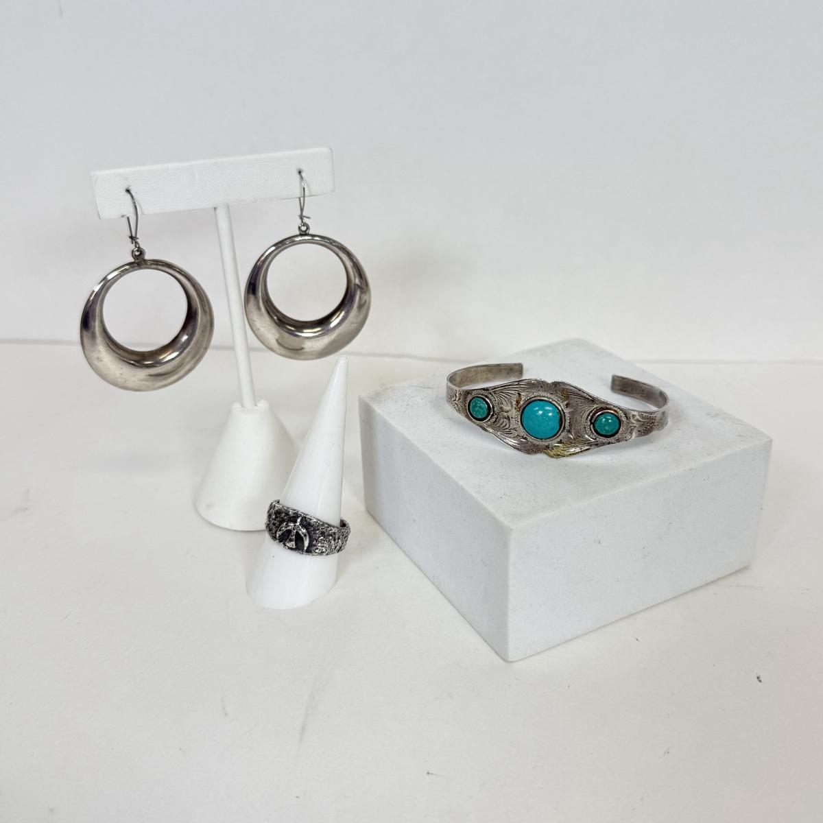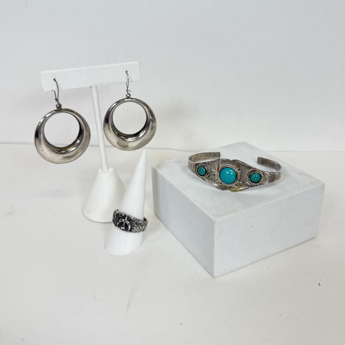 LOT 140: Vintage Sterling & Turquoise Cuff Bracelet, 925 Earrings Made in Mexico & Sterling Silver Braided Ring (28.0g)
