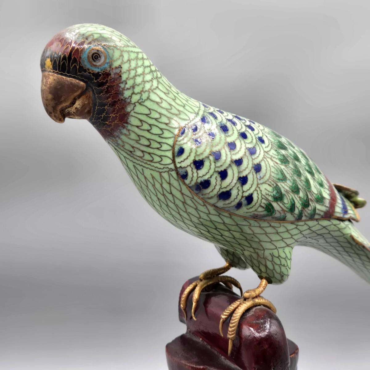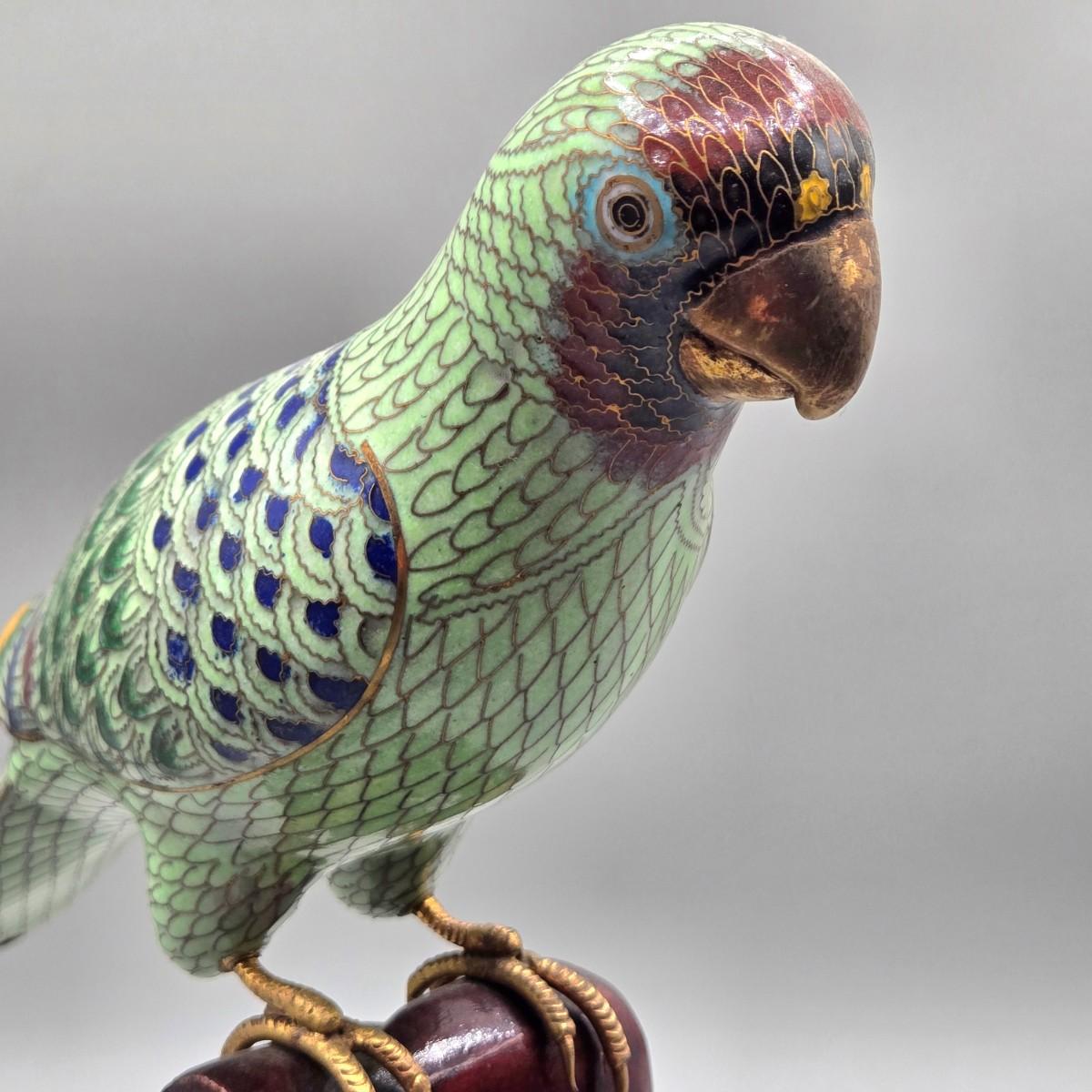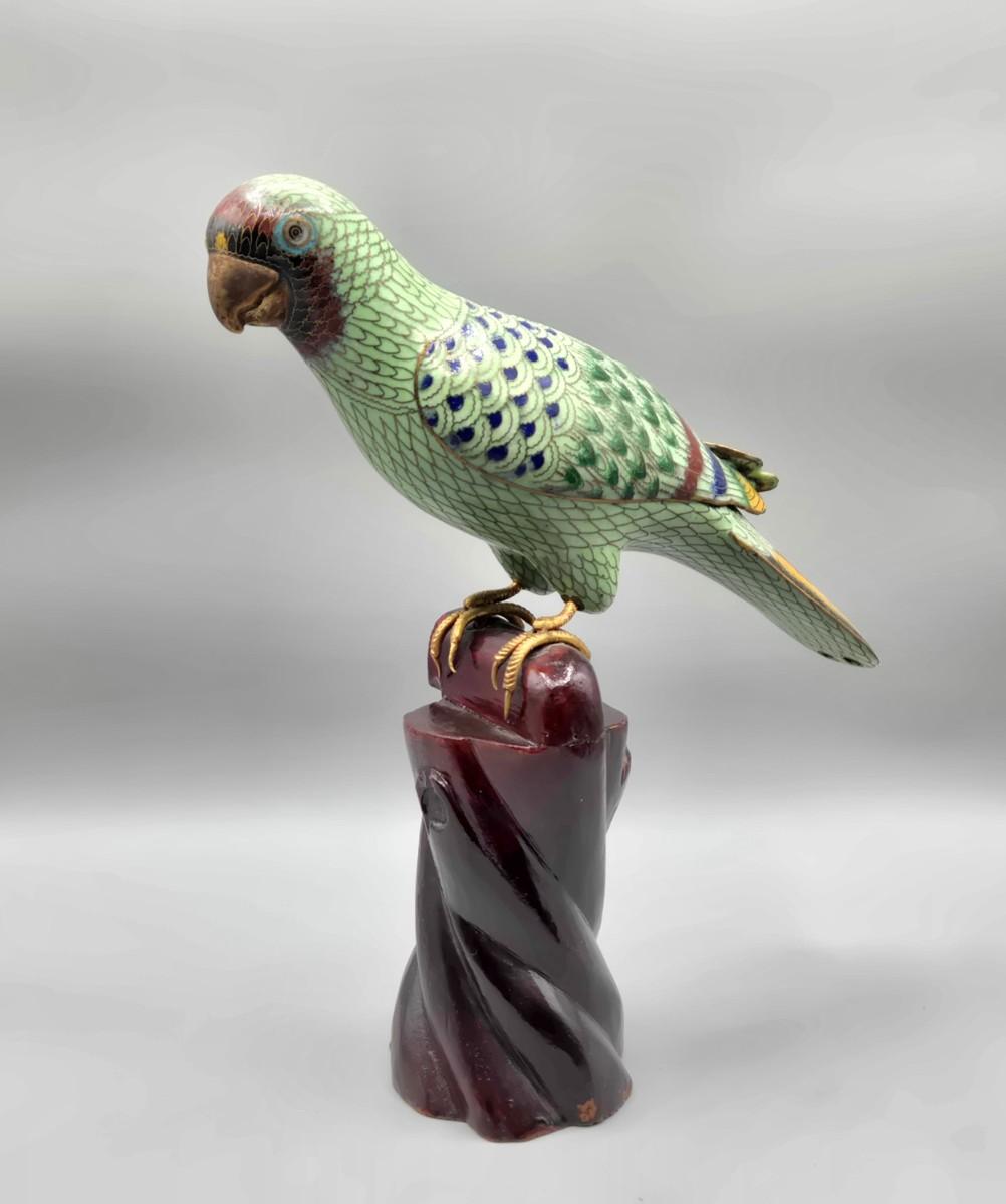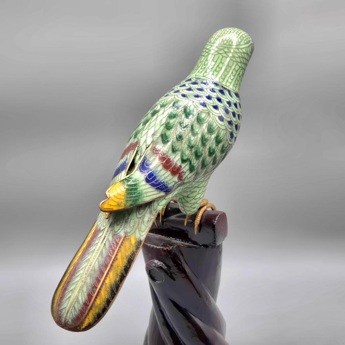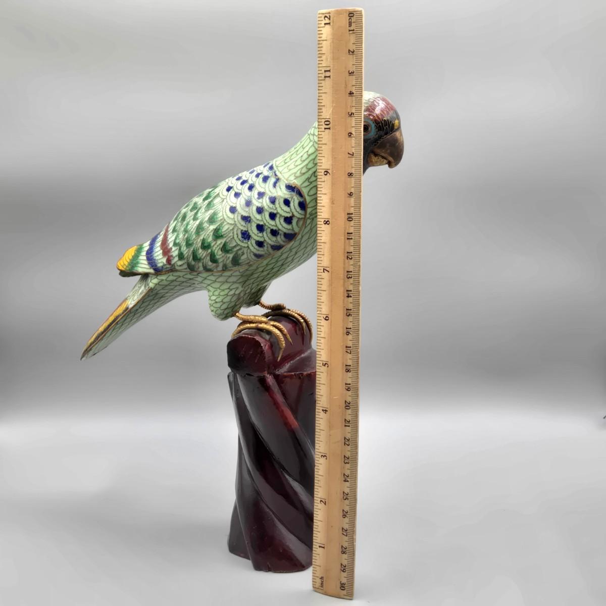 LOT 4L: Vintage Cloisonné Parrot Figurine on a Wooden Perch