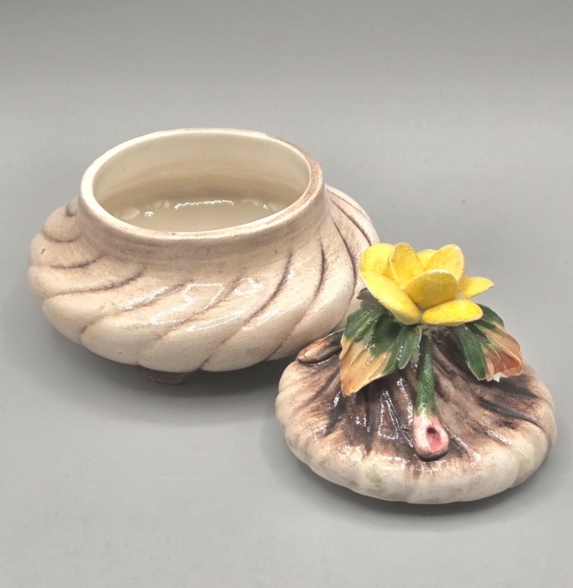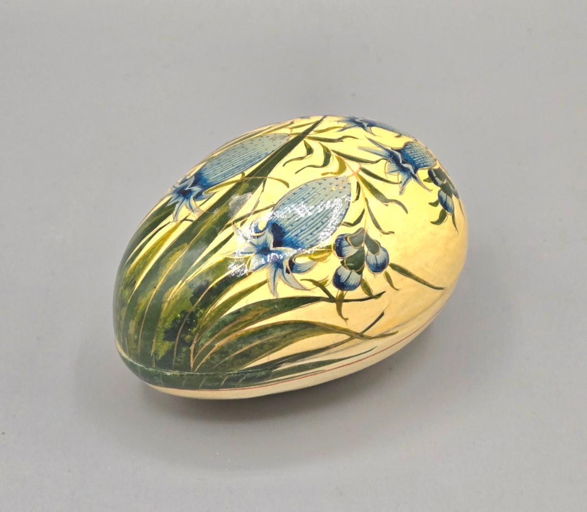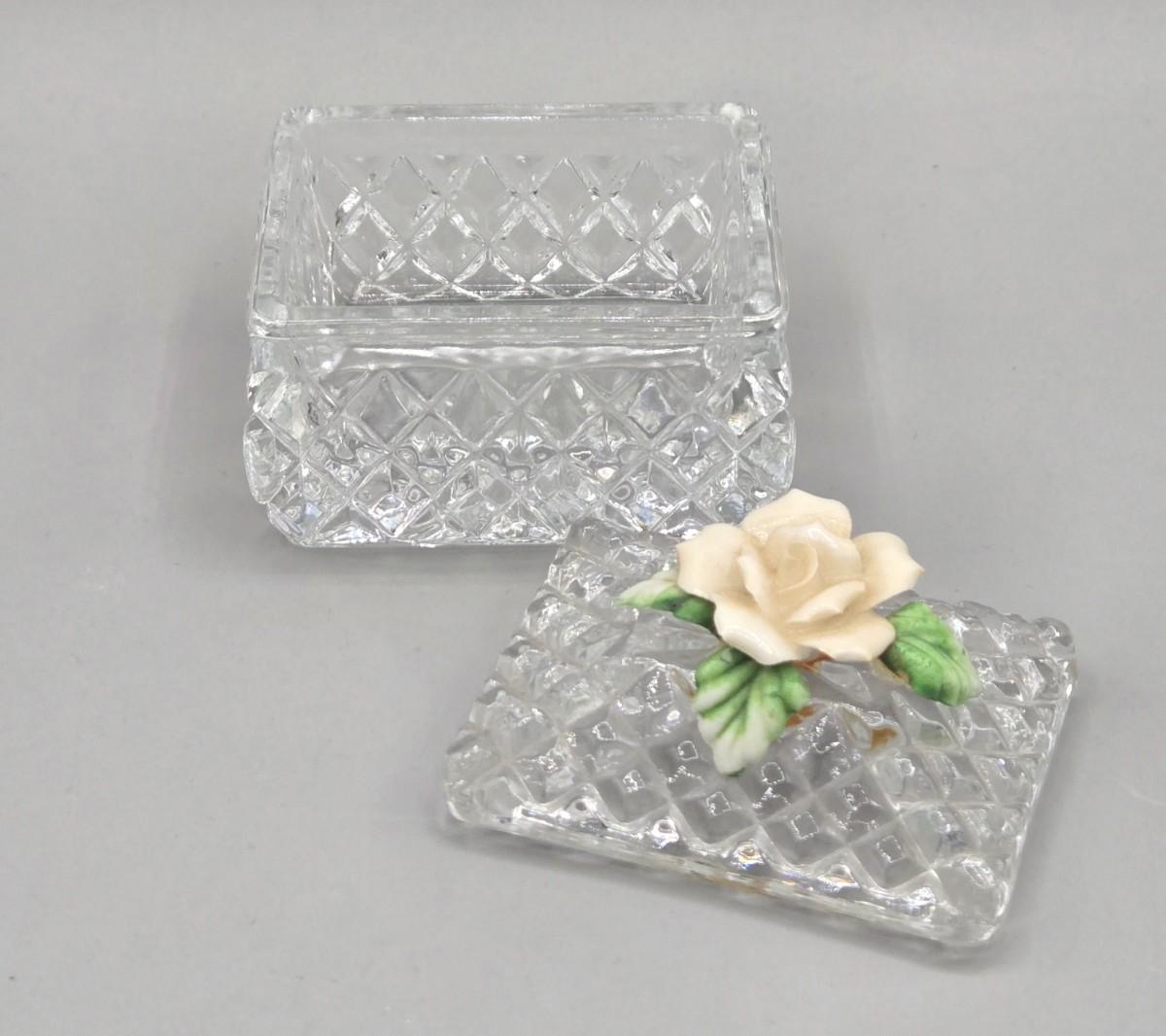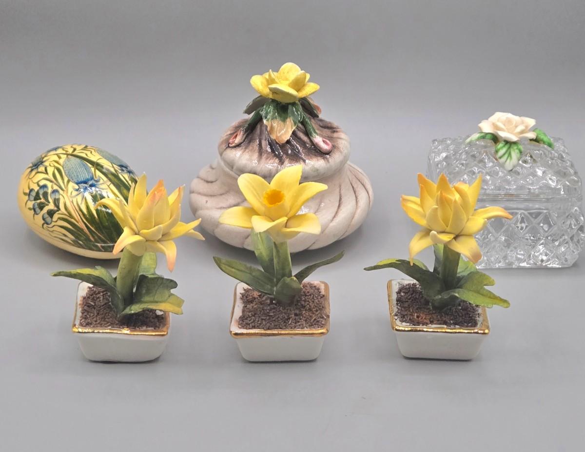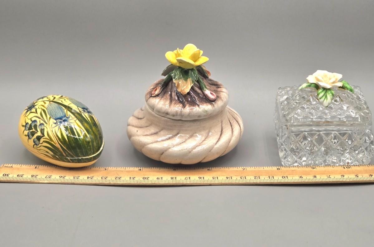 LOT 16L: Floral Egg Shaped Hand Painted Paper Mache Lacquered Trinket Box, Crystal Trinket Box, Porcelain Trinket Box, and Three Miniature Porcelain Flowers