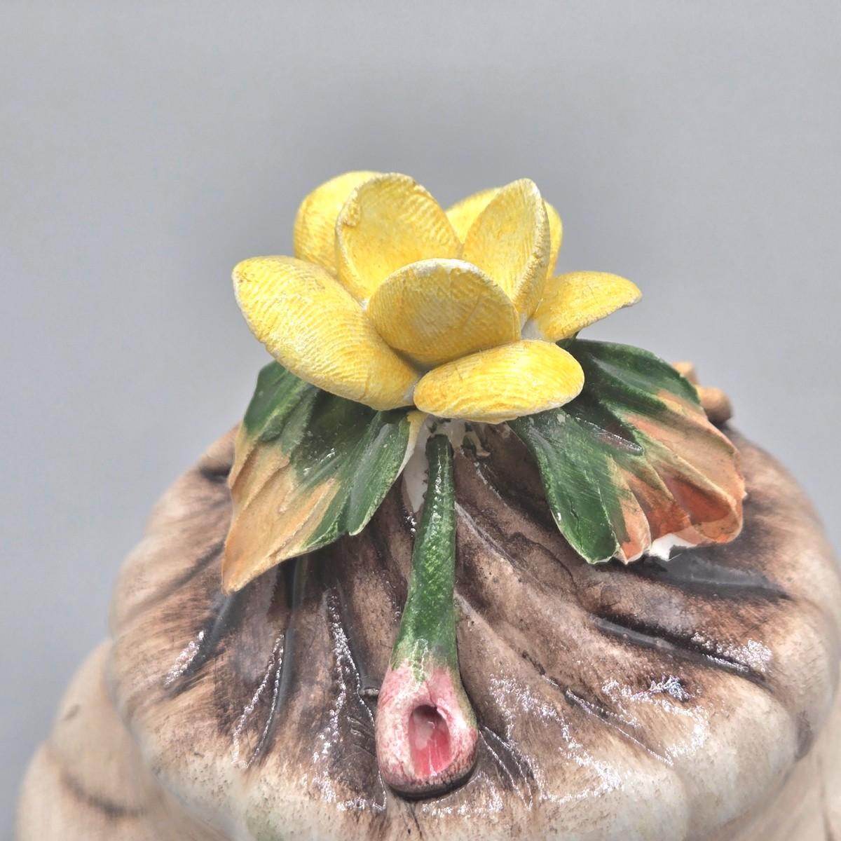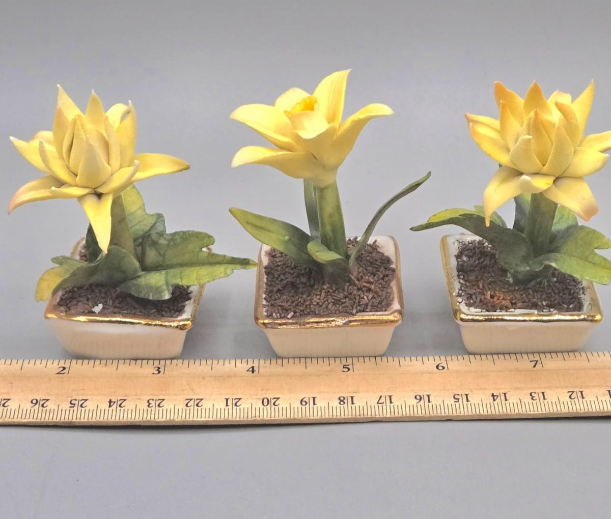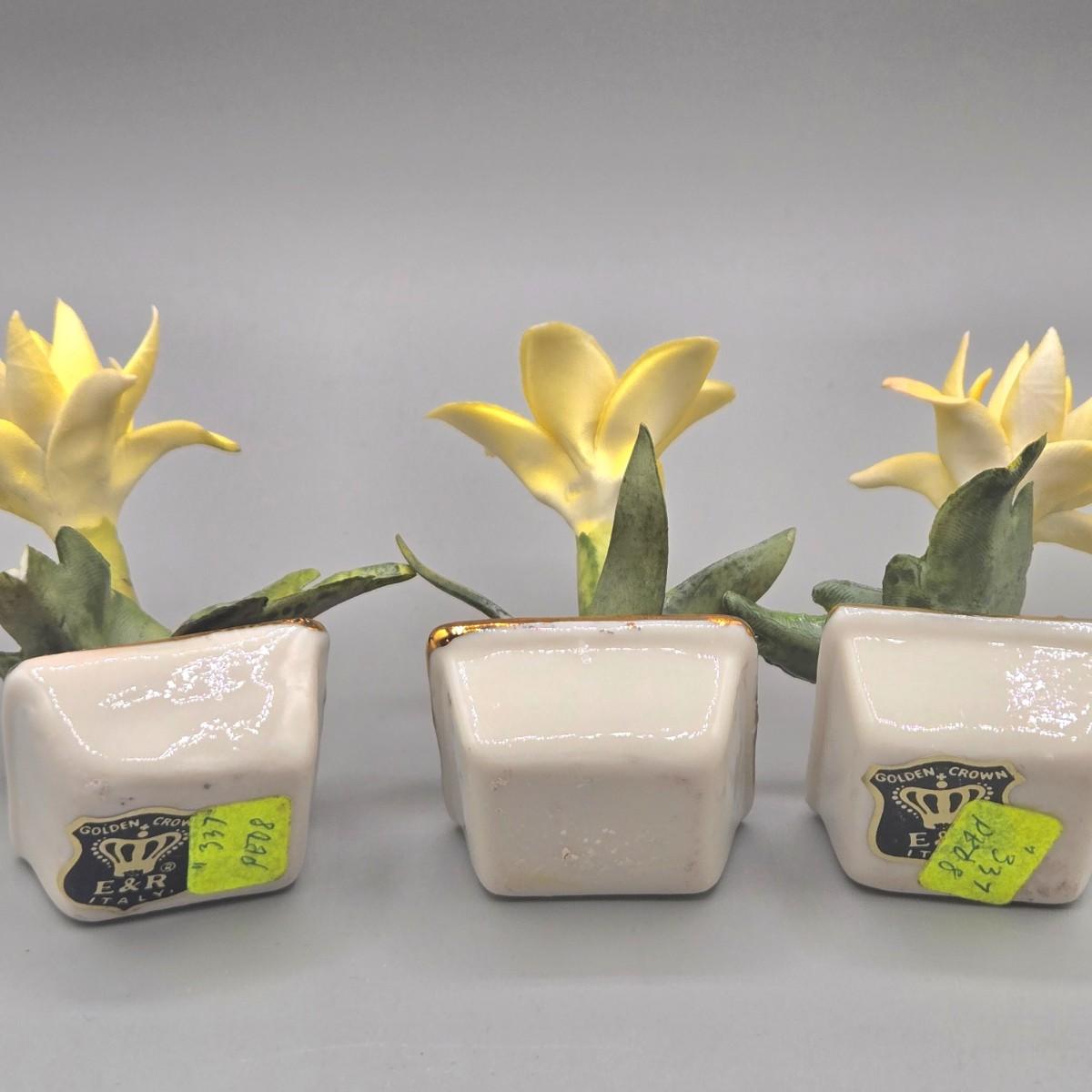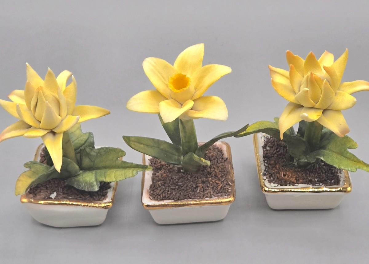 LOT 16L: Floral Egg Shaped Hand Painted Paper Mache Lacquered Trinket Box, Crystal Trinket Box, Porcelain Trinket Box, and Three Miniature Porcelain Flowers