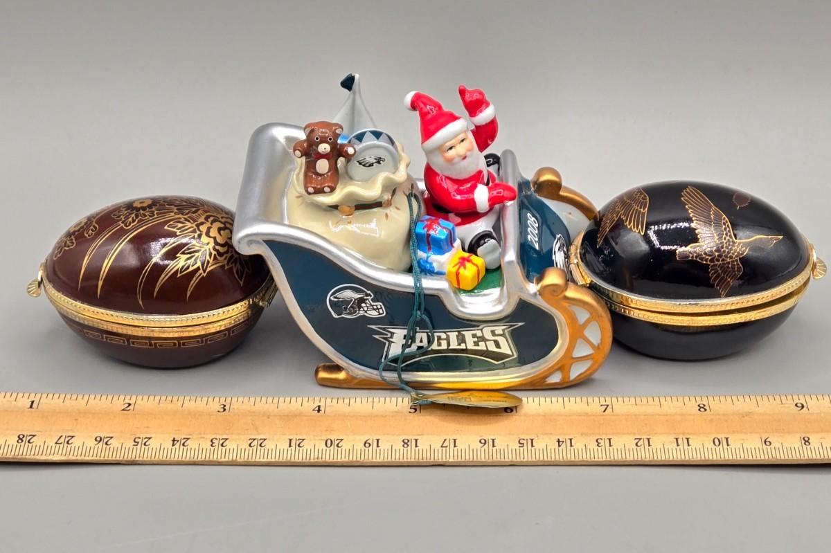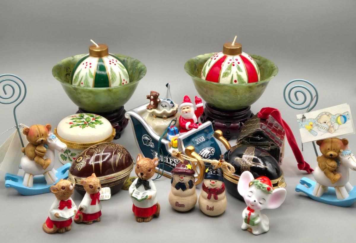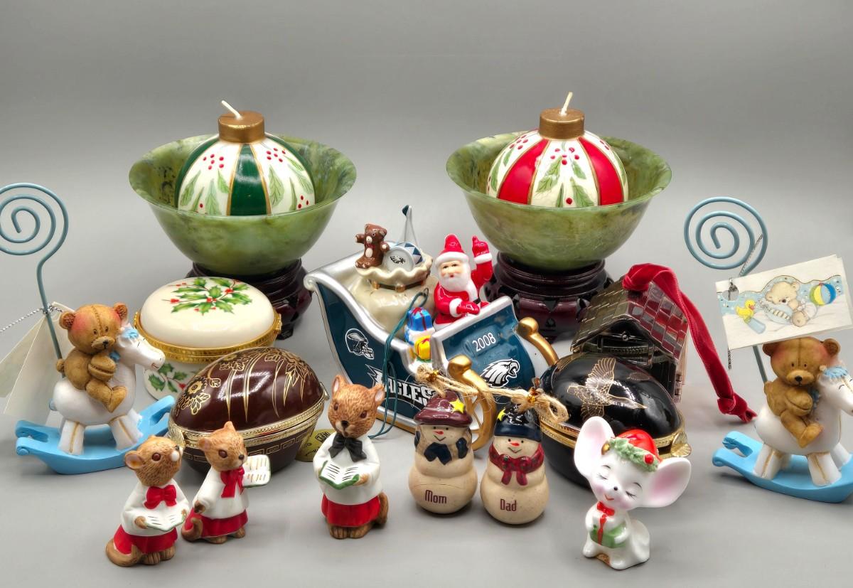 LOT 38L: Lenox Holly Berry Trinket Box, 2008 Danbury Mint Philadelphia Eagles Santa in a Sleigh Ornament, Vintage Napcoware Christmas Mouse Figurine, and More