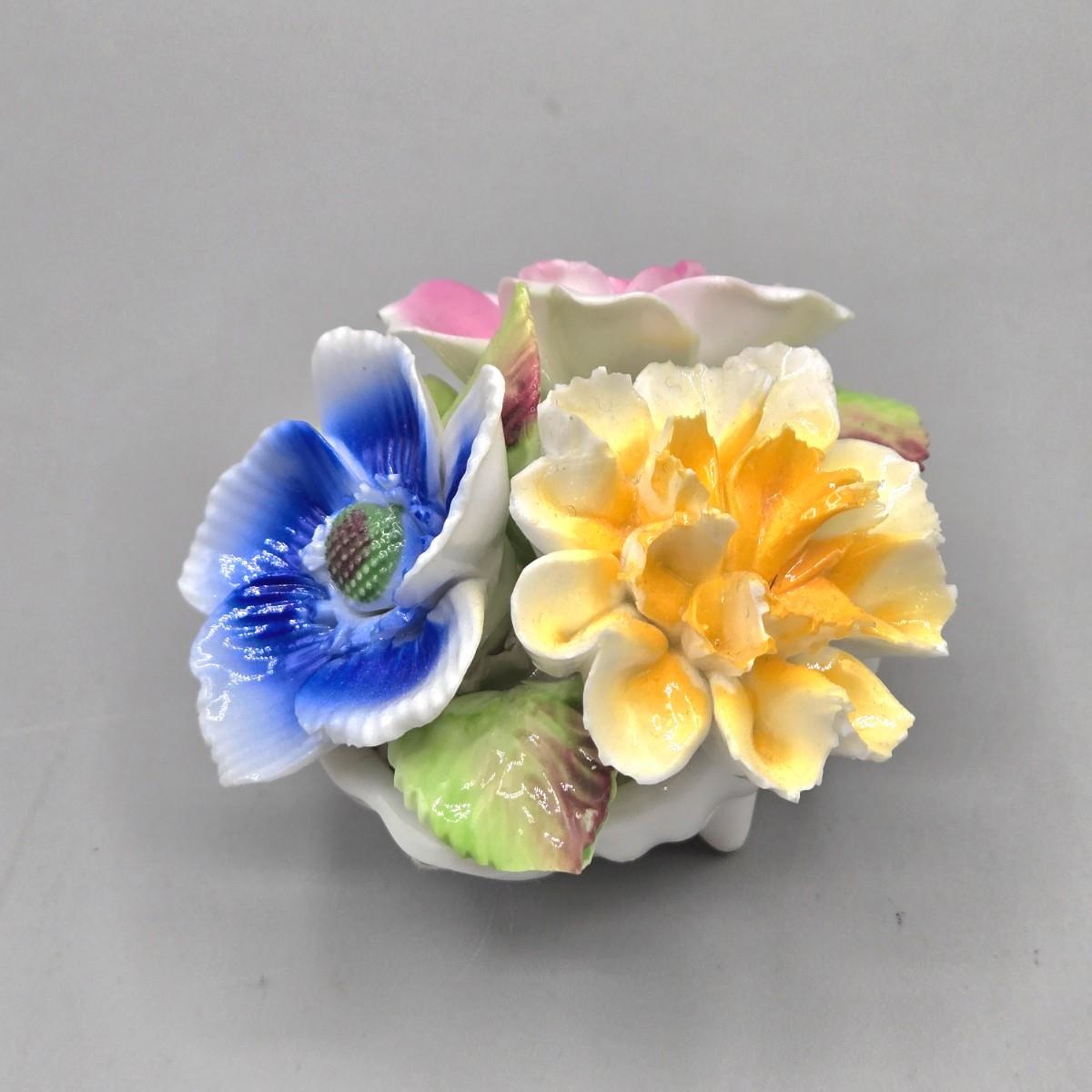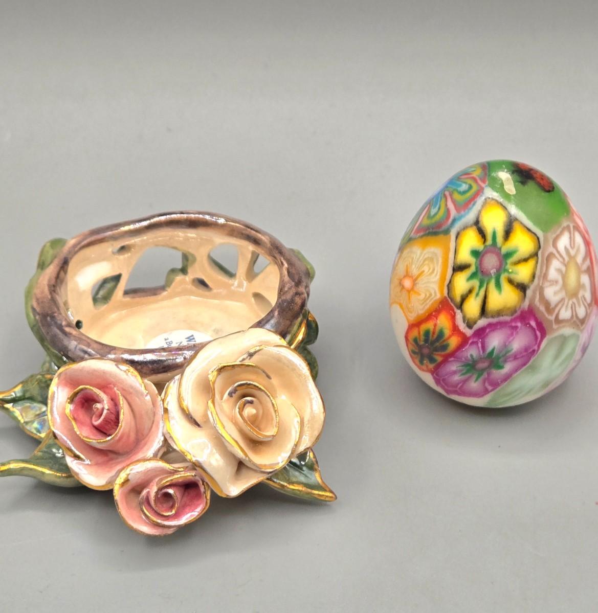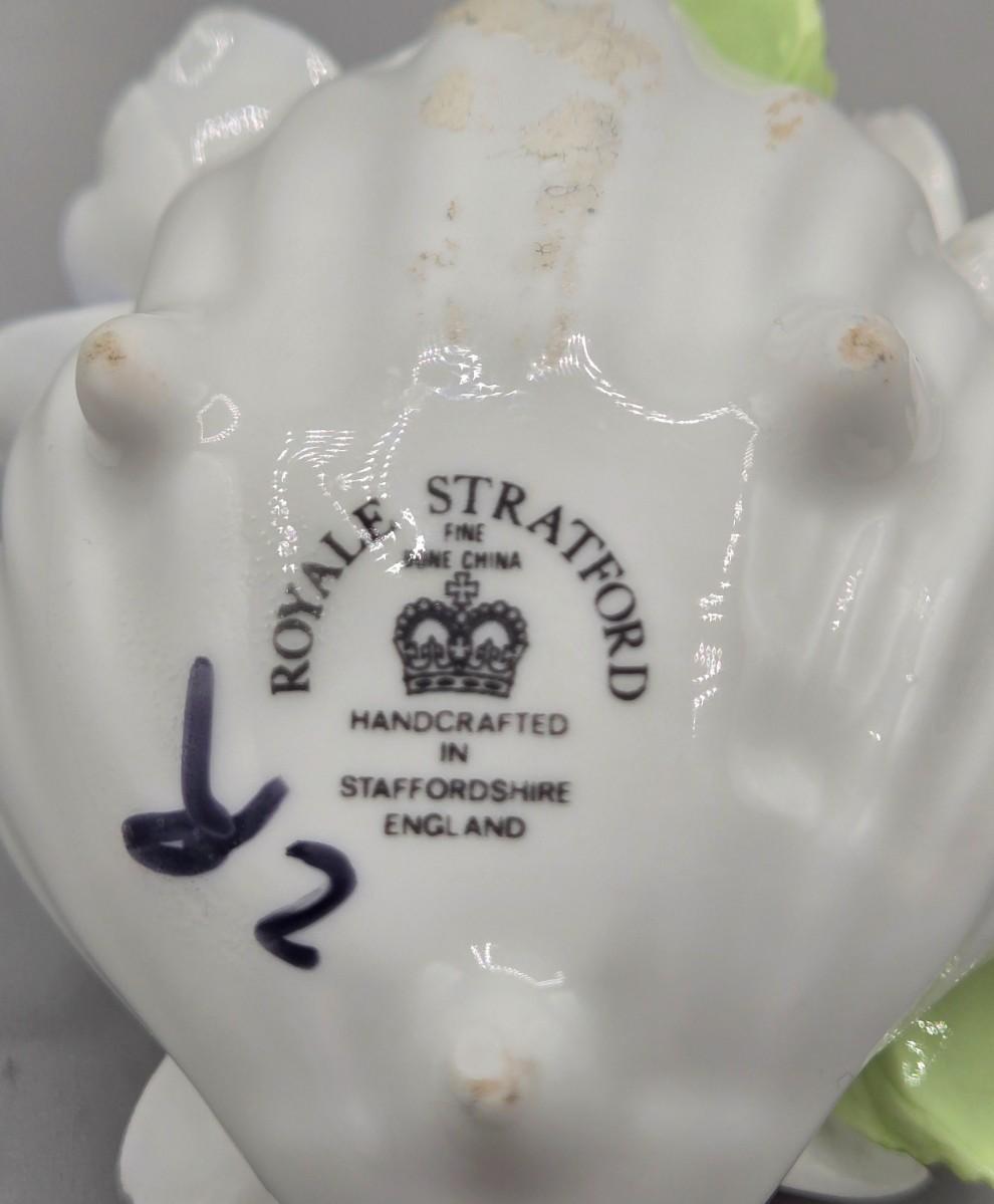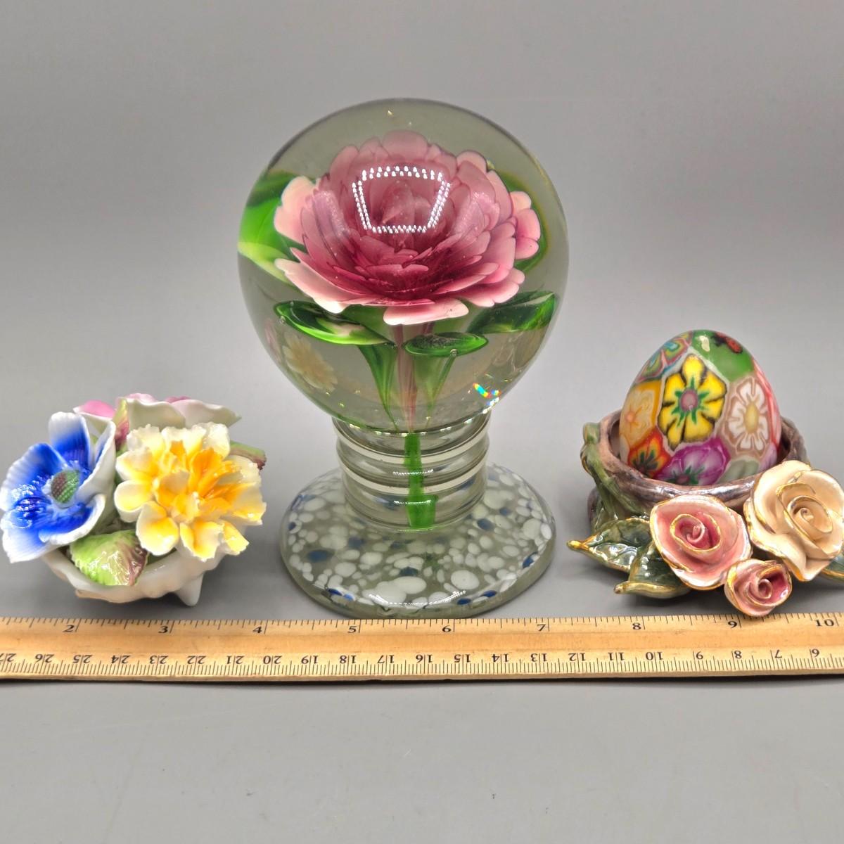 LOT 91L: Vintage Art Glass Rose Paperweight, Royale Stratford Handcrafted Porcelain Flower Bouquet Vase, Vintage Cloisonné Enamel Bell, and More