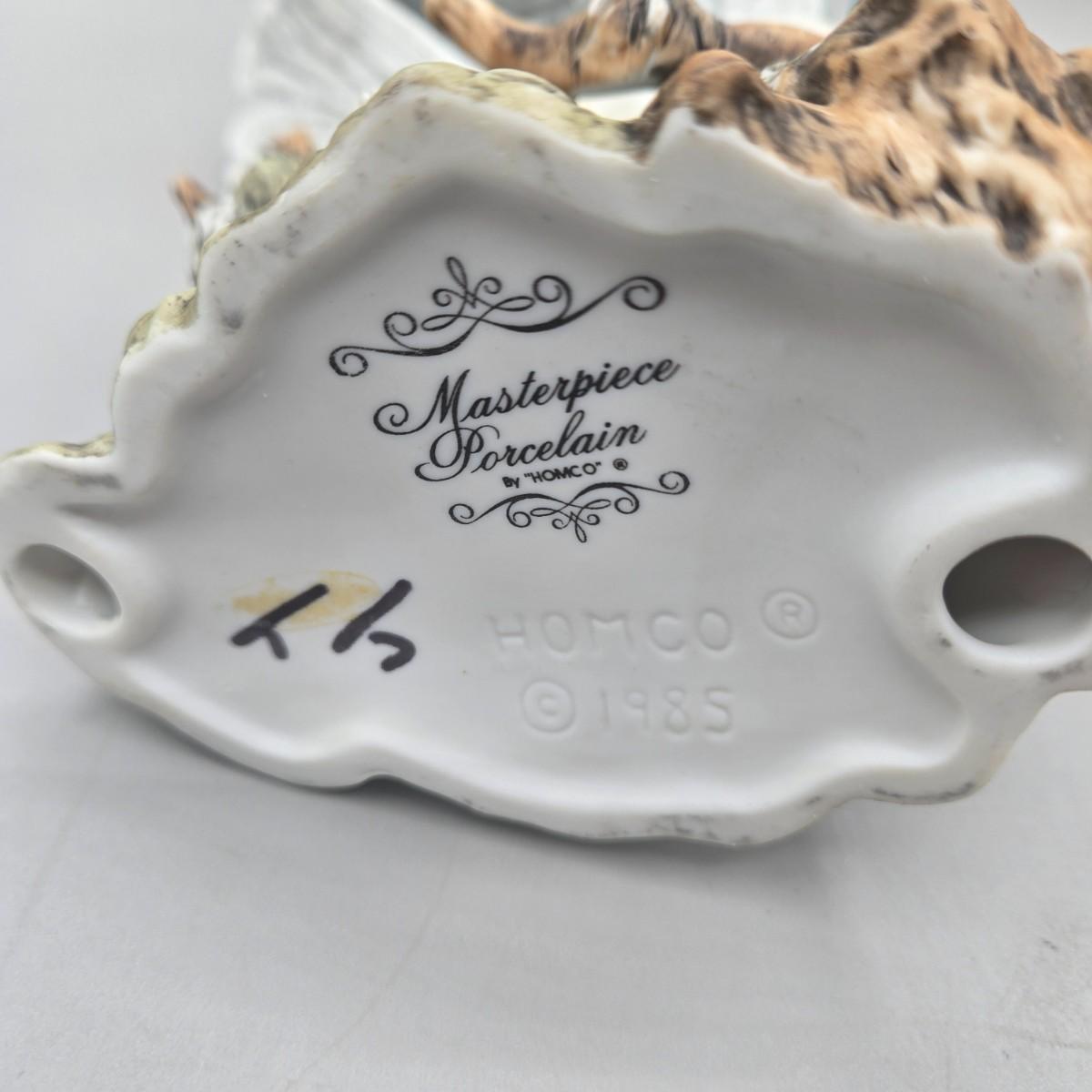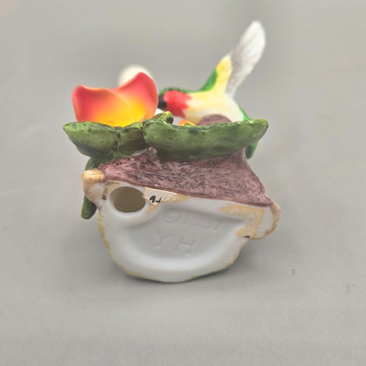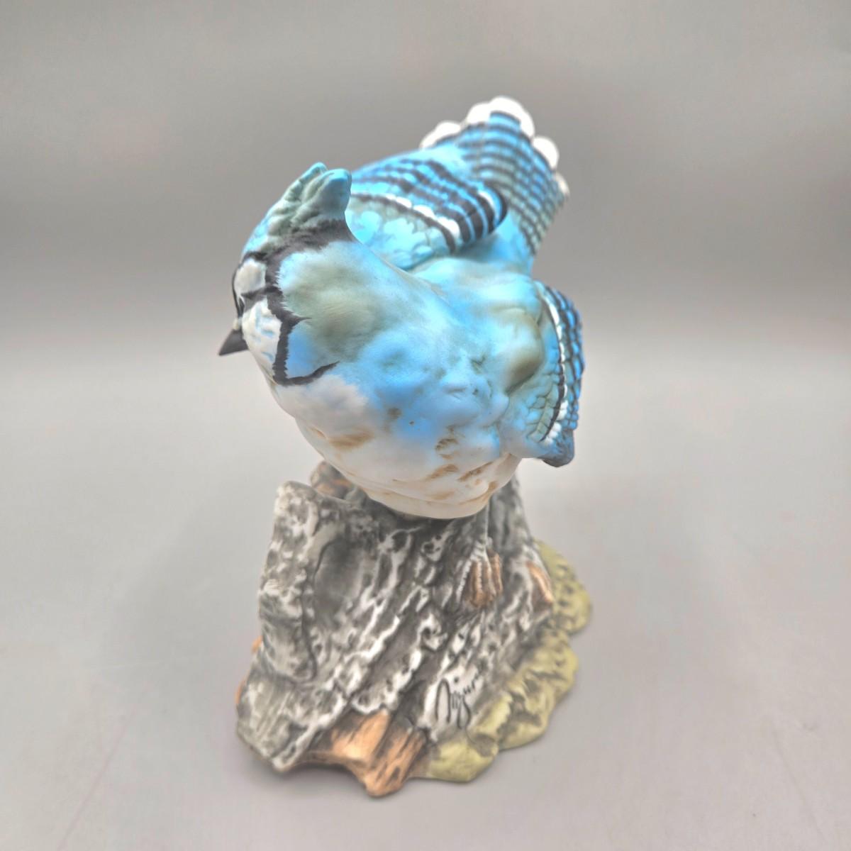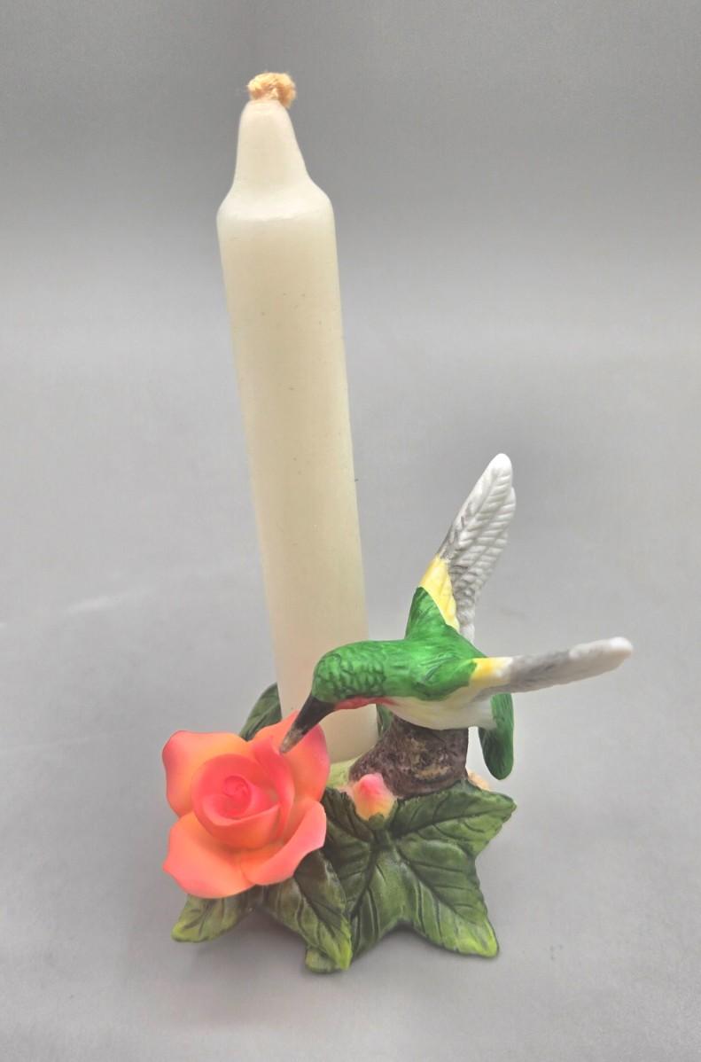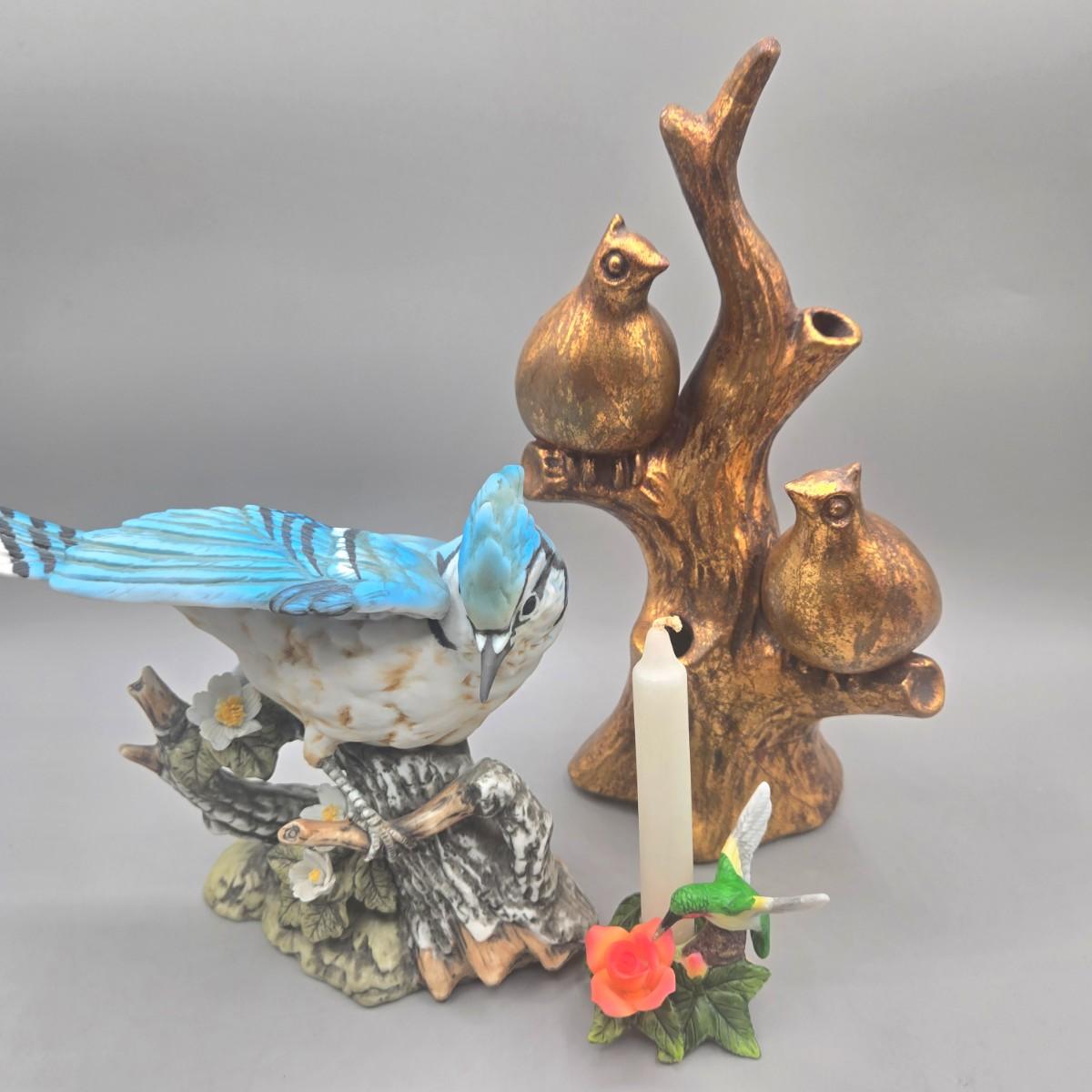 LOT 93L: Homco Masterpiece Blue Jay Figurine, California Pottery 2 Birds On Tree Gold Leaf Statue Vase, and Small Hummingbird Candle Holder