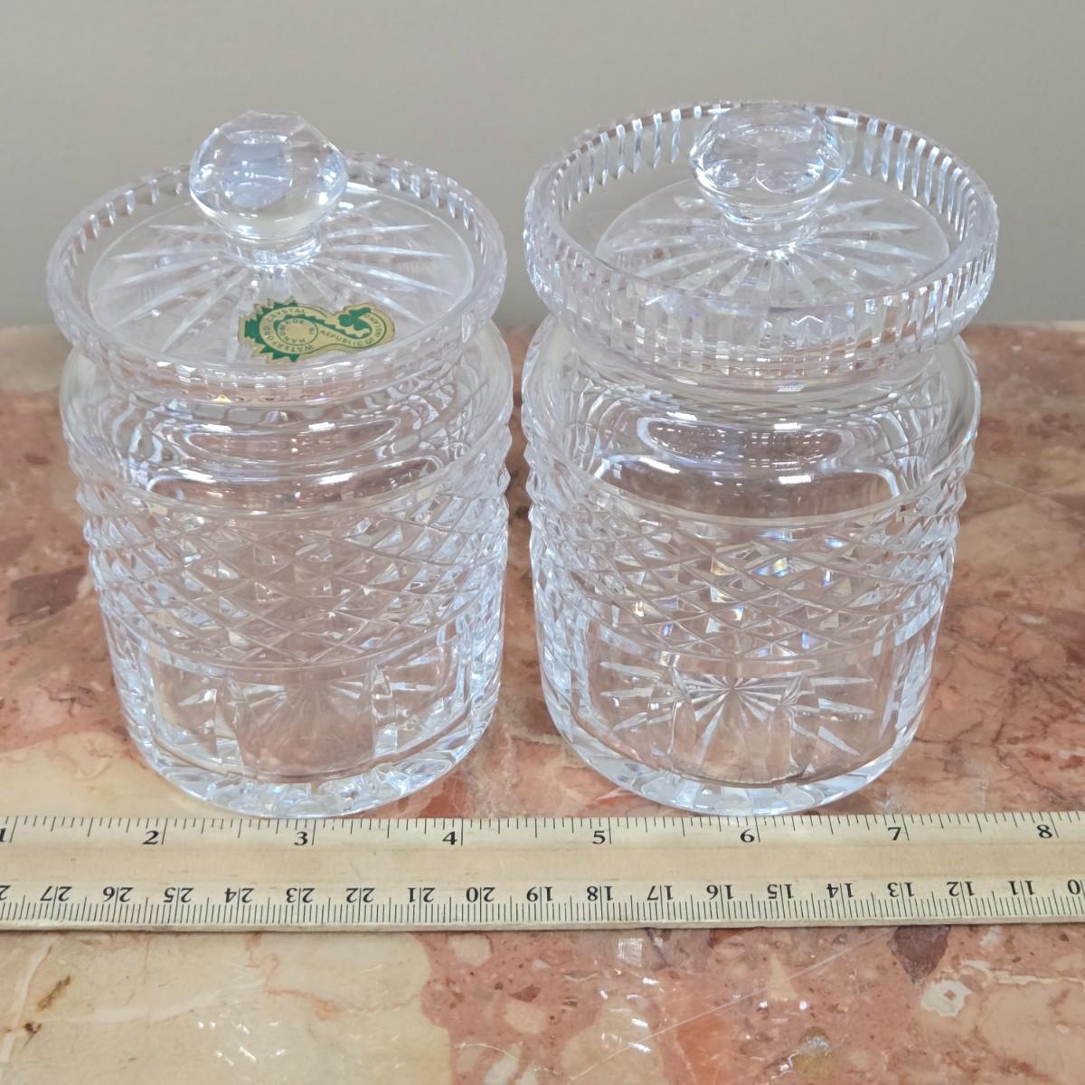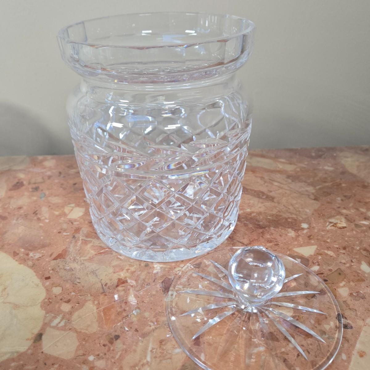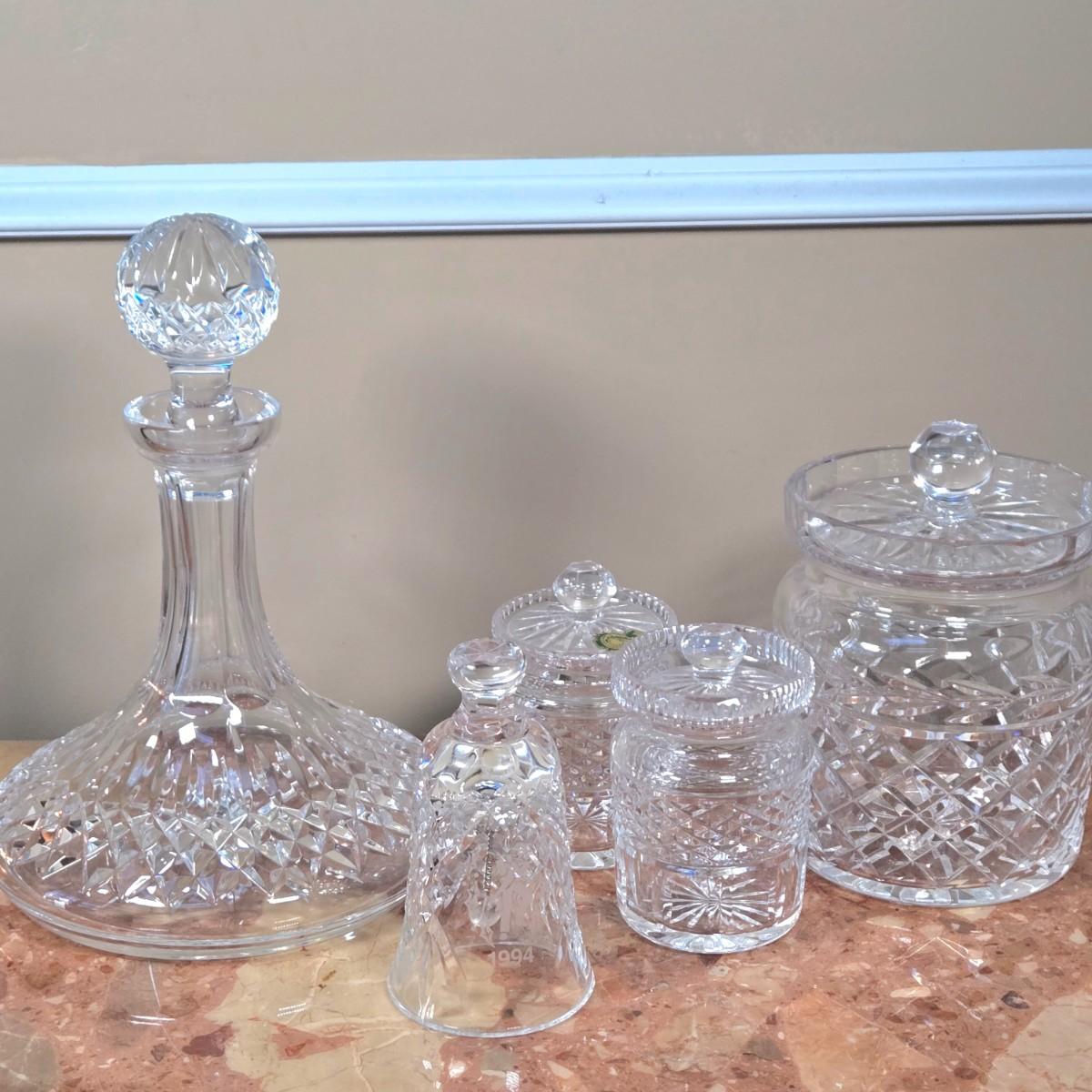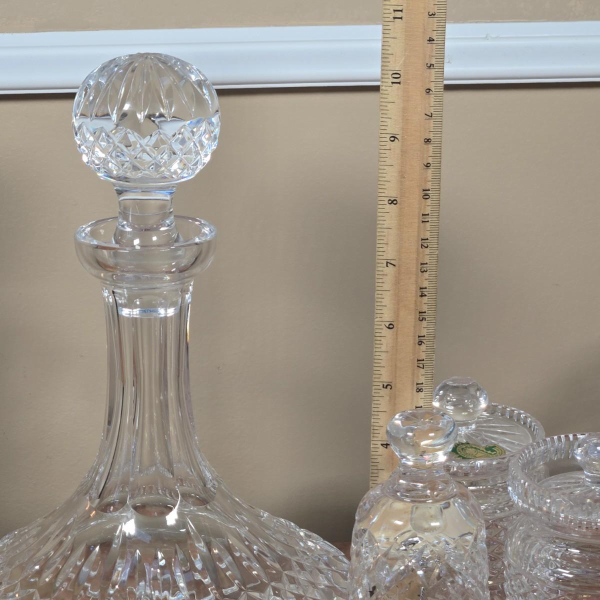 LOT 108D: Waterford Crystal Captain's Ship Decanter, Jam & Jelly Jars, Biscuit Barrel, and Bell