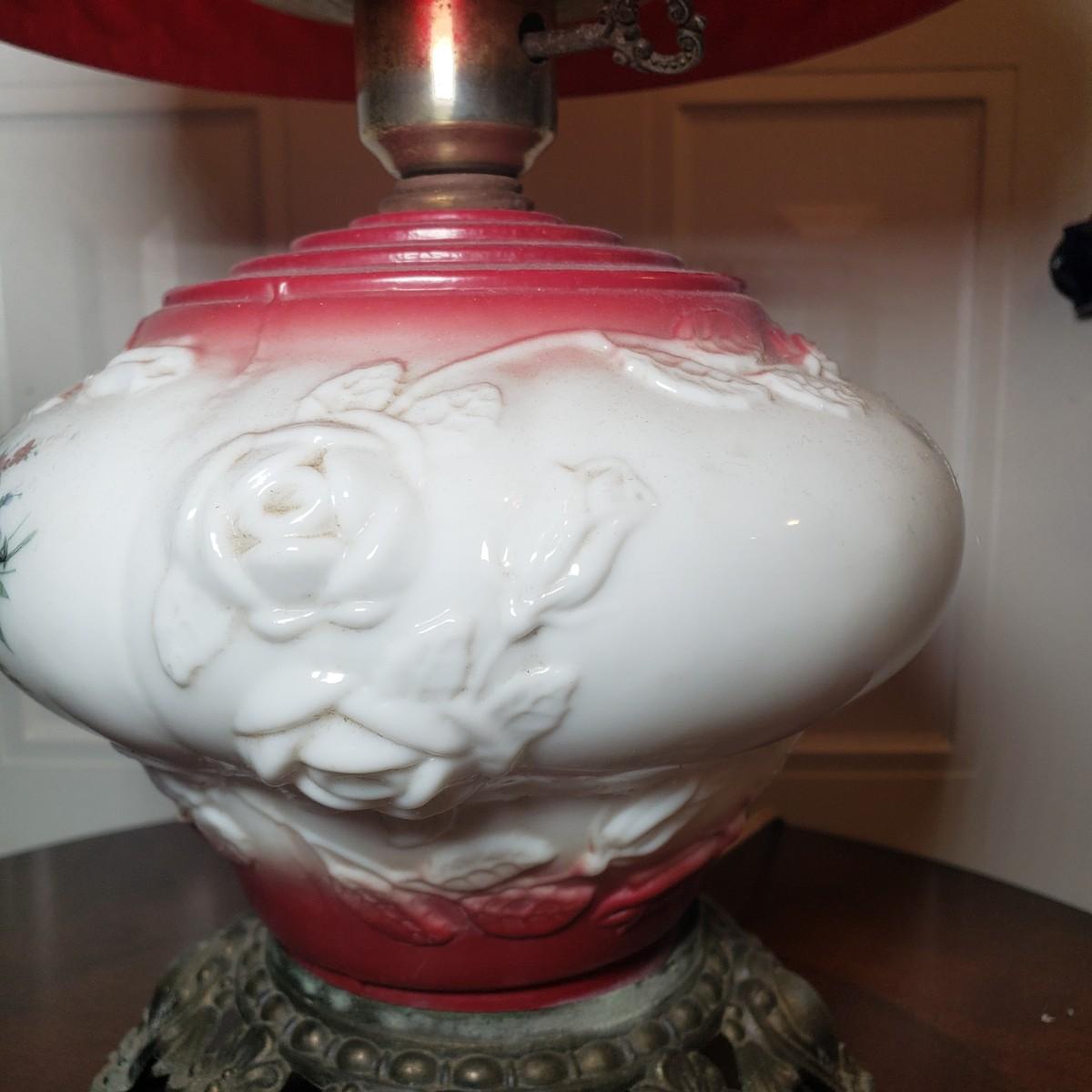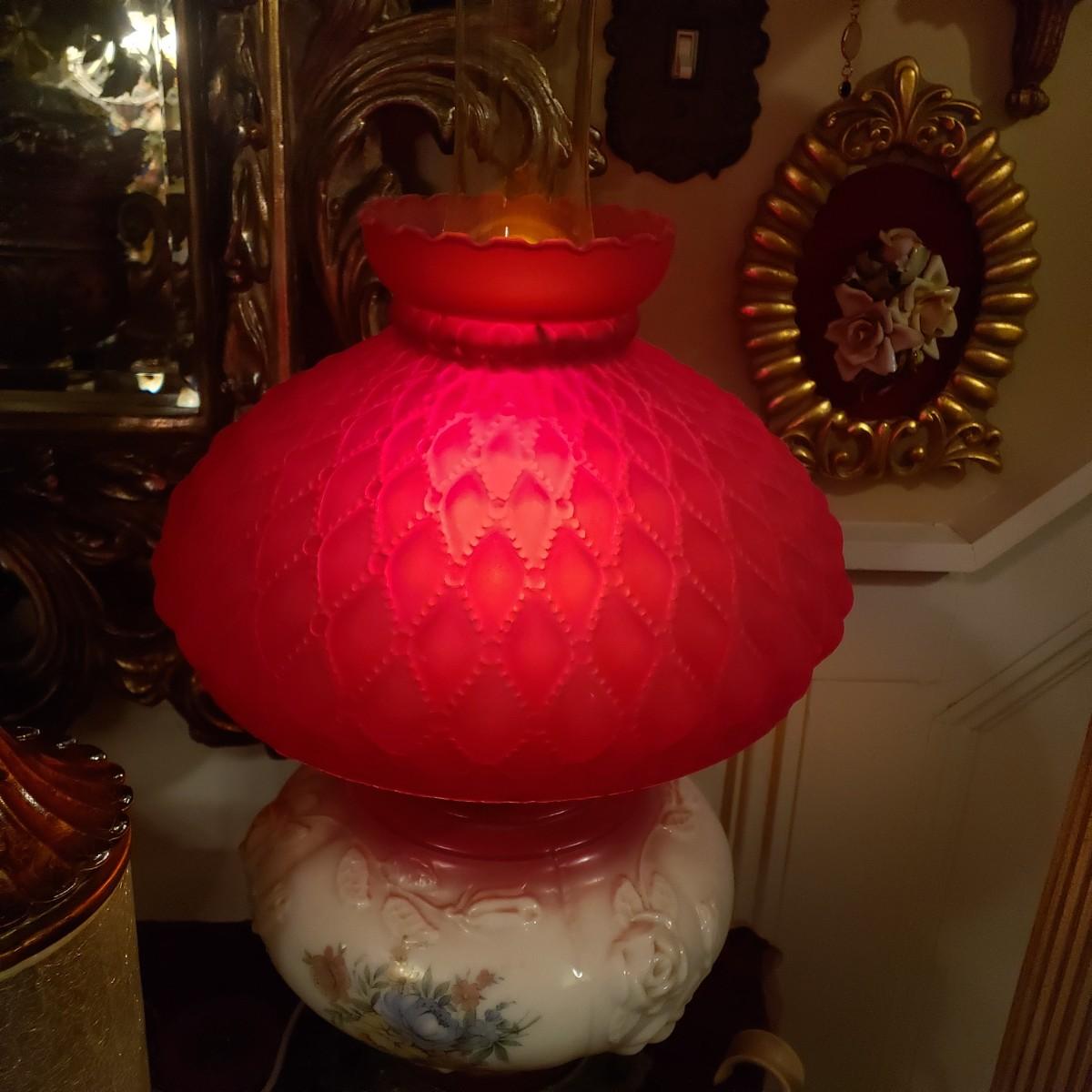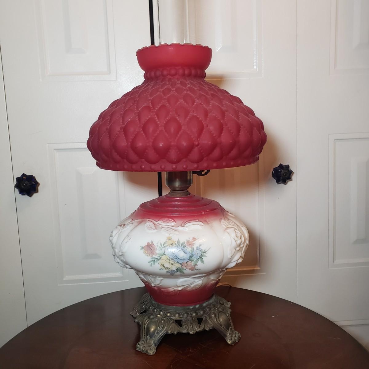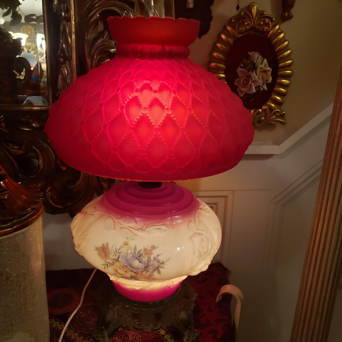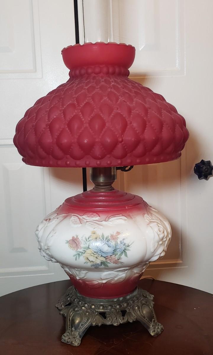 LOT 18: Antique Hand Painted Floral " Gone with the Wind" Lamp with Ruby Red Quilted Diamond Shade