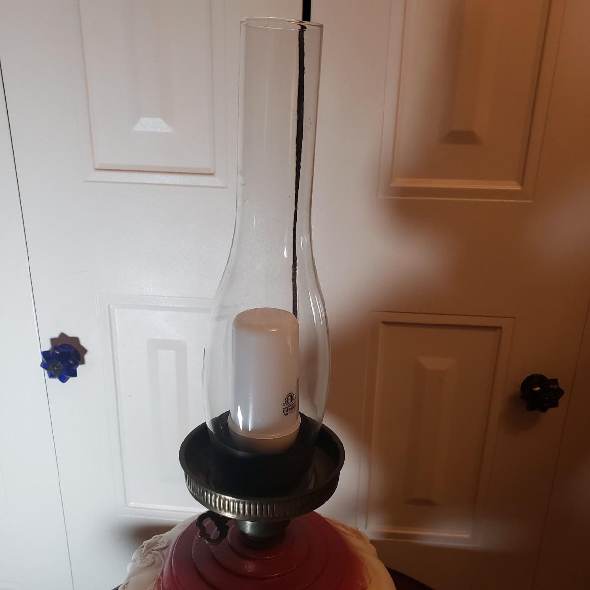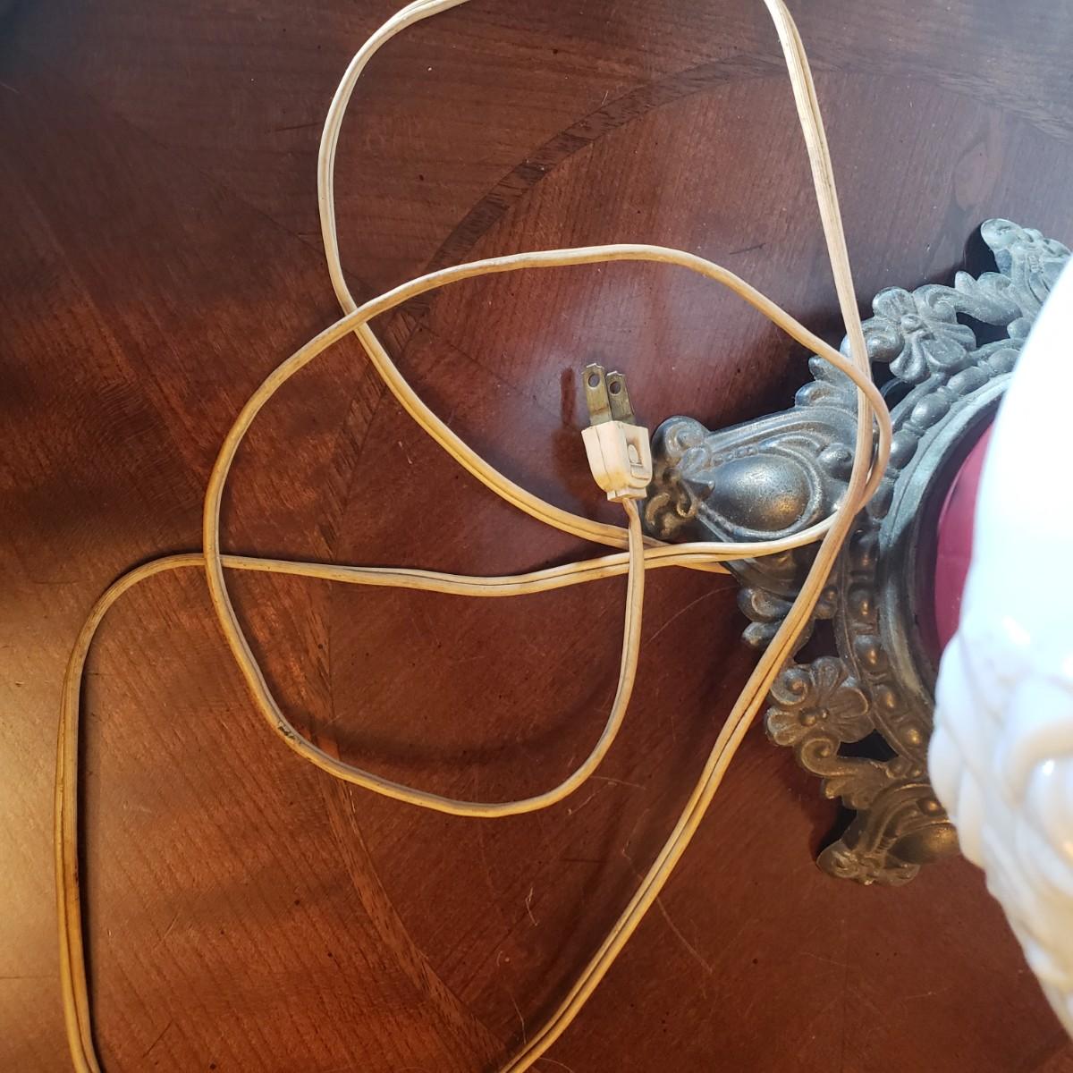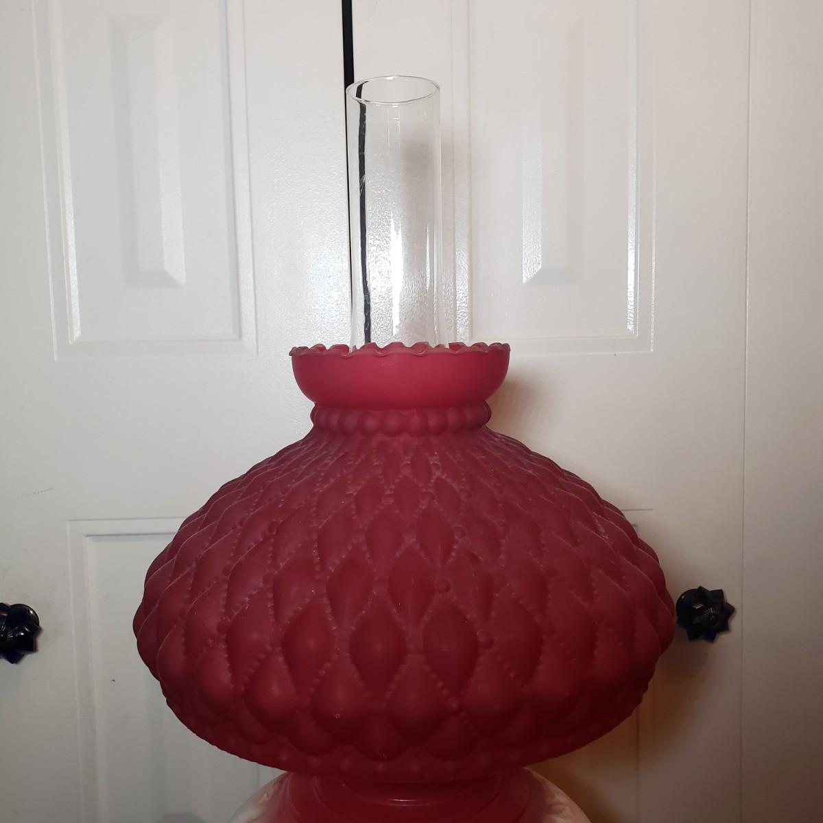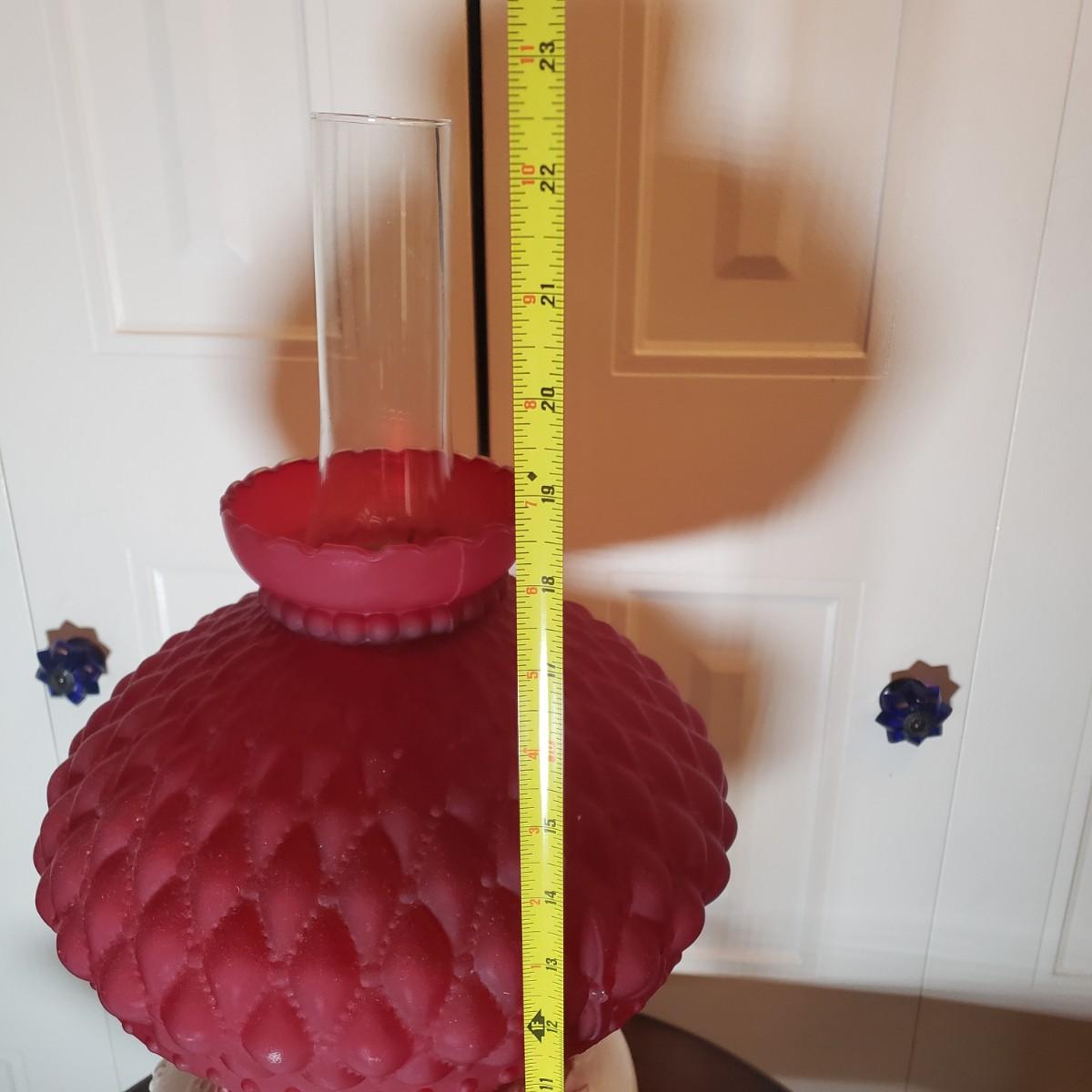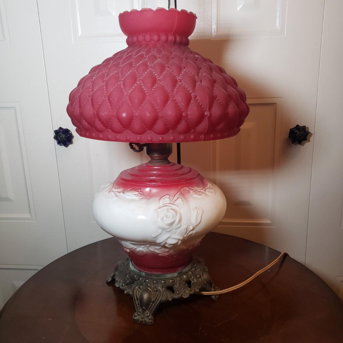 LOT 18: Antique Hand Painted Floral " Gone with the Wind" Lamp with Ruby Red Quilted Diamond Shade
