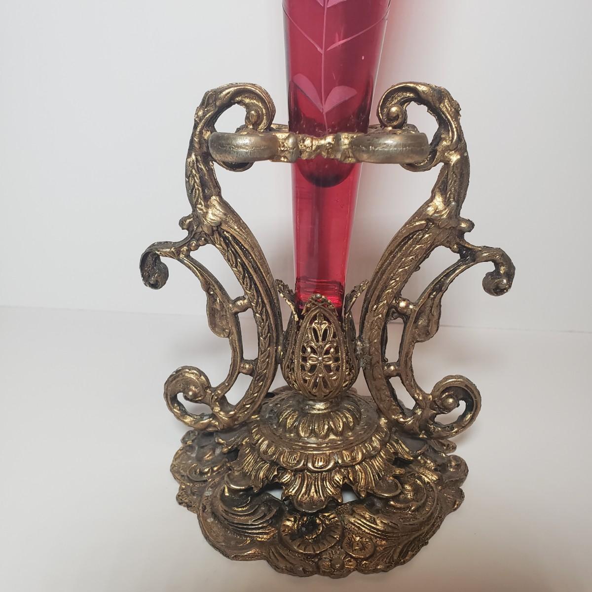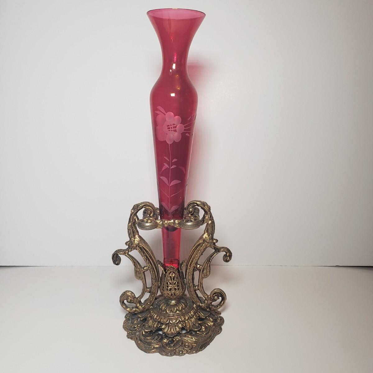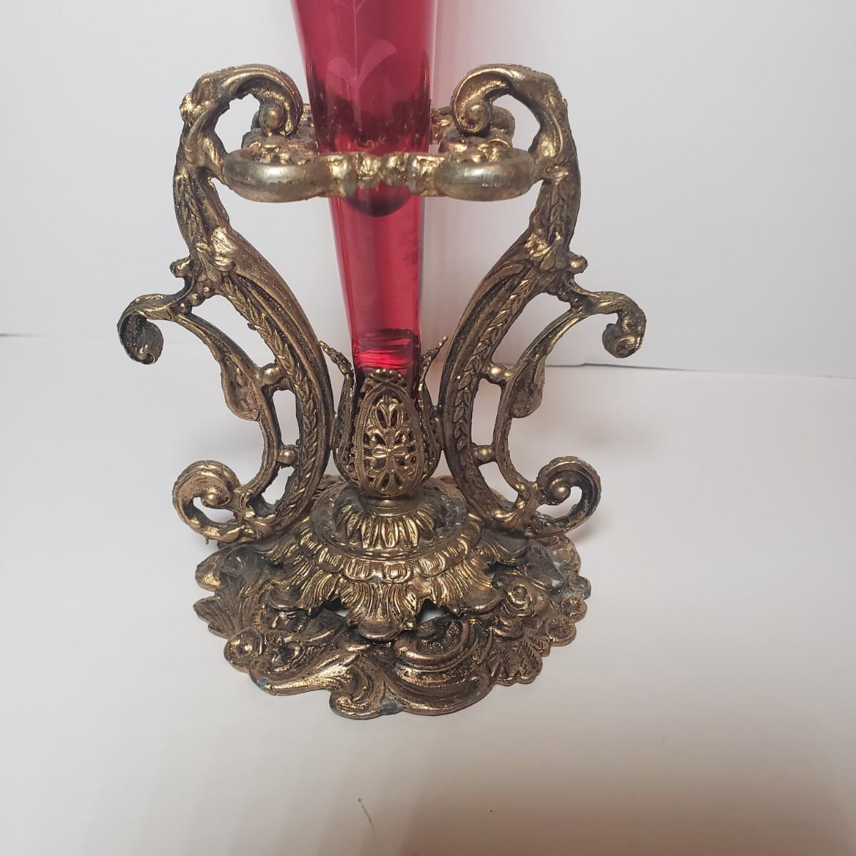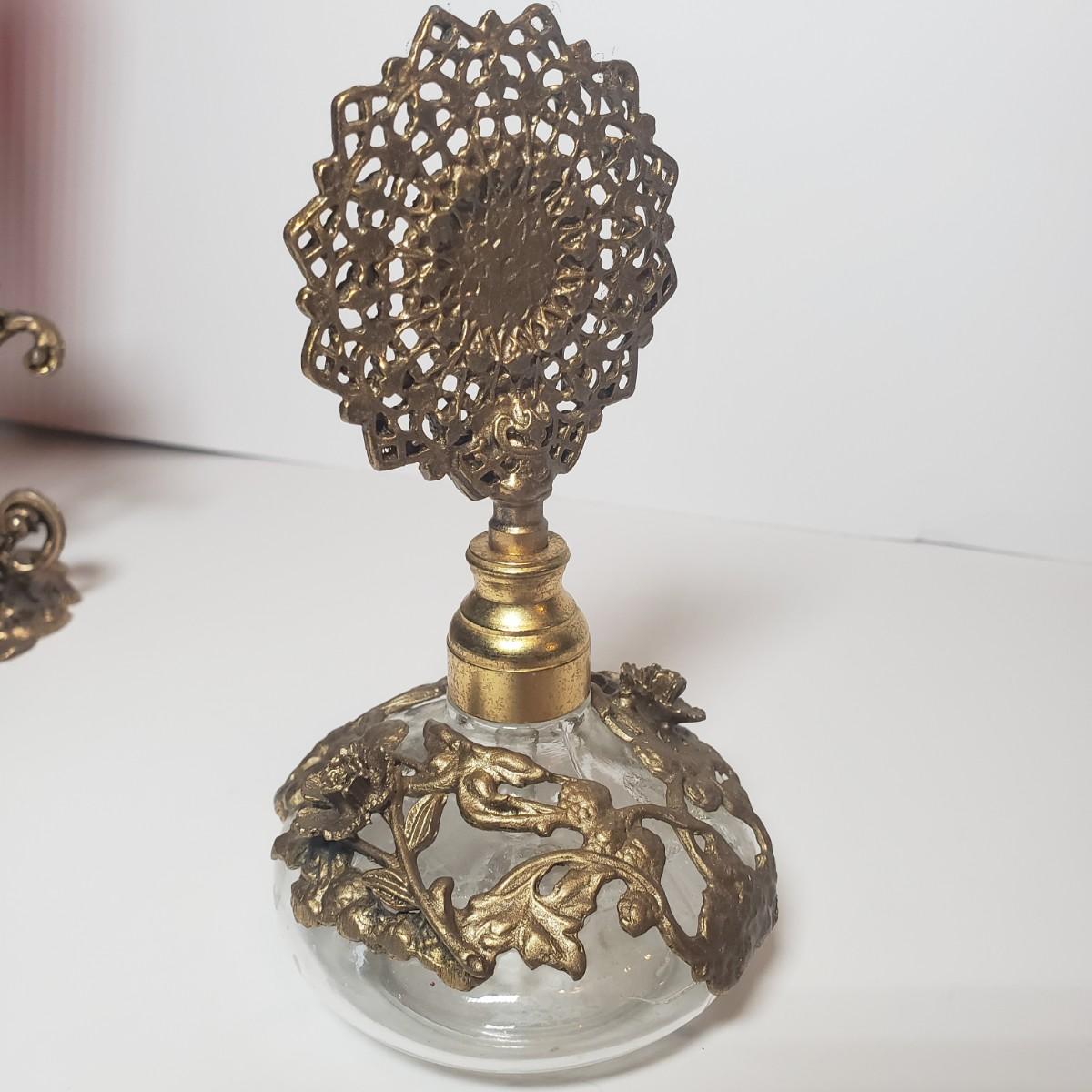 LOT 19: Decorative Collectibles: Glass Bud Vase on Metal Gold Stand, Ornate Perfume Bottle & More