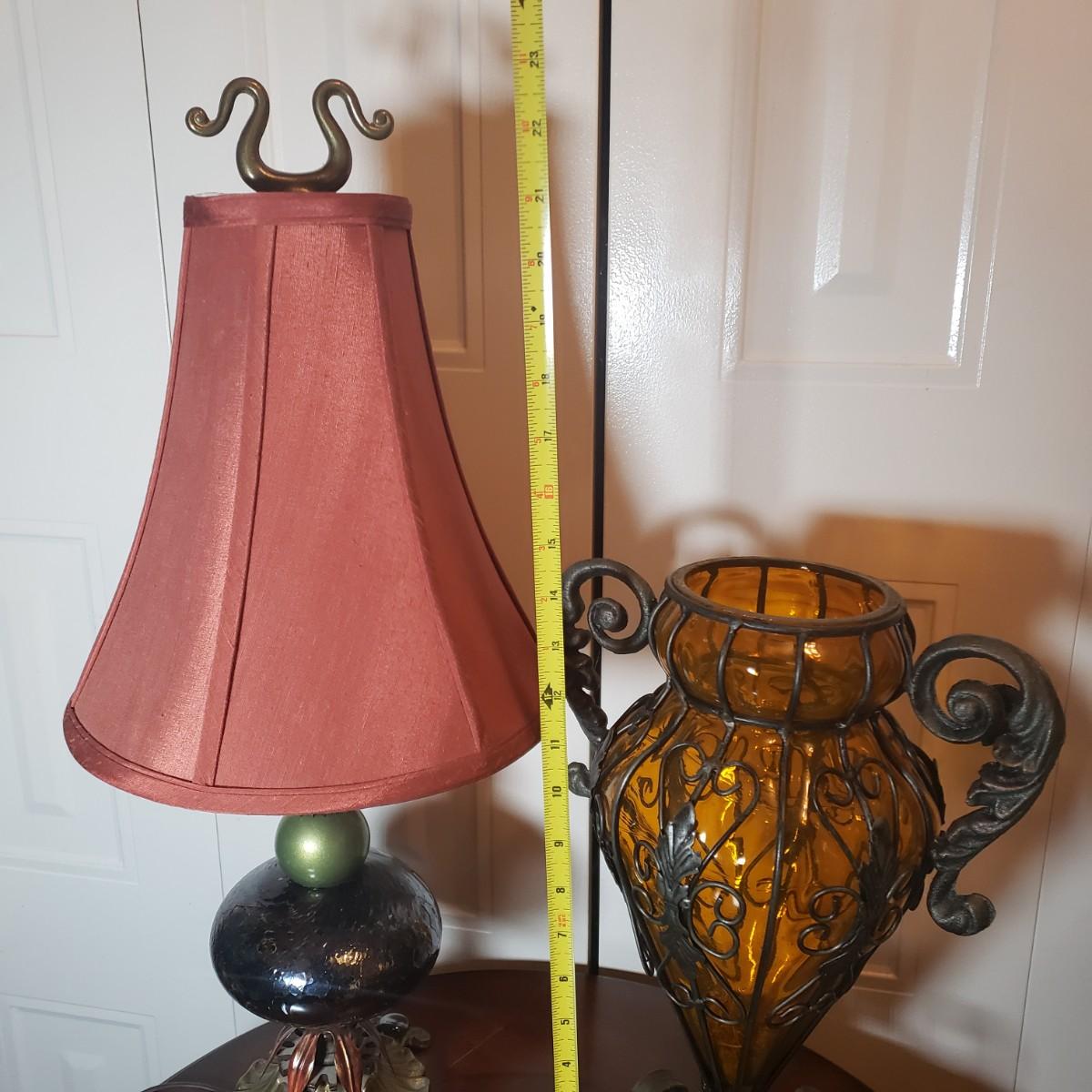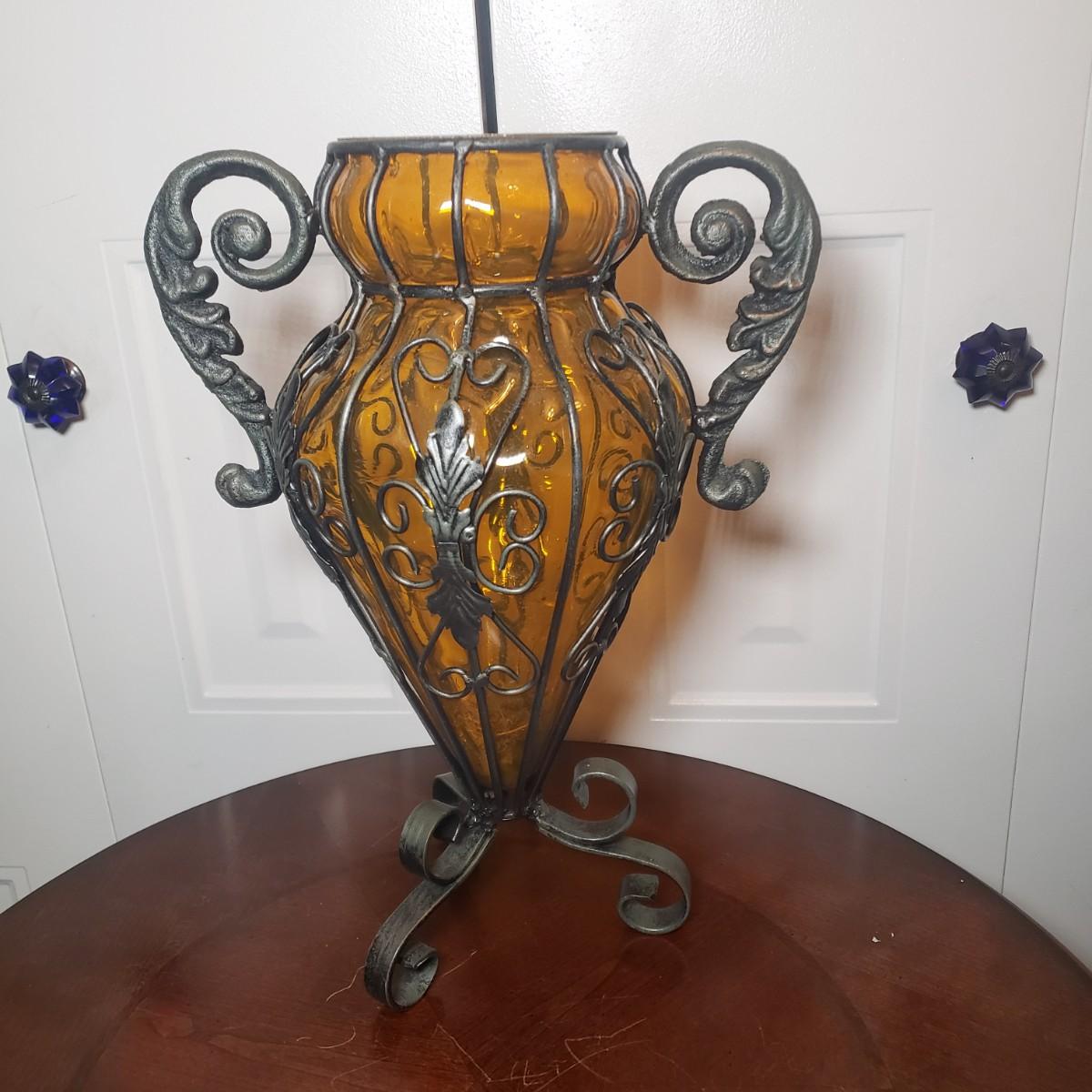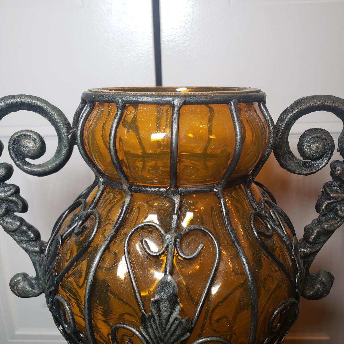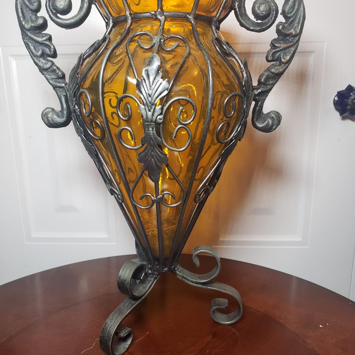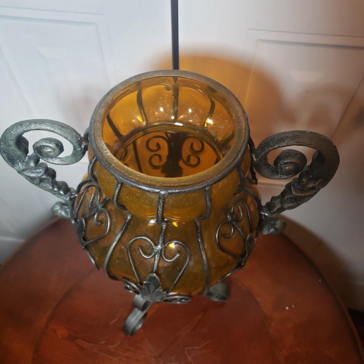 LOT 20: Amber Glass Caged Vase & Decorative Table Tamp with Brass Finial