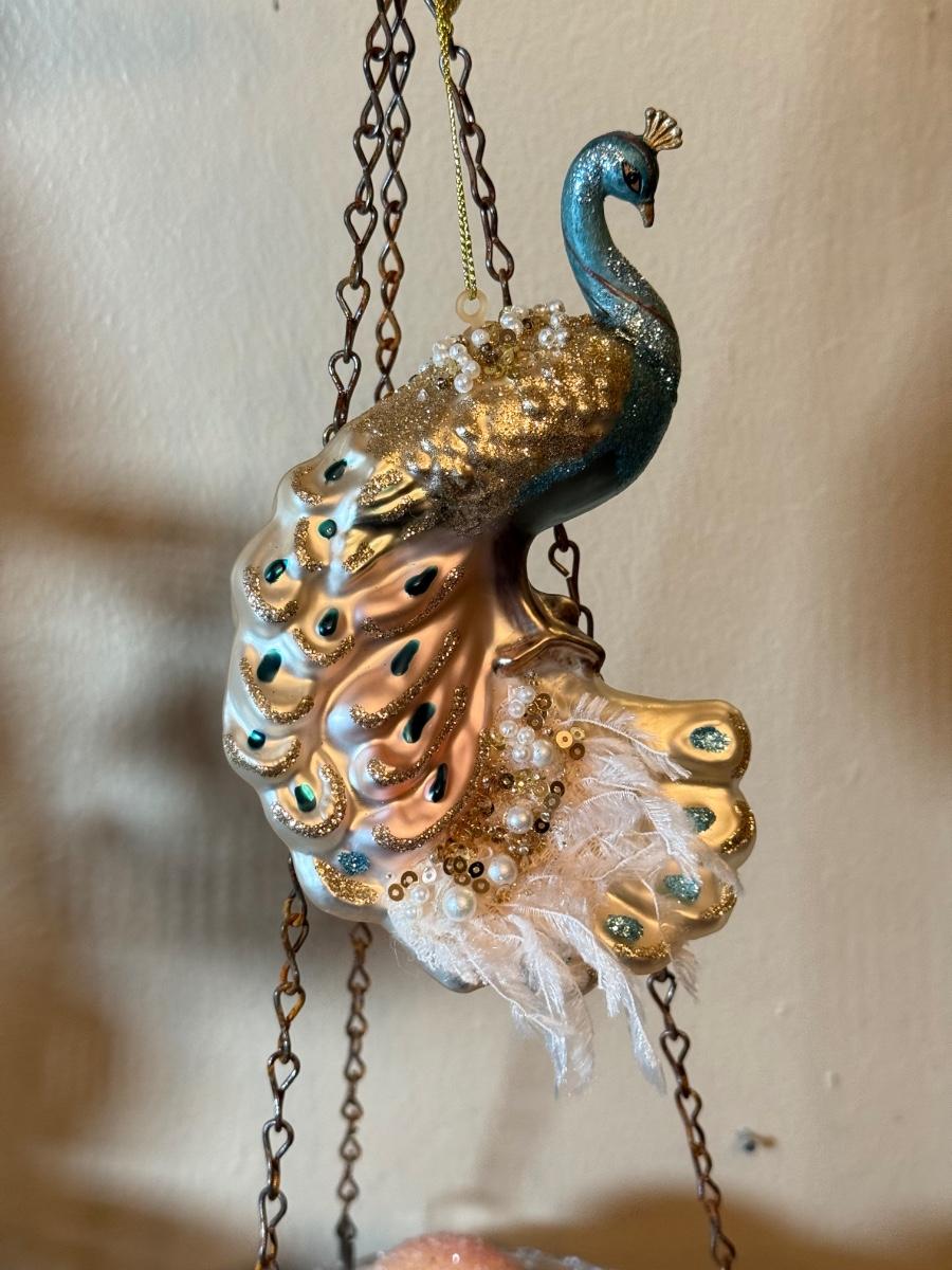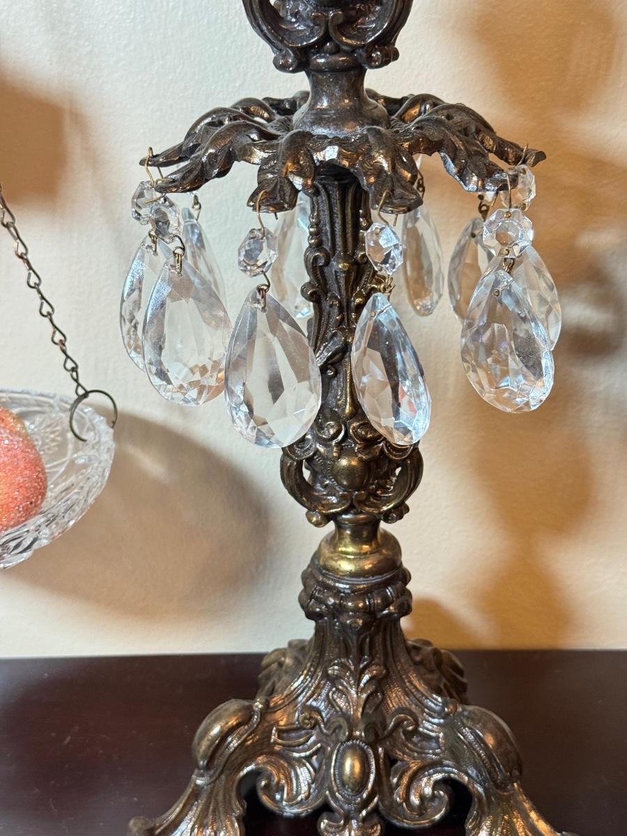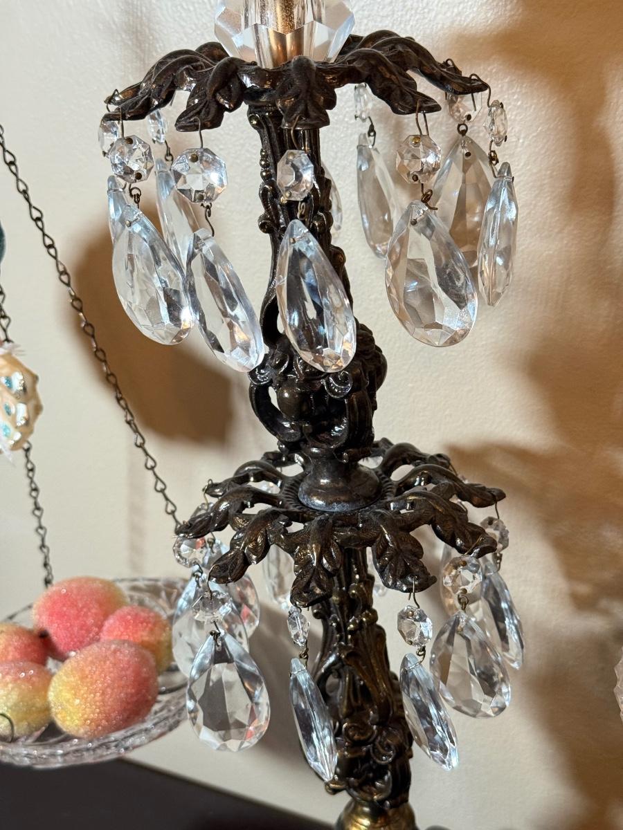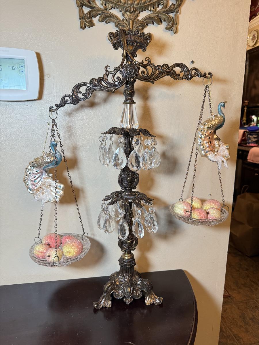 LOT 36: Vintage Brass & Crystal Scale w/ Peacock Ornaments