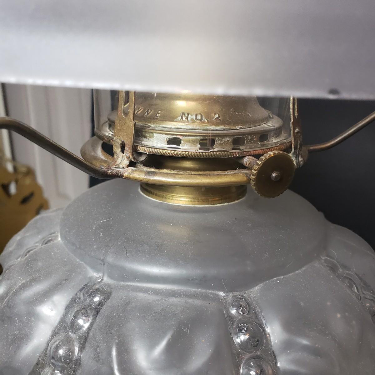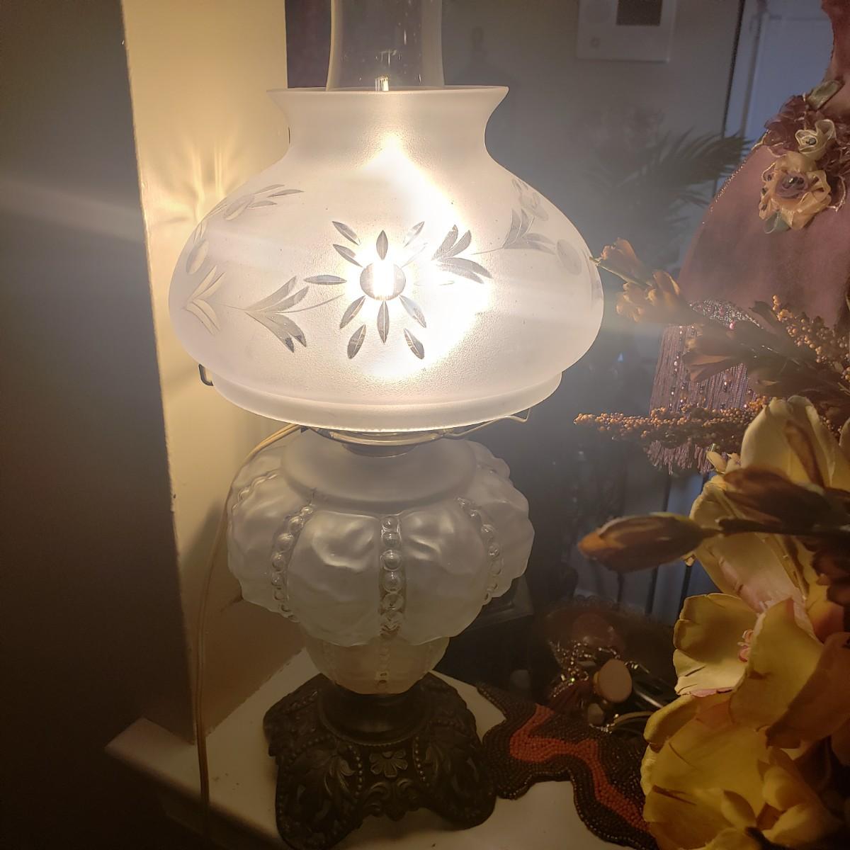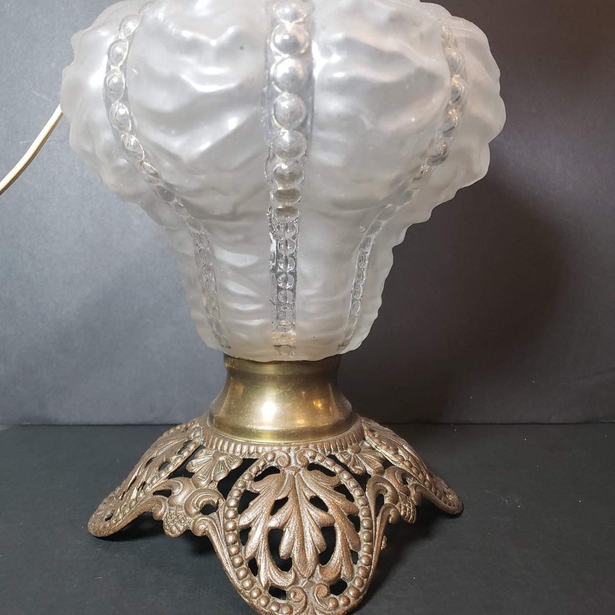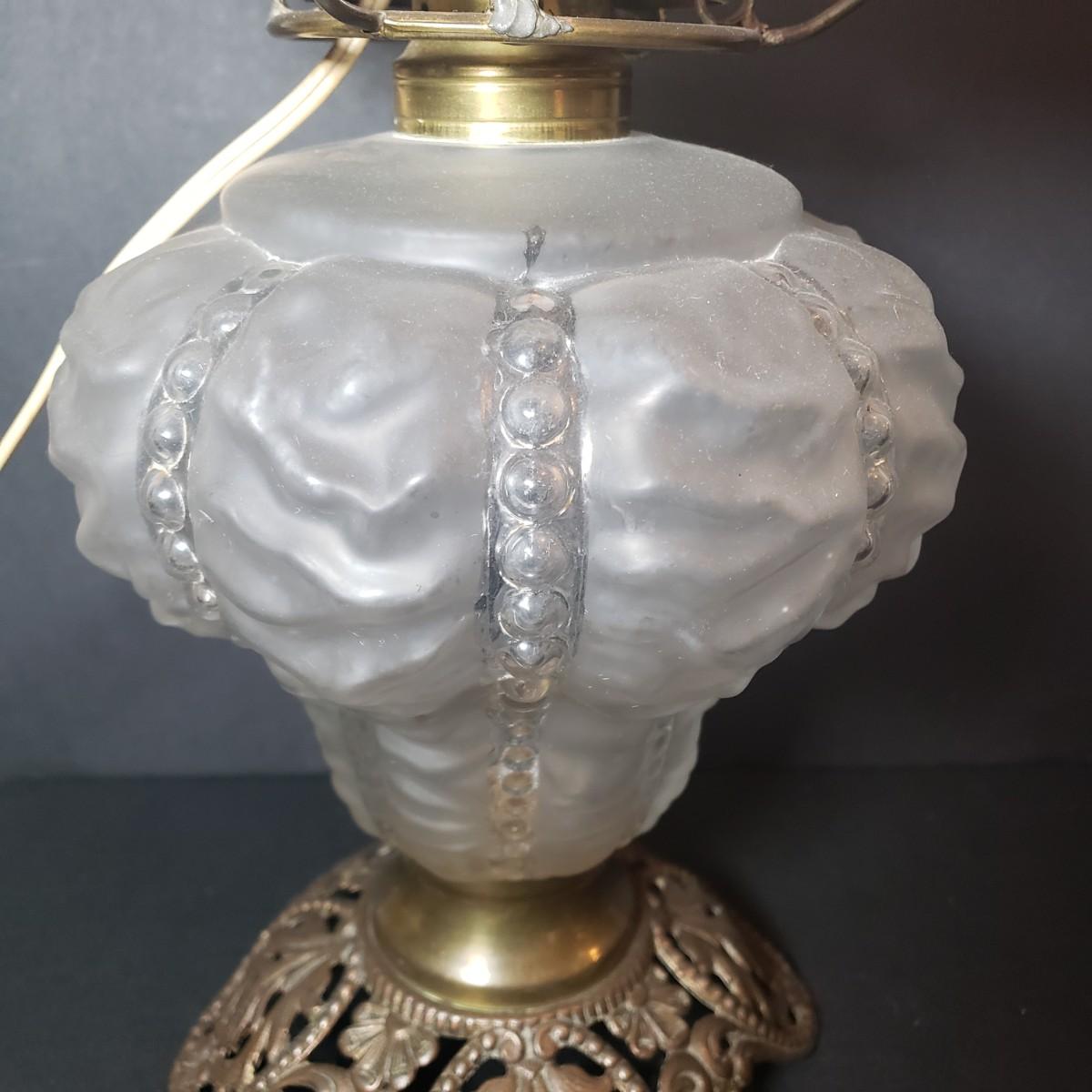 LOT 41: Antique Beaded Drape Frosted Glass Lamp with Etched Glass Shade