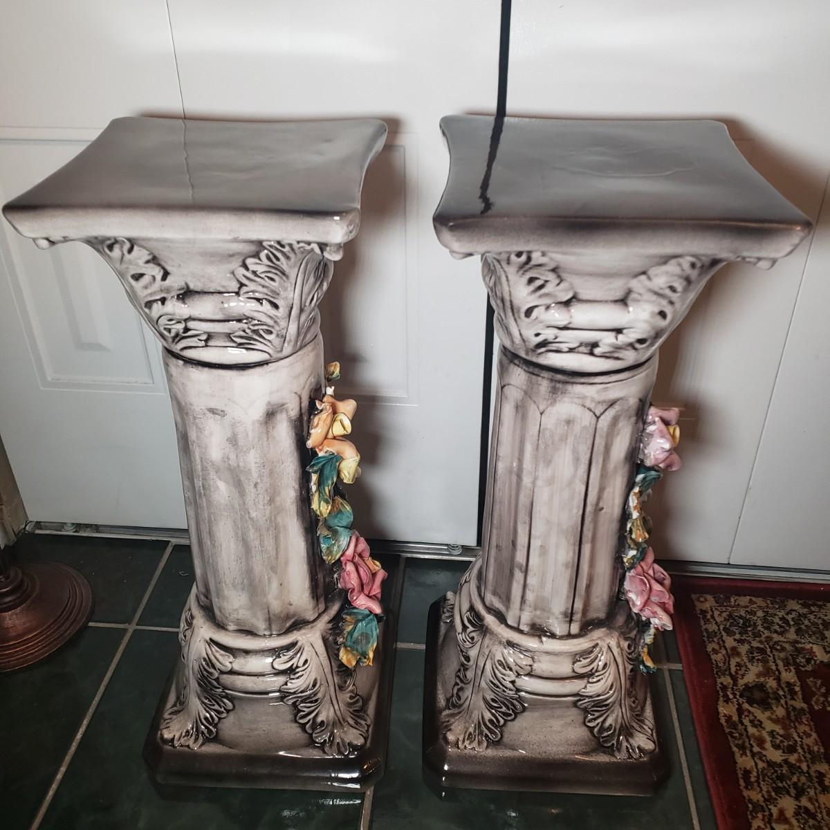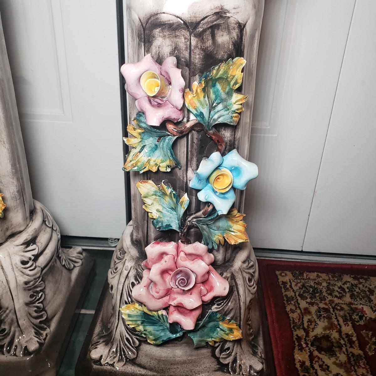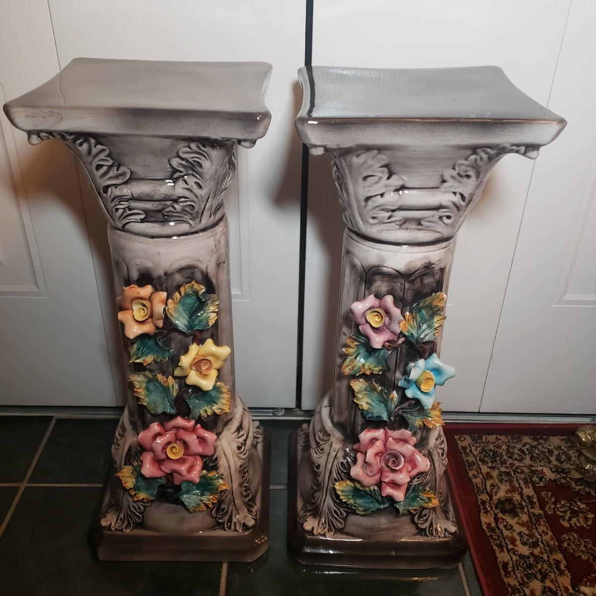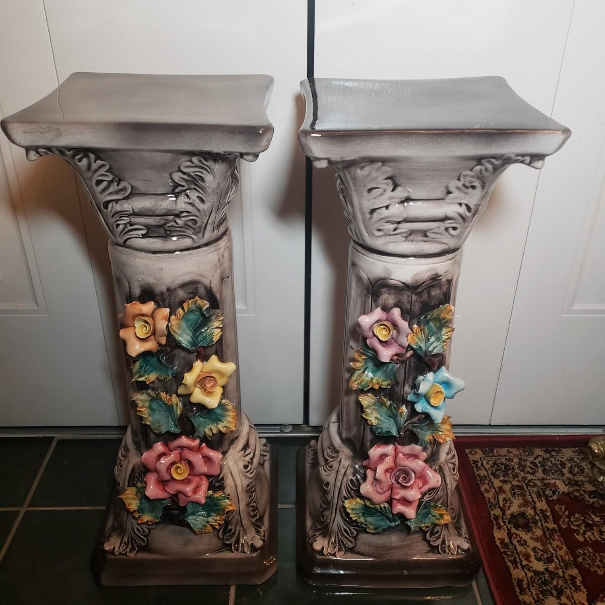 LOT 50: Pair of Gorgeous Italian Ceramic Capodimonte Floral Pedestal/Plant Stands