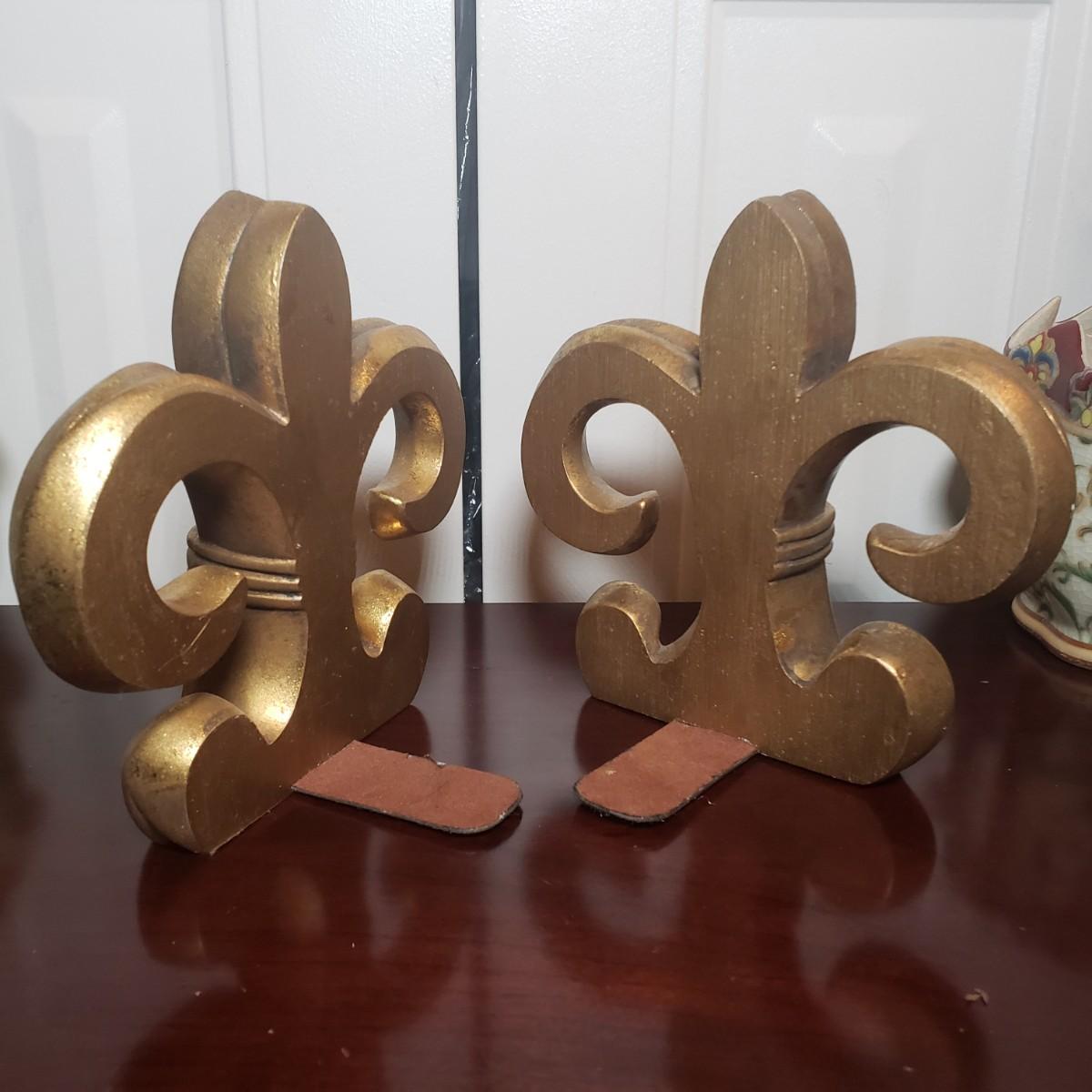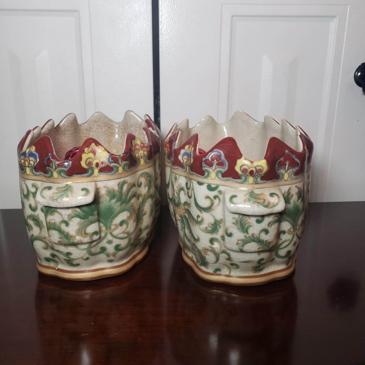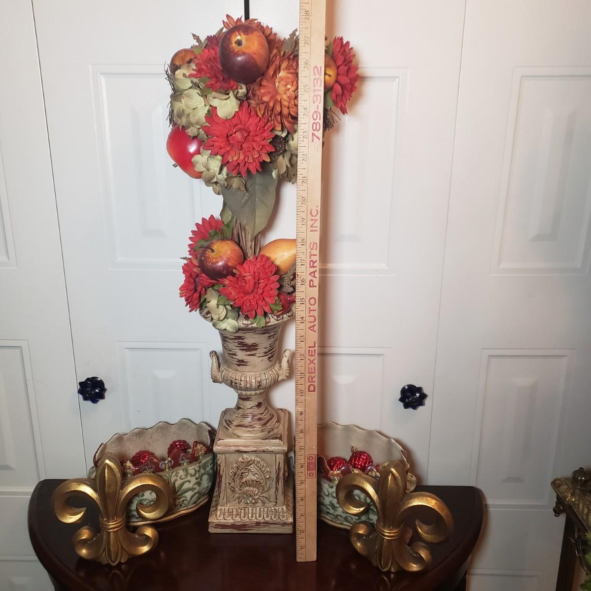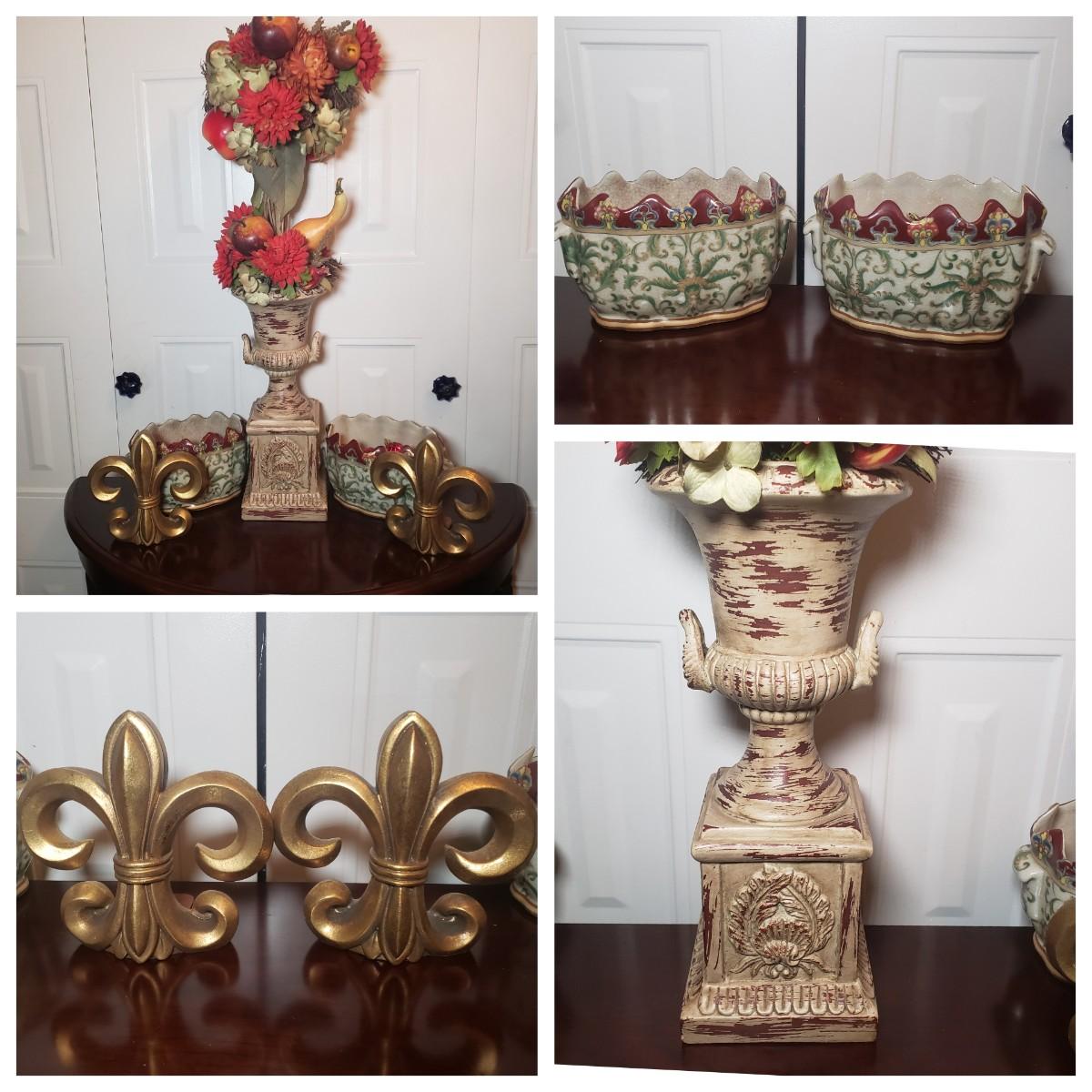 LOT 51: Fleur De Lis Bookends, Chinese Porcelain Planters & Faux Floral Topiary