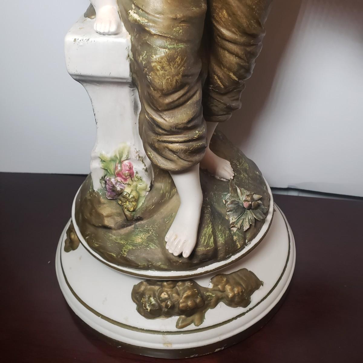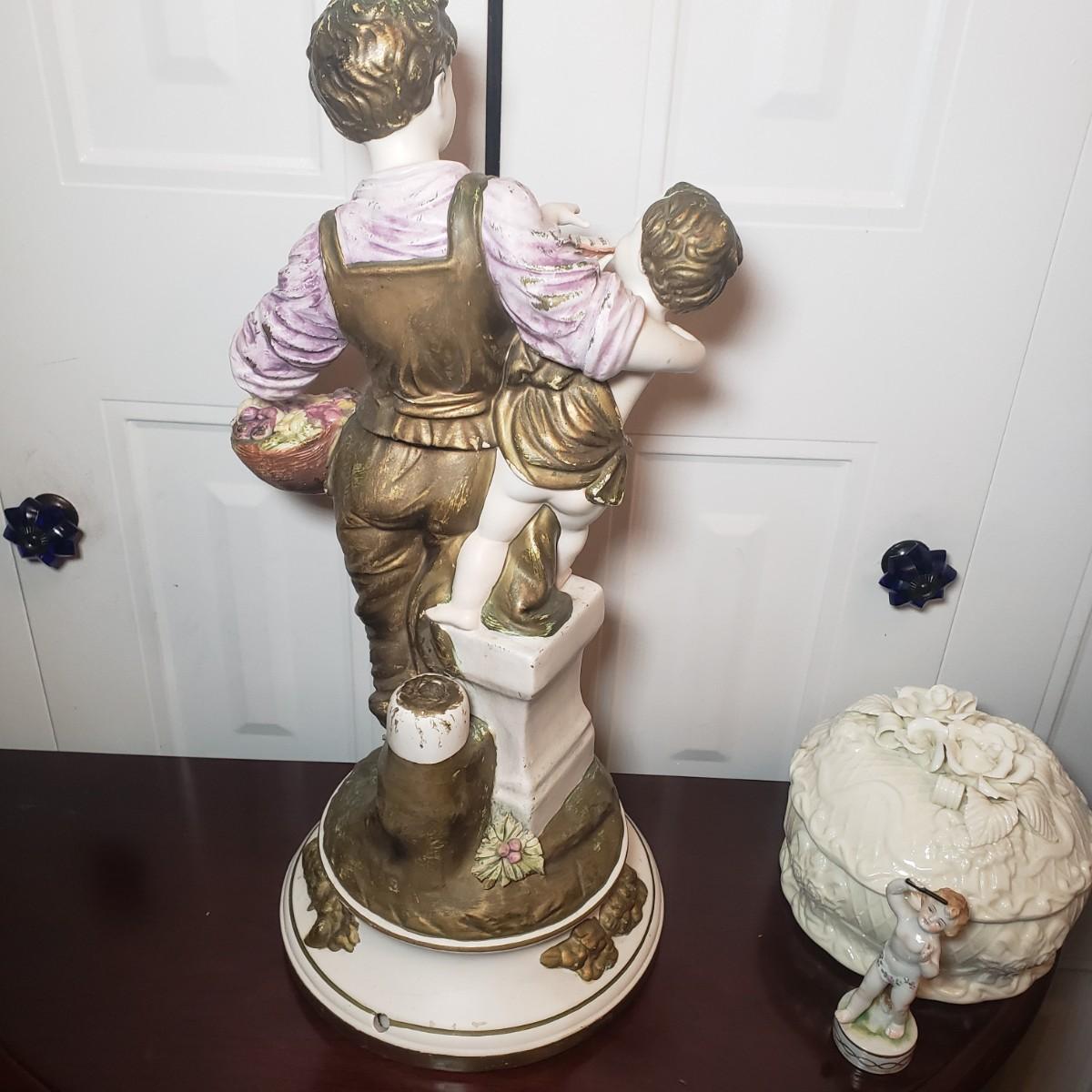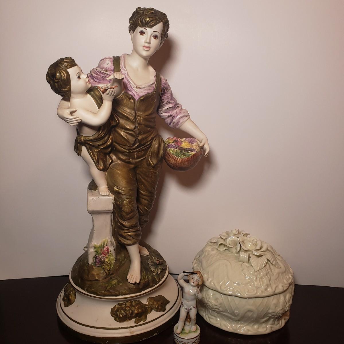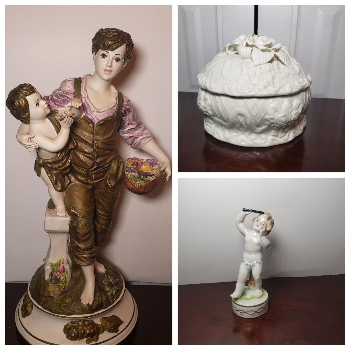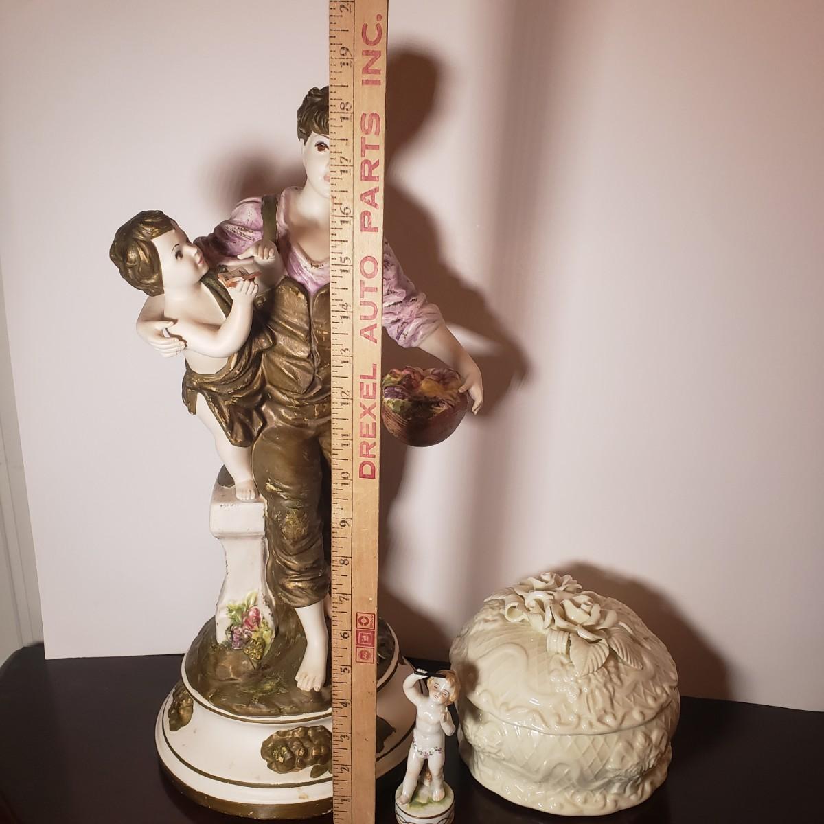 LOT 53: Italian Capodimonte Statue/Lamp Base, Cherub Figurine & Floral Ceramic Box