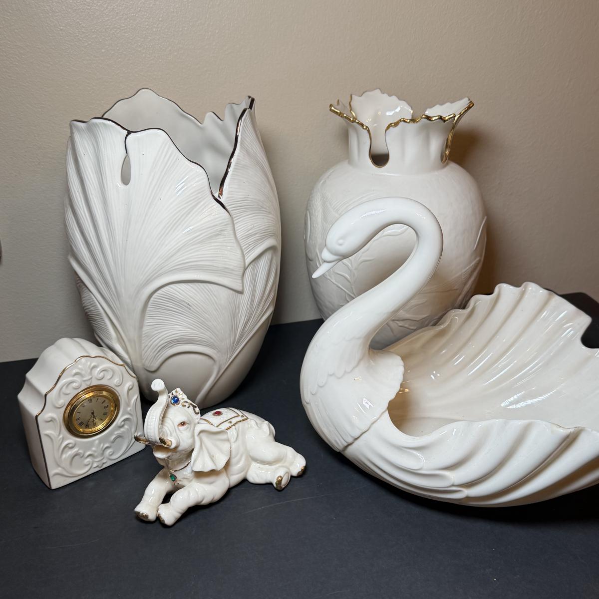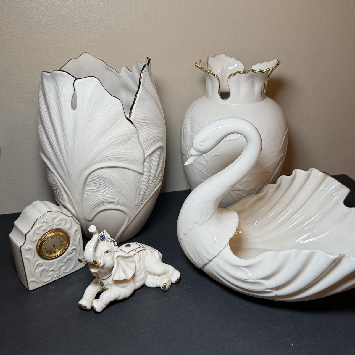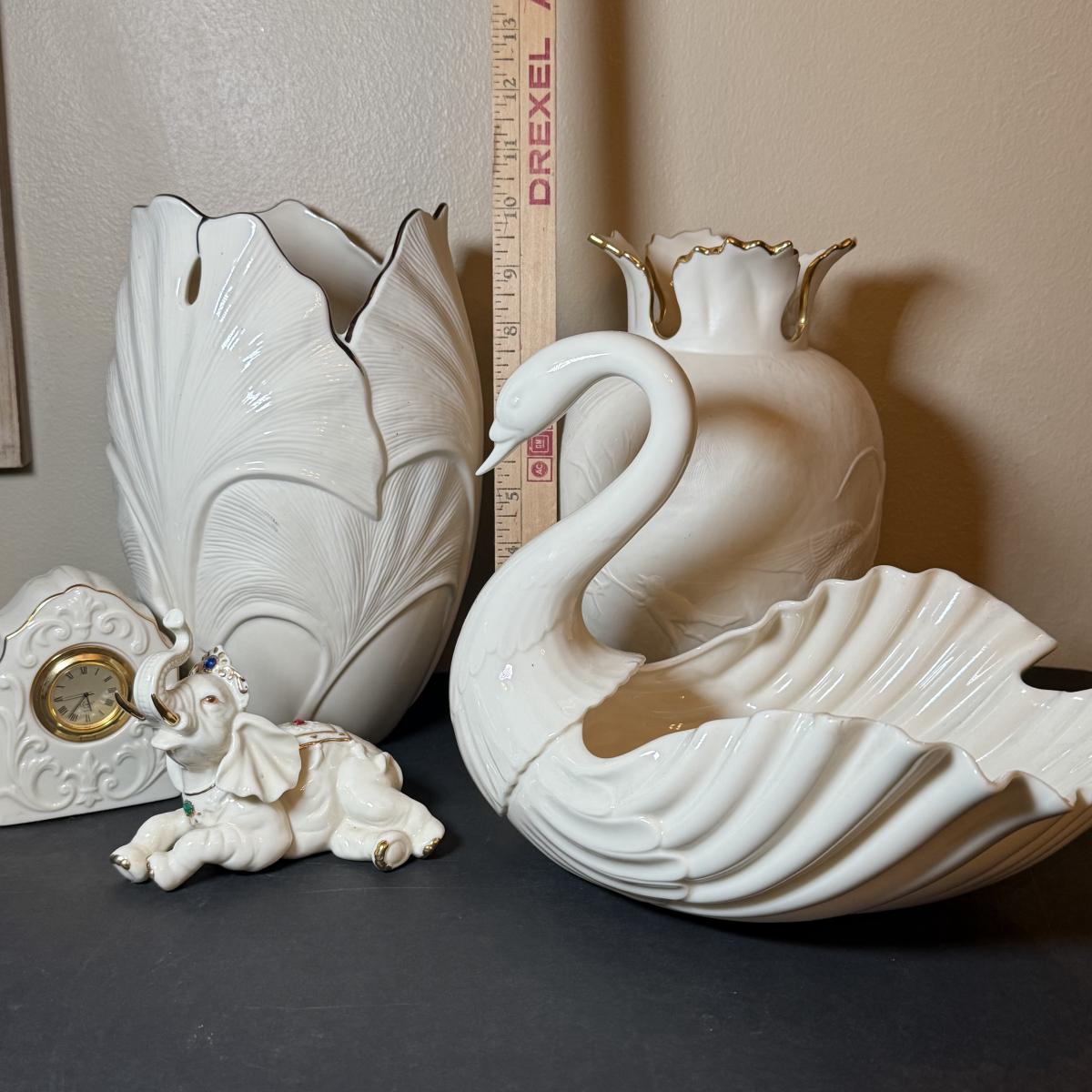 LOT 65: Lenox Collection: Vintage Made in USA Large Vases, Clock & Swan