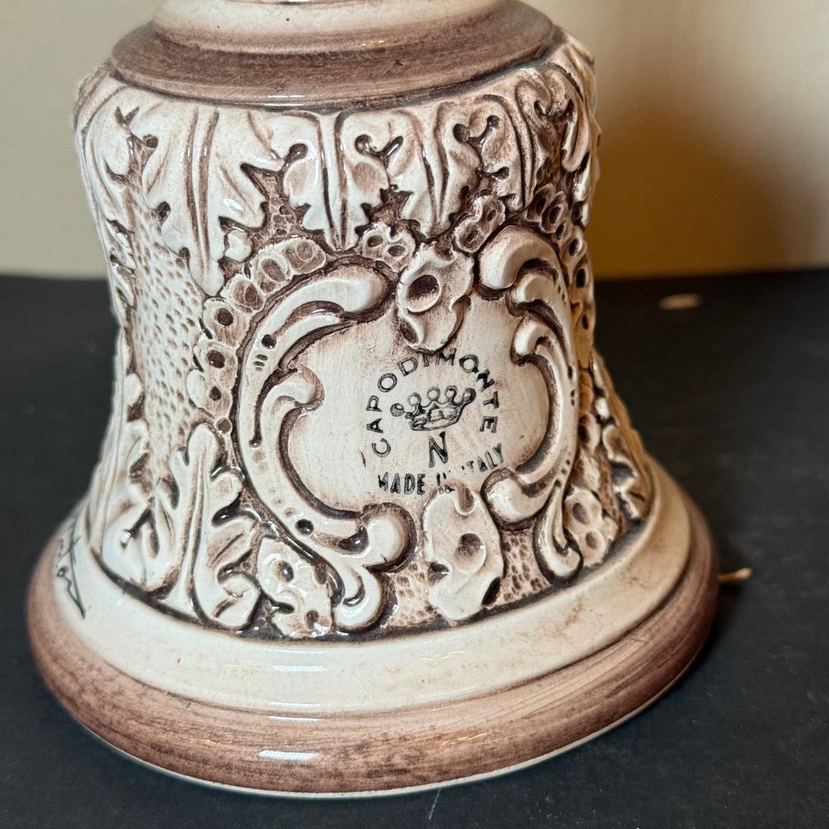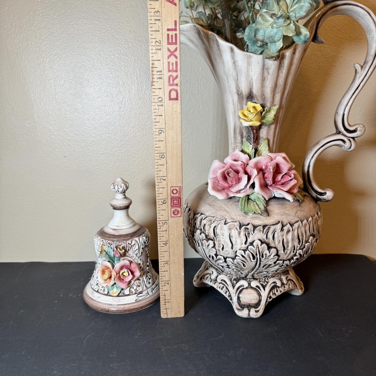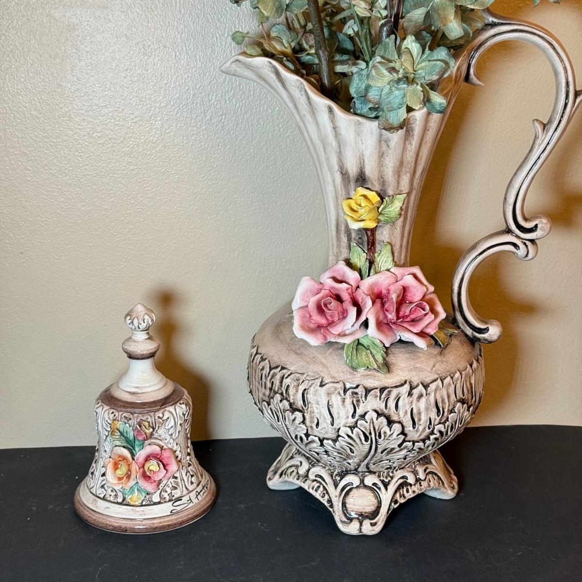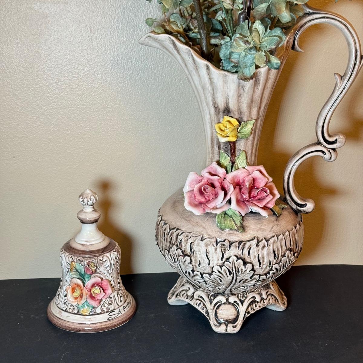LOT 81: Vintage Signed Capodimonte Porcelain Bell & Vintage Italian Floral Sculpture Ewer Vase