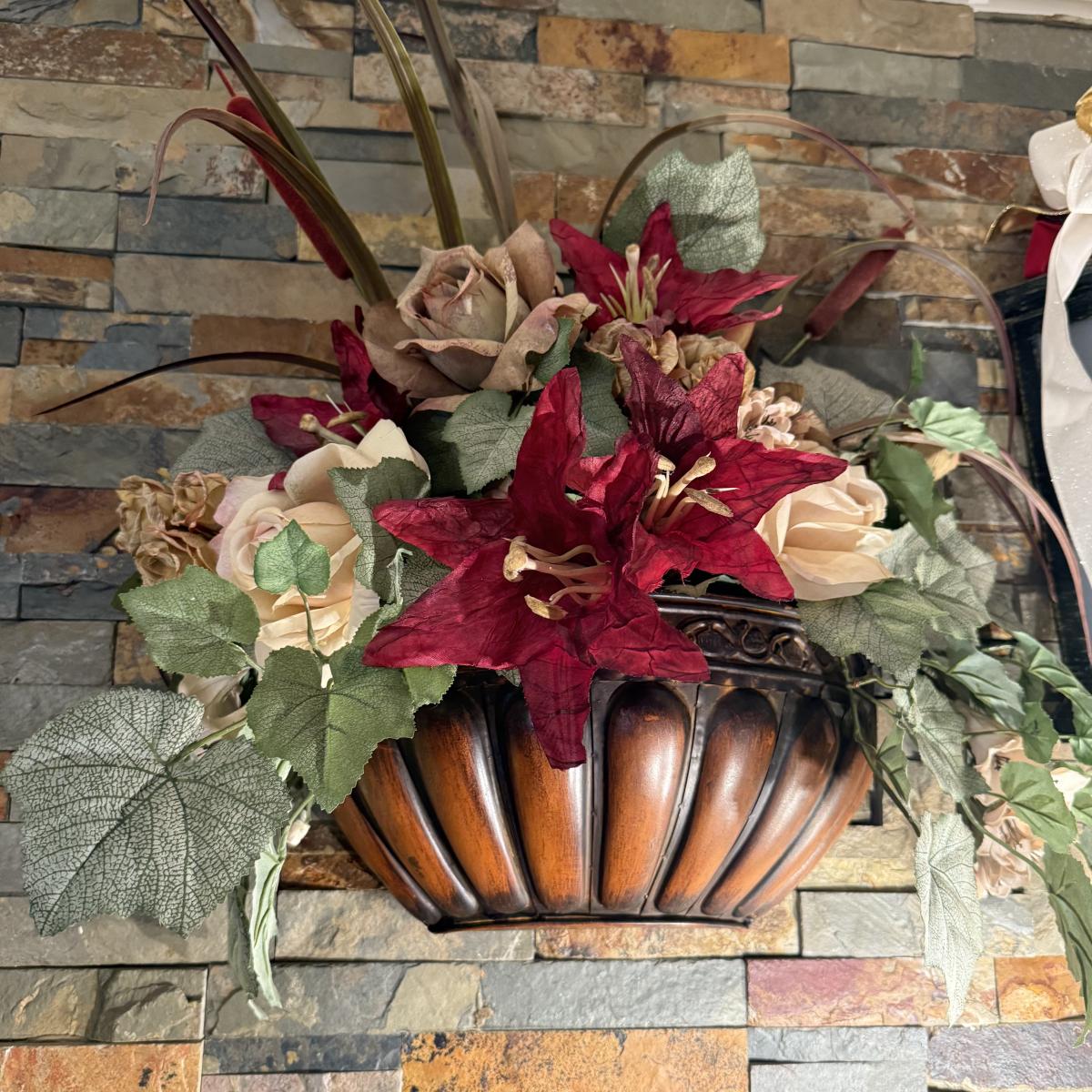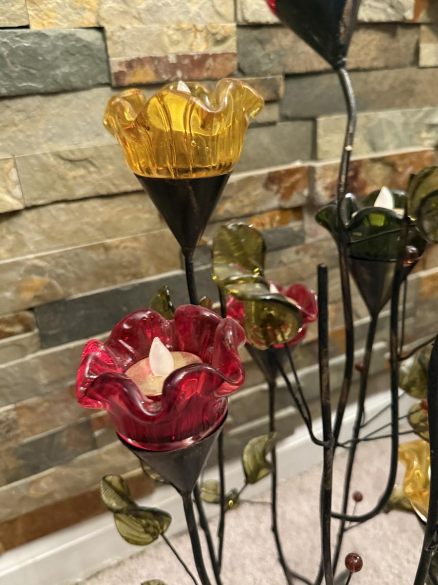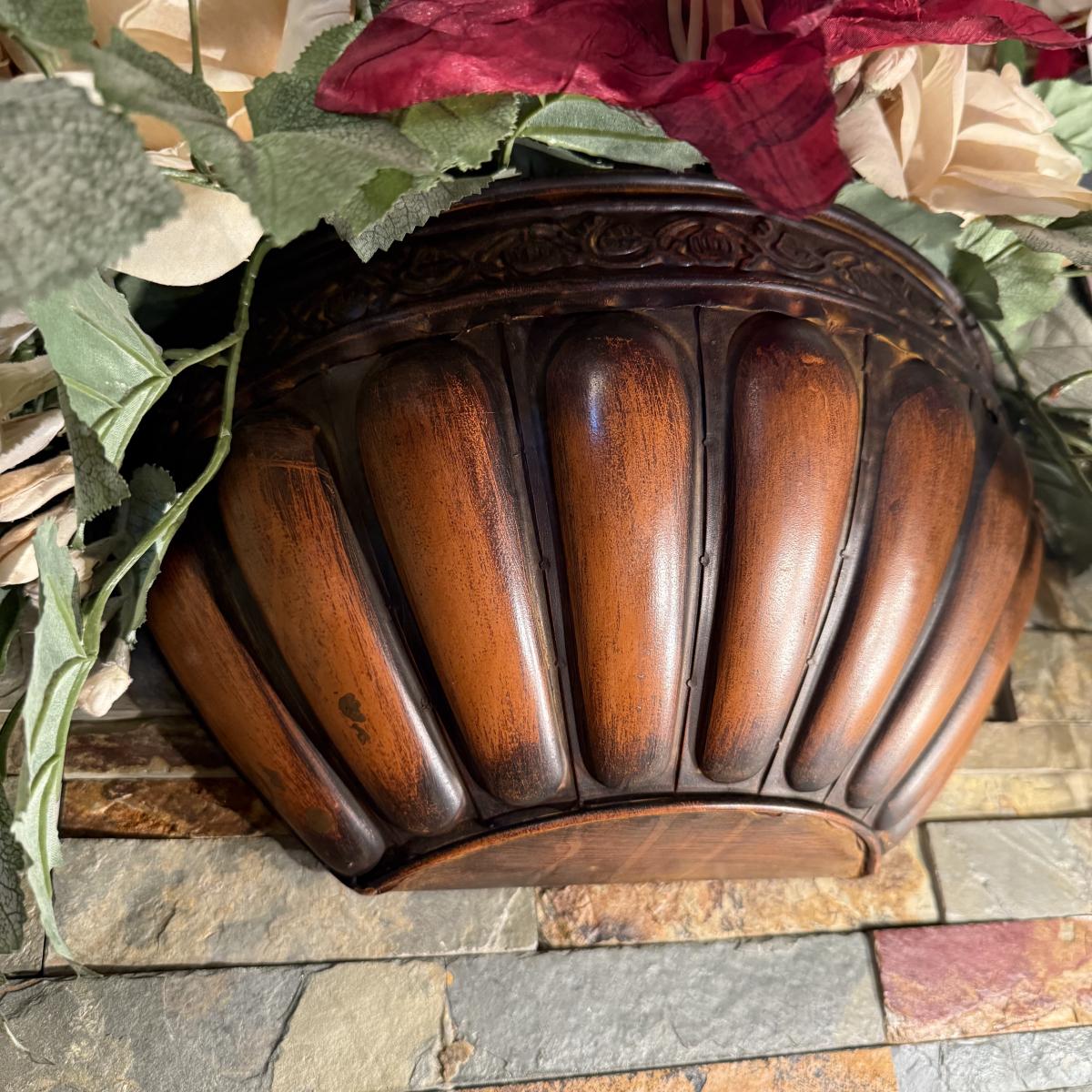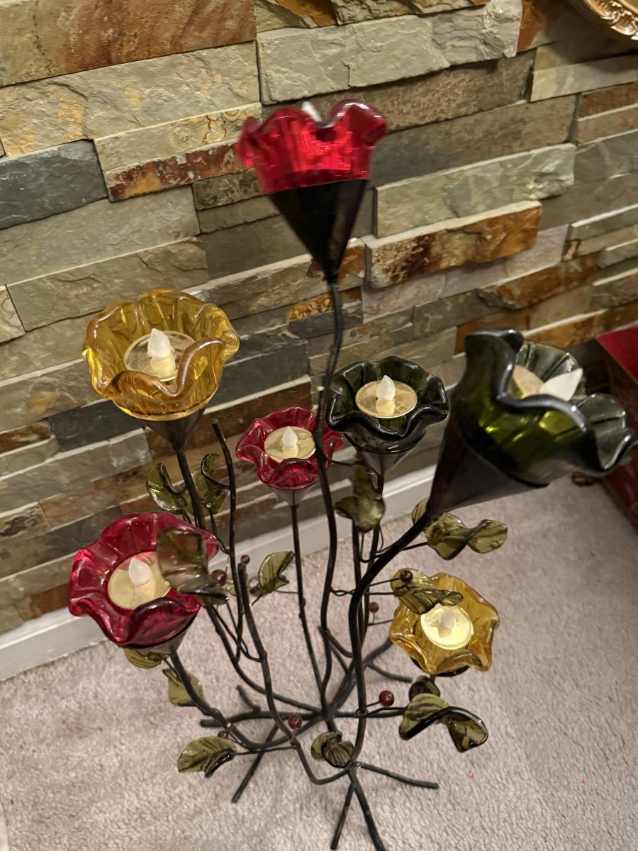 LOT 84: Wall Mounted Faux Floral Arrangement, Tin Planter & Glass/Metal Tea Light Candle Holder