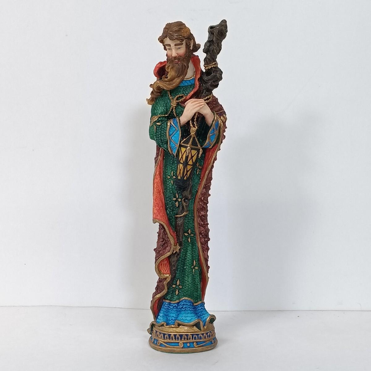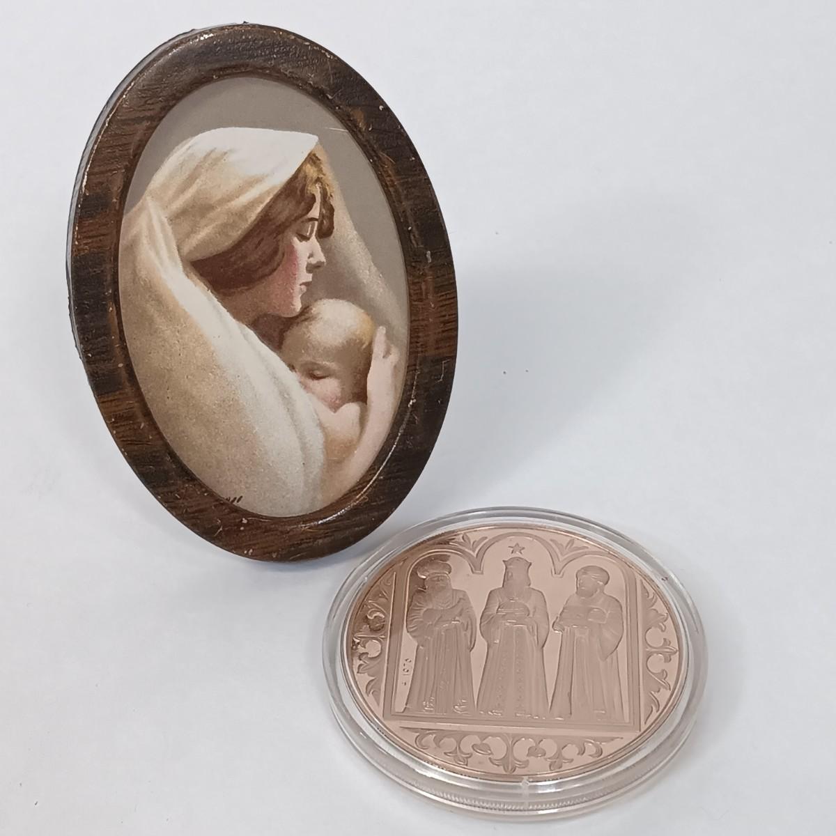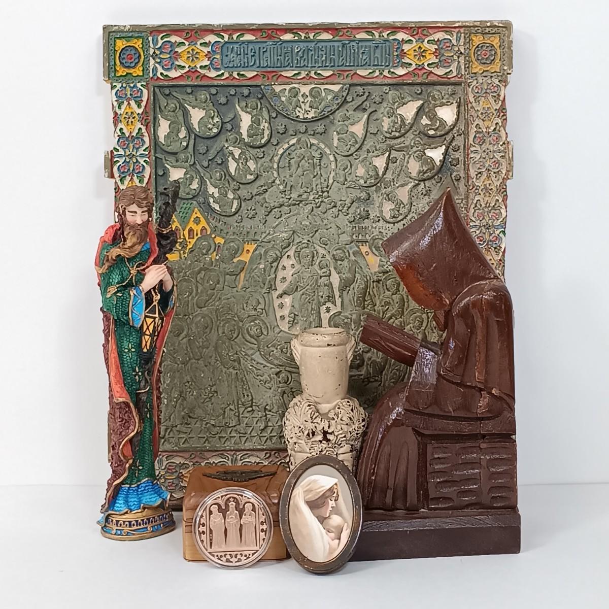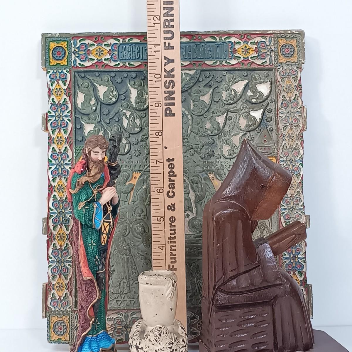 LOT 8: The First Christmas Coin Sculpted by Carol Yocum & Jane Lunger, Lenox 1998 Joseph Figurine, Russian Wood Icon, Carved Wood Santos & More