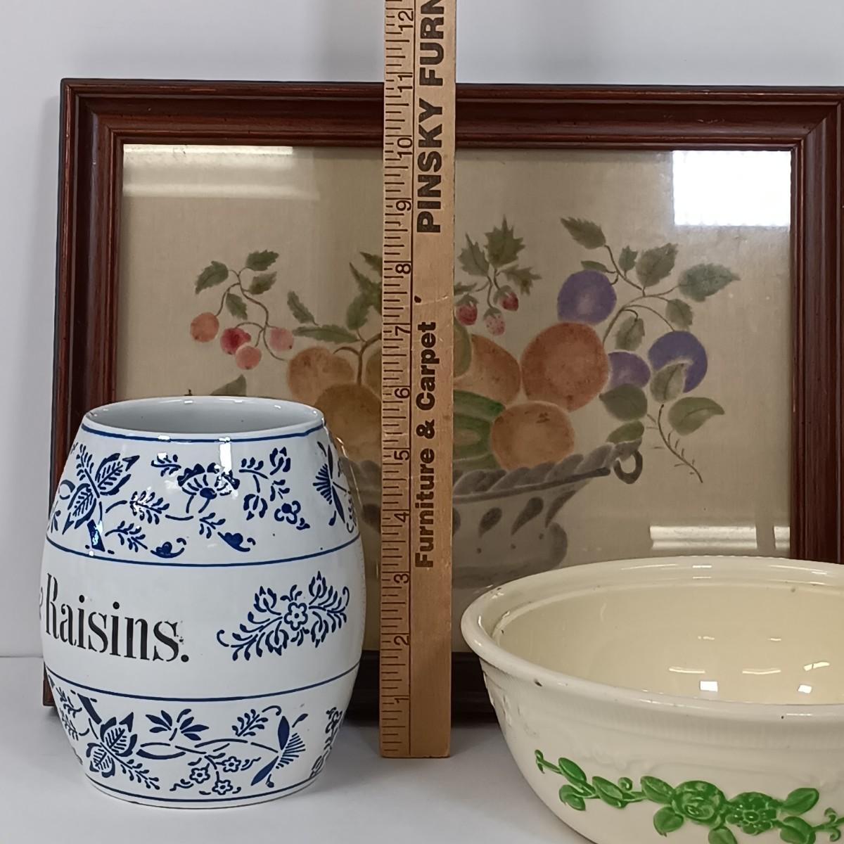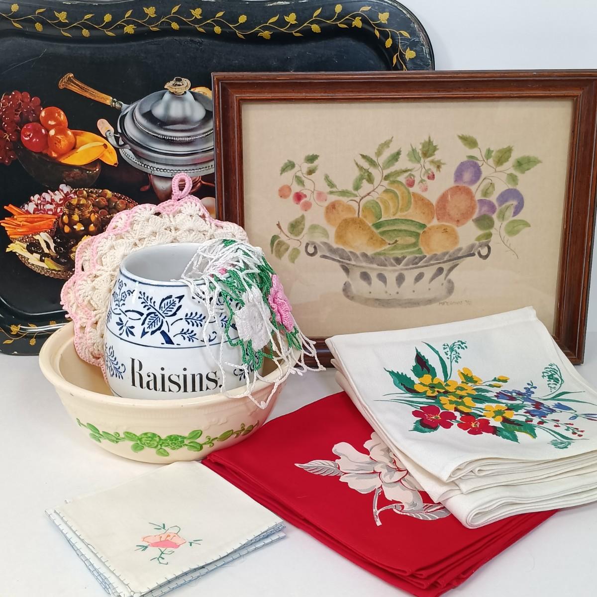 LOT 14: Vintage Kitchen - TV Trays, M. Fellows Folk Art, Oven Serve Bowl & More