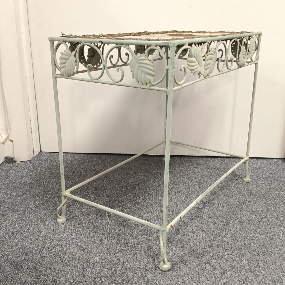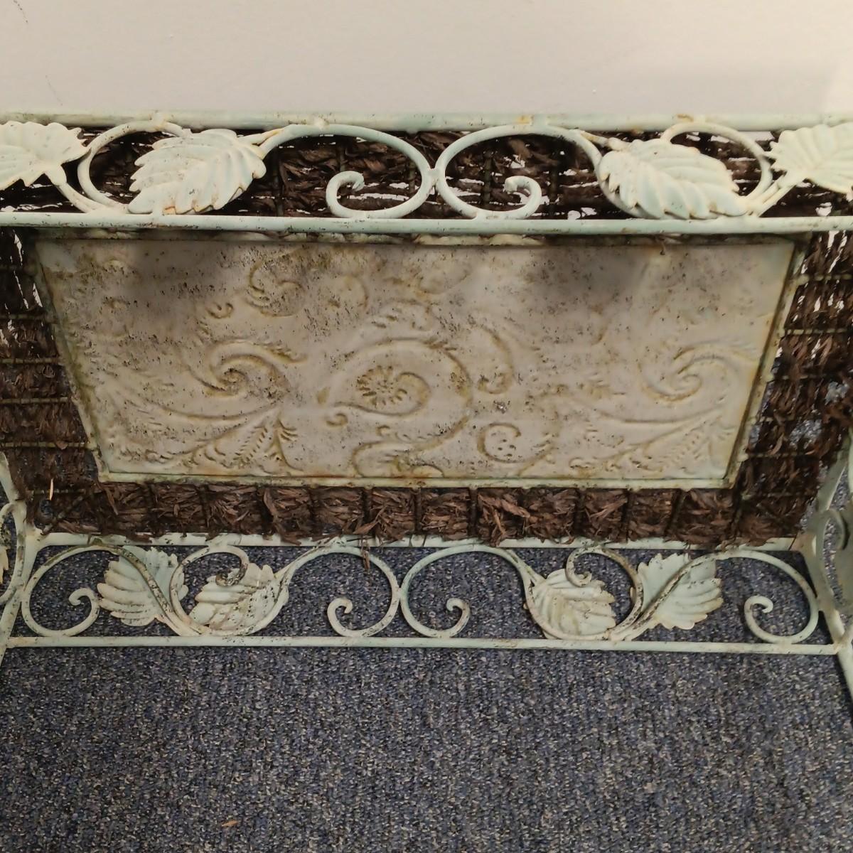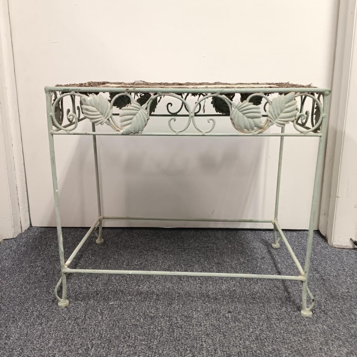 LOT 19: Wrought Iron Plant Stand with Scarf Shrugs and Glass Decor