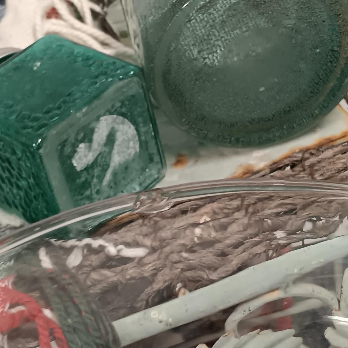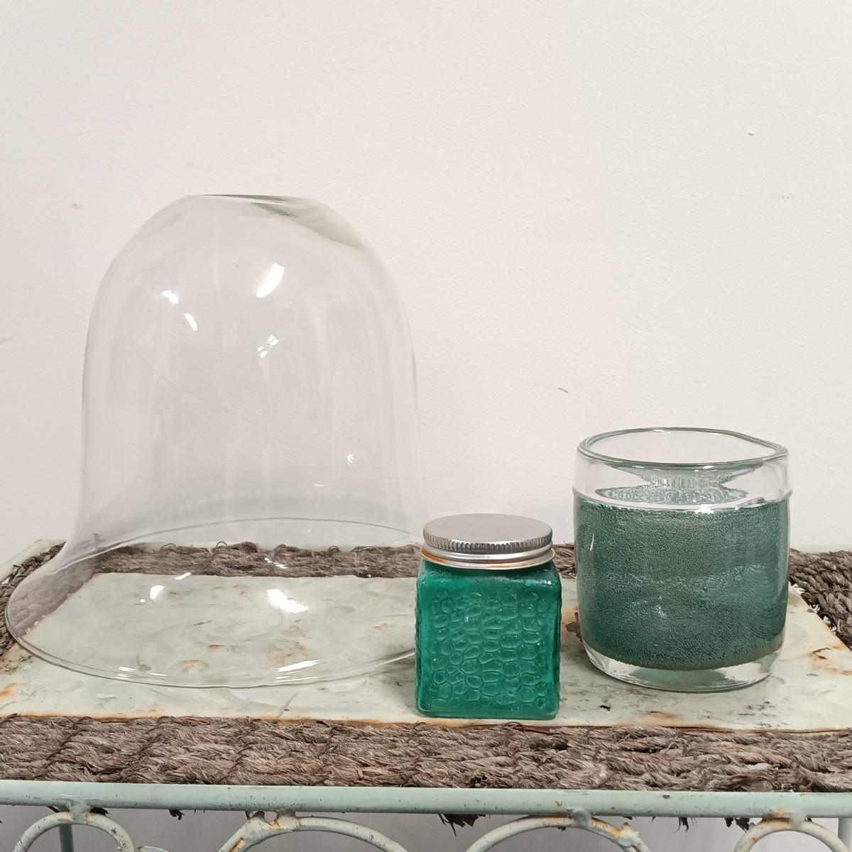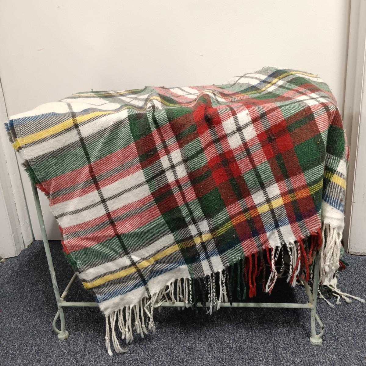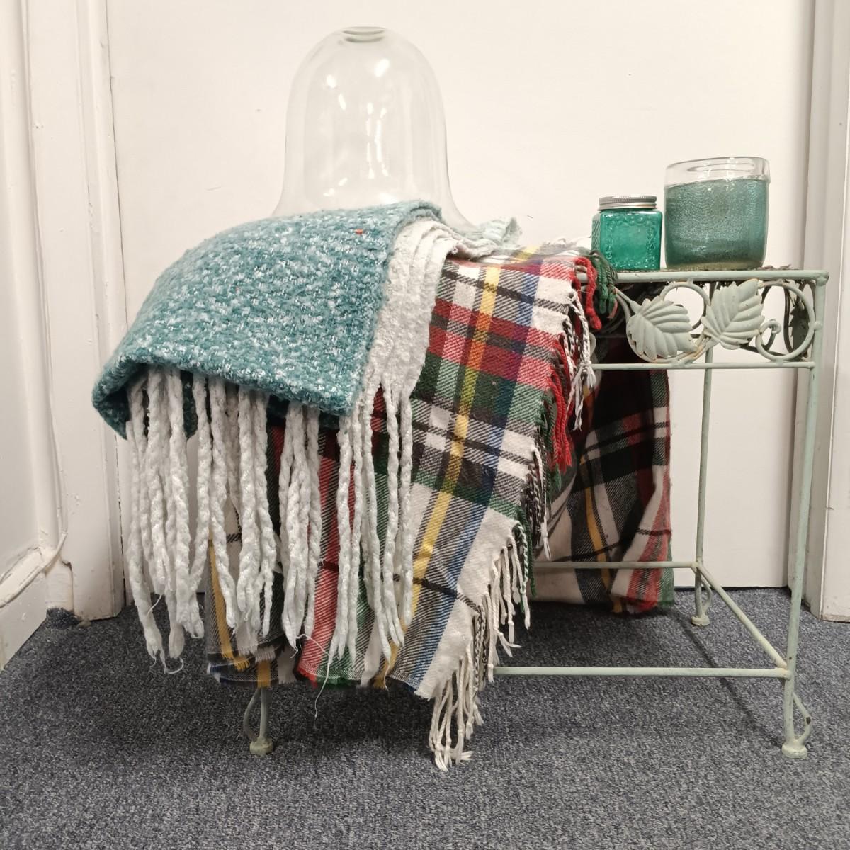 LOT 19: Wrought Iron Plant Stand with Scarf Shrugs and Glass Decor