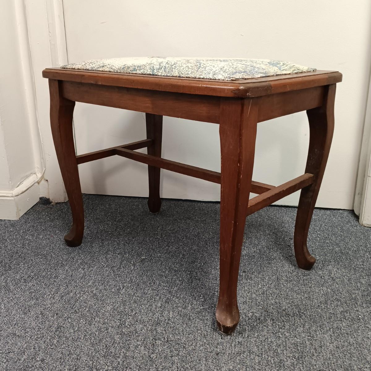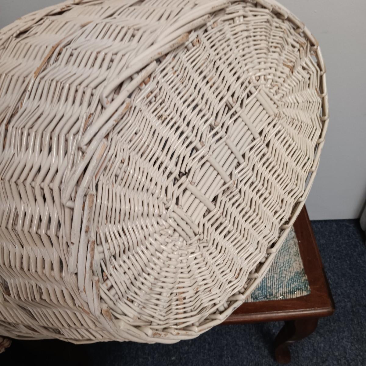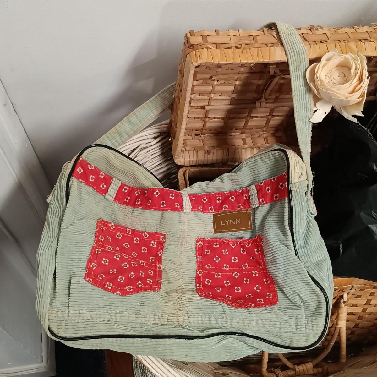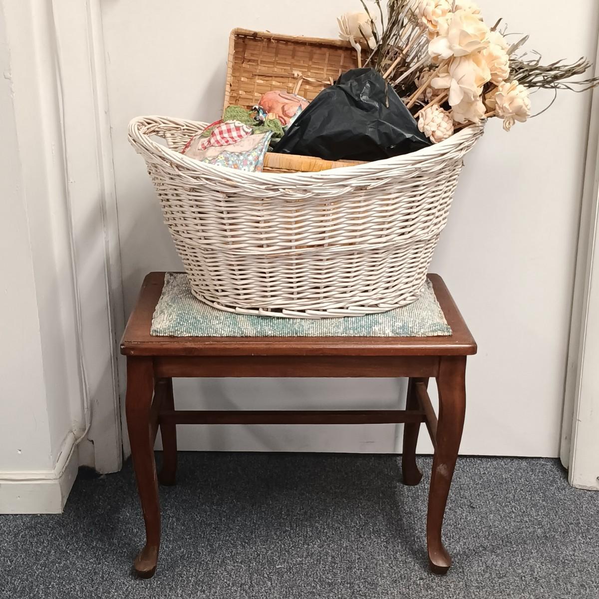 LOT 20: Wicker Basket, Corduroy Jeans Bag, Vintage dressing stool/table & More