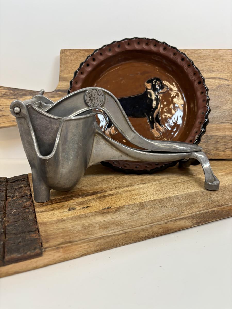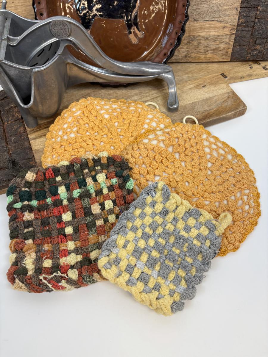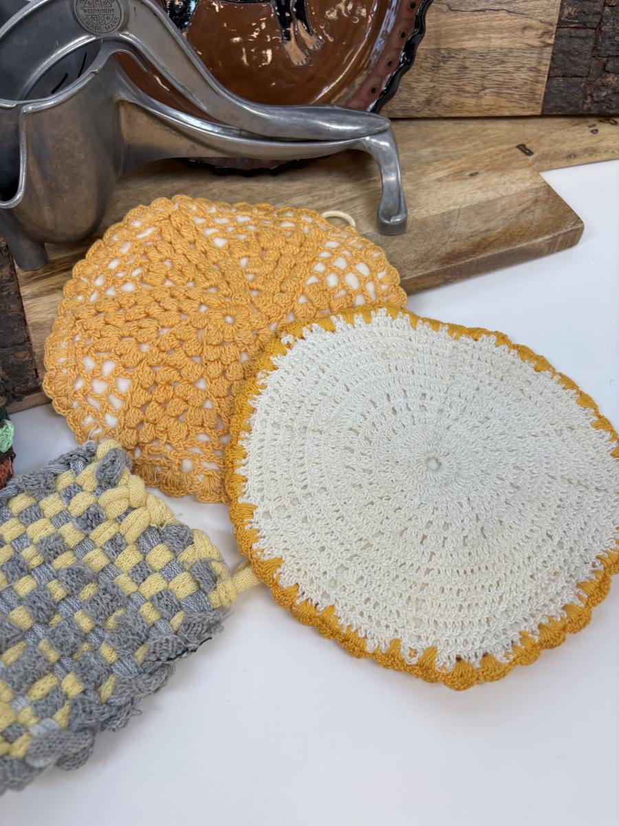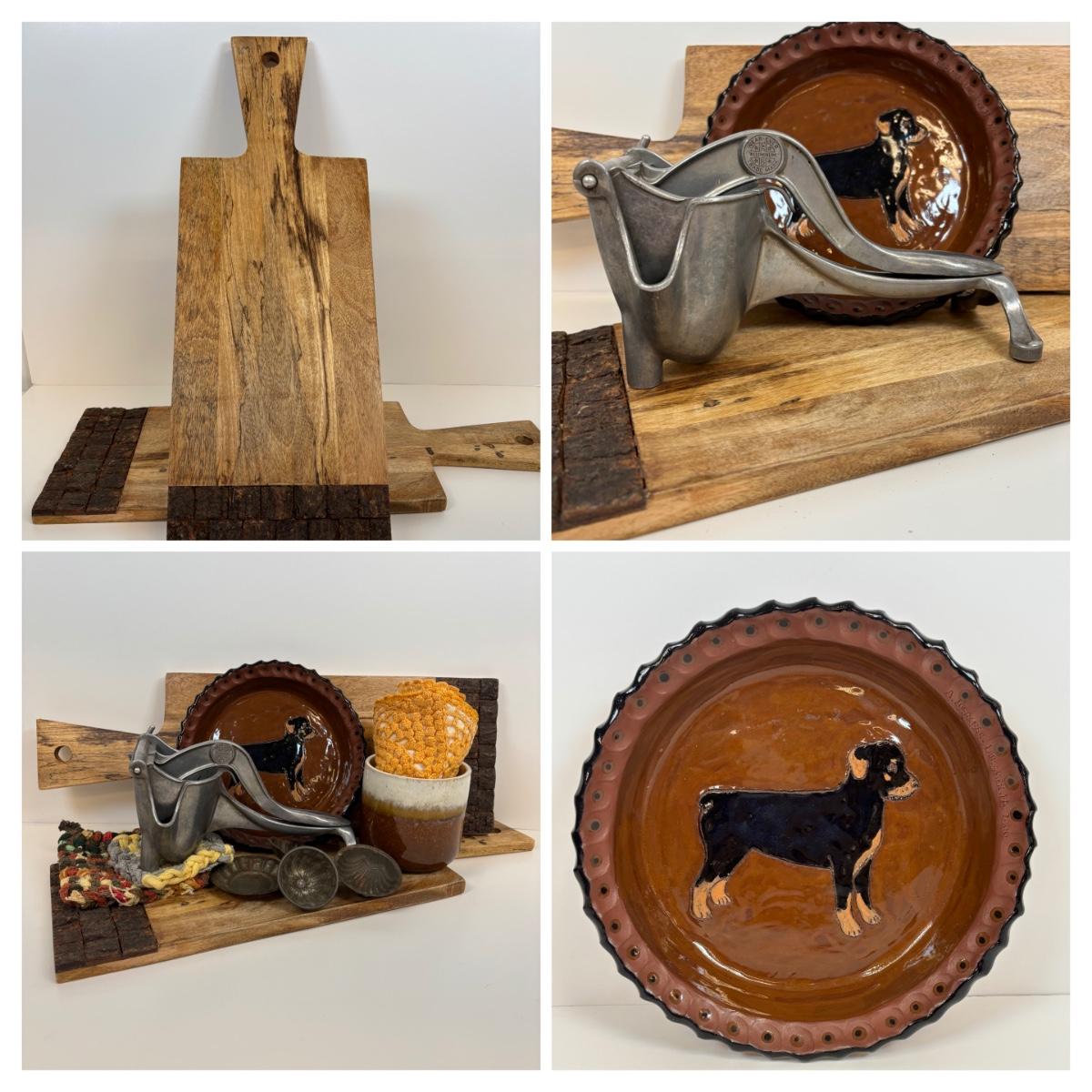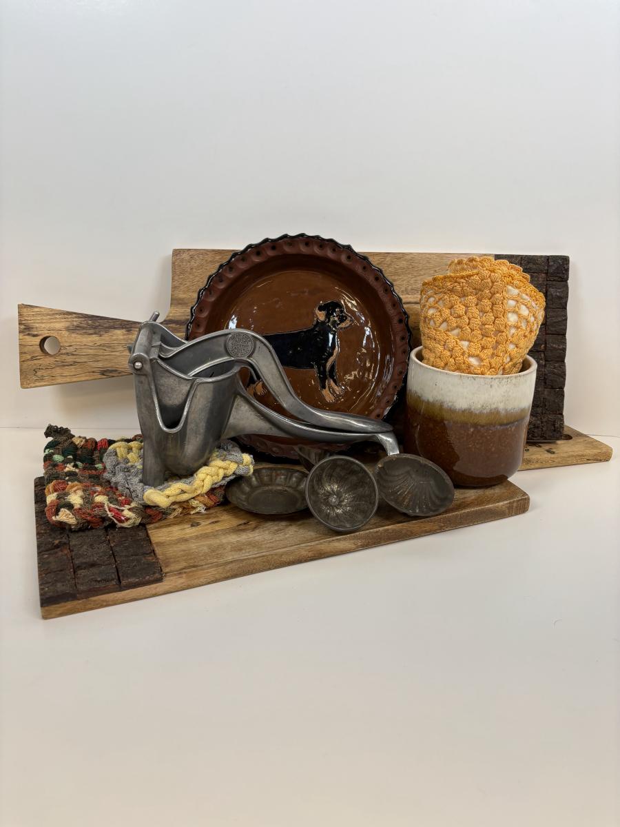 LOT 28: Wooden Charcuterie Boards, Vintage Wear-Ever Citrus Juicer, Crocheted Potholders, A. Loercher Earthenware/ Pottery Pie Plate Lancaster PA 2006 & More