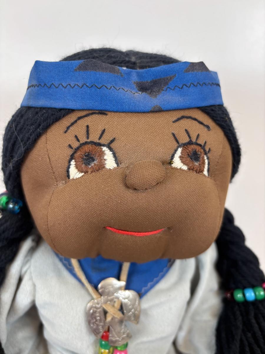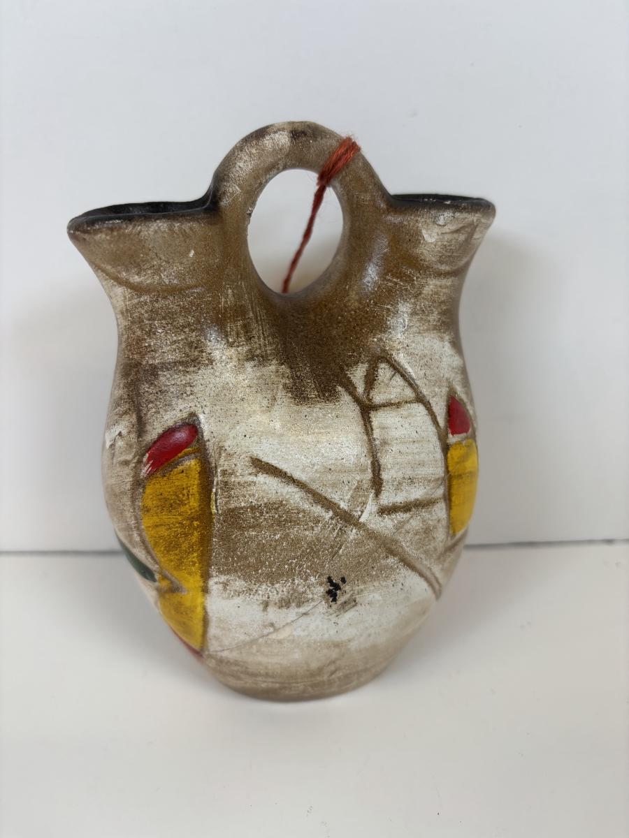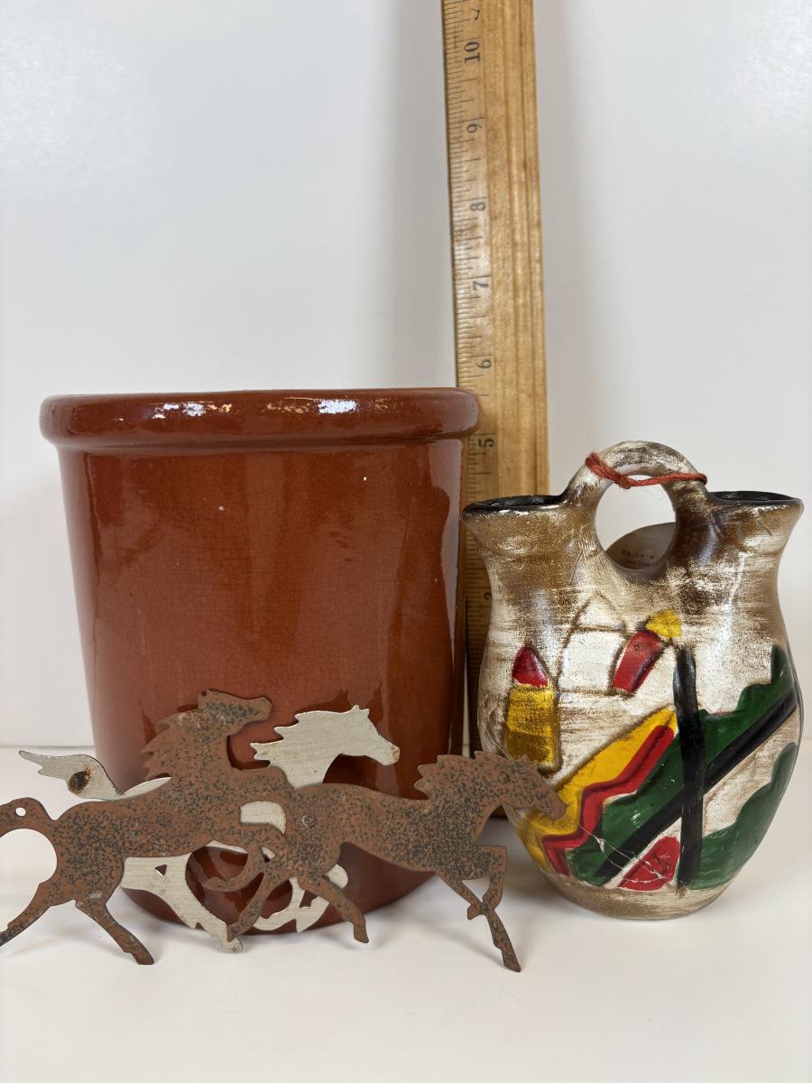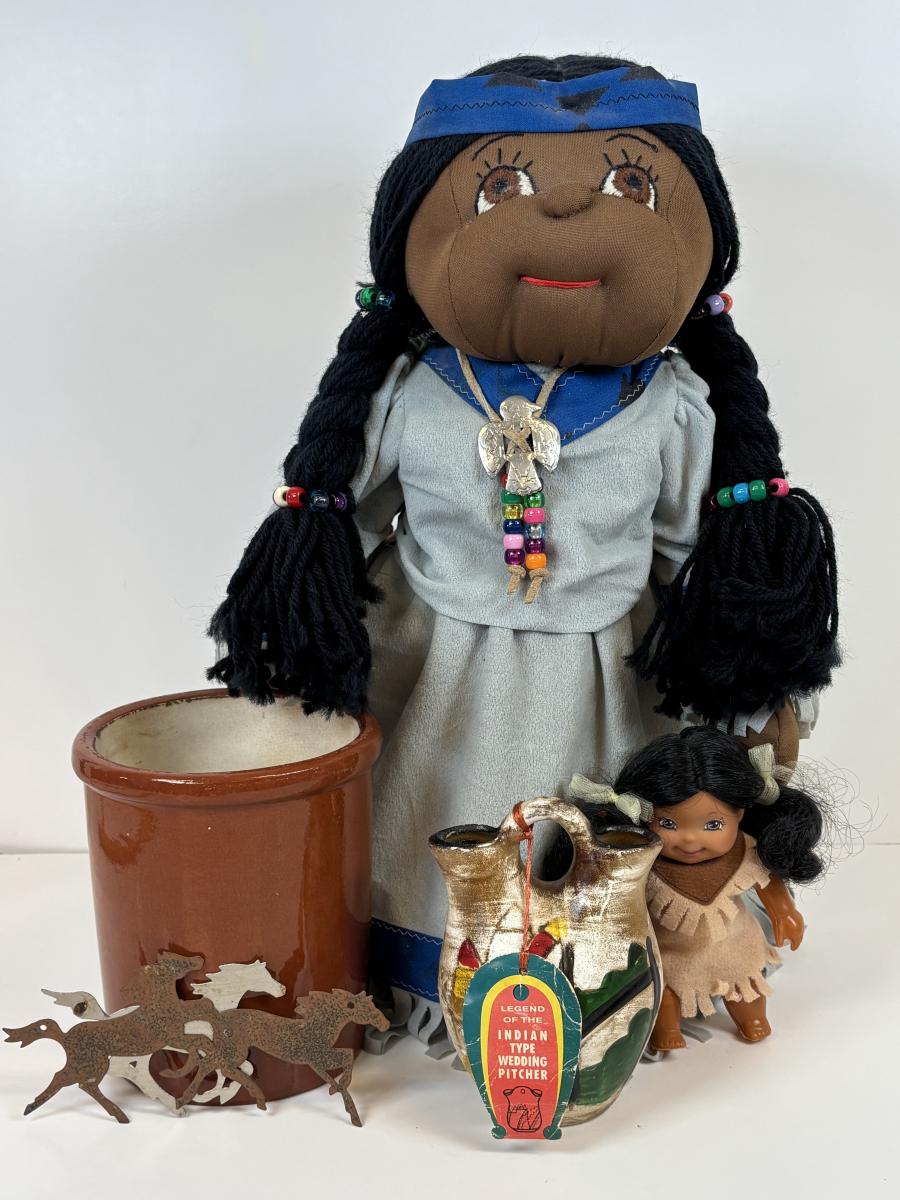 LOT 35: Hand-Crafted Native American Doll Doorstop, Native American Wedding Pitcher, Brown Glazed Stoneware Crock