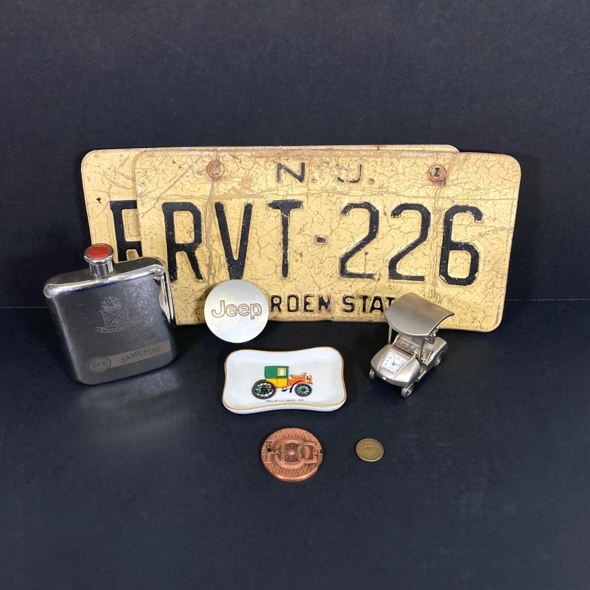 LOT 55: Vintage Collection - NJ License Plates, Limoges Dish, Jameson Flask, Golf Cart Desk Clock, Harley Owners Token and More