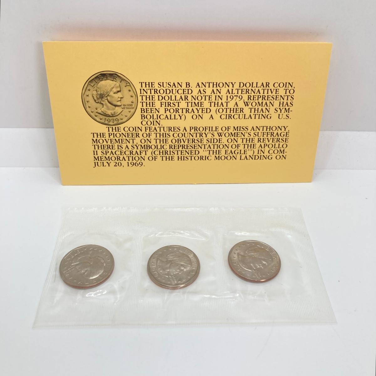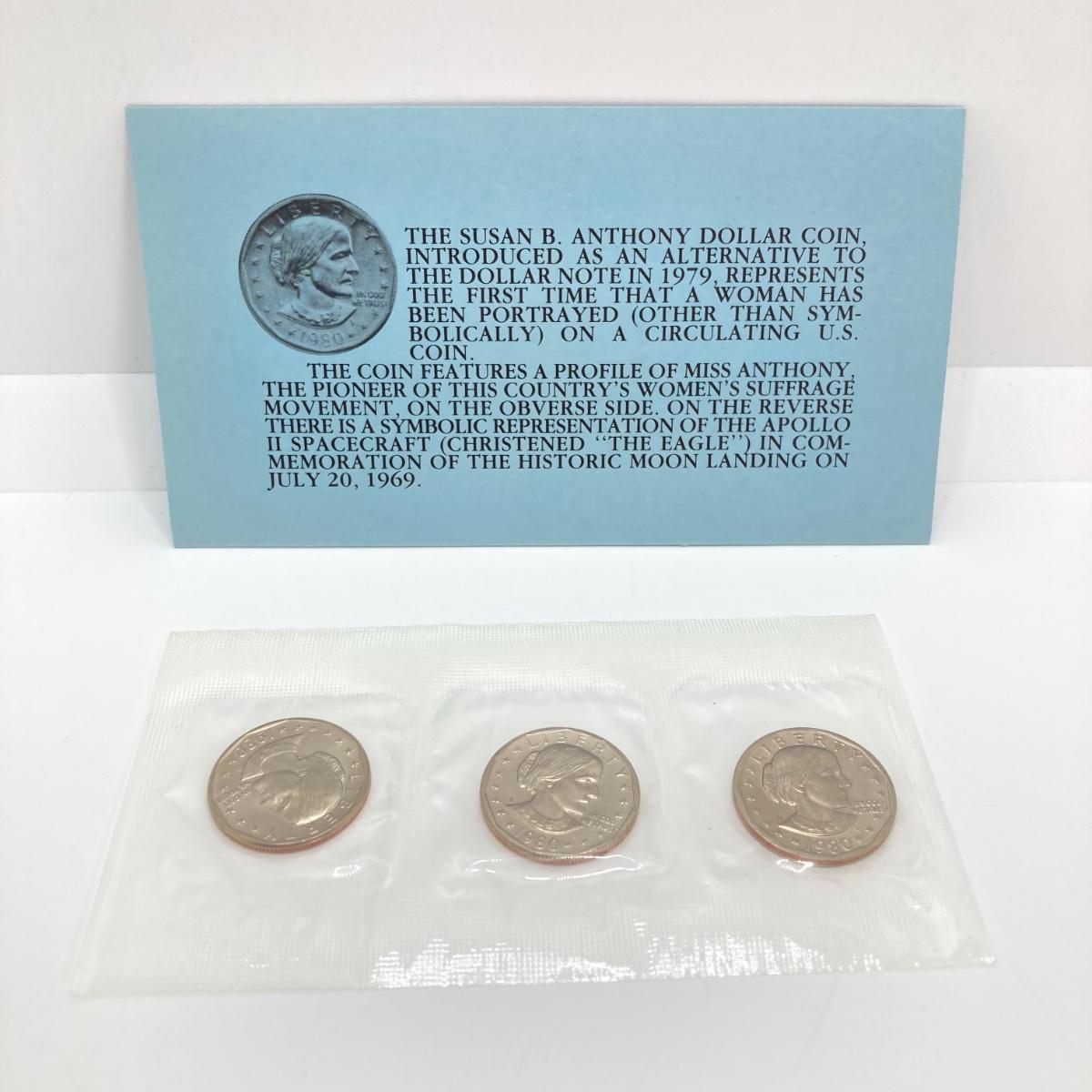LOT 75: Four US Souvenir Coin Sets - Two 1979 Susan B. Anthony $1 Dollar Coin Sets and Two 1980 Susan B. Anthony $1 Dollar Coin Sets (Some in Sealed Envelopes)