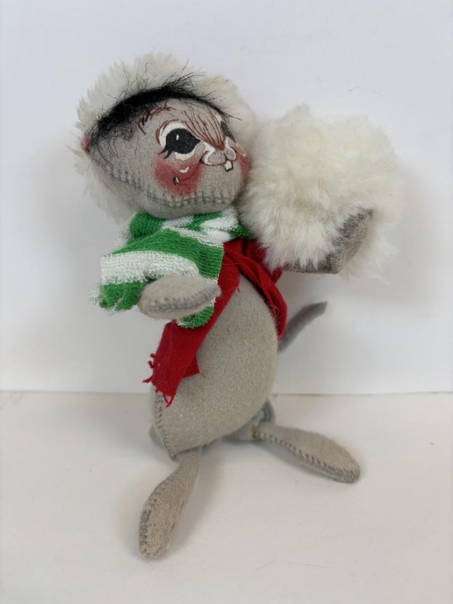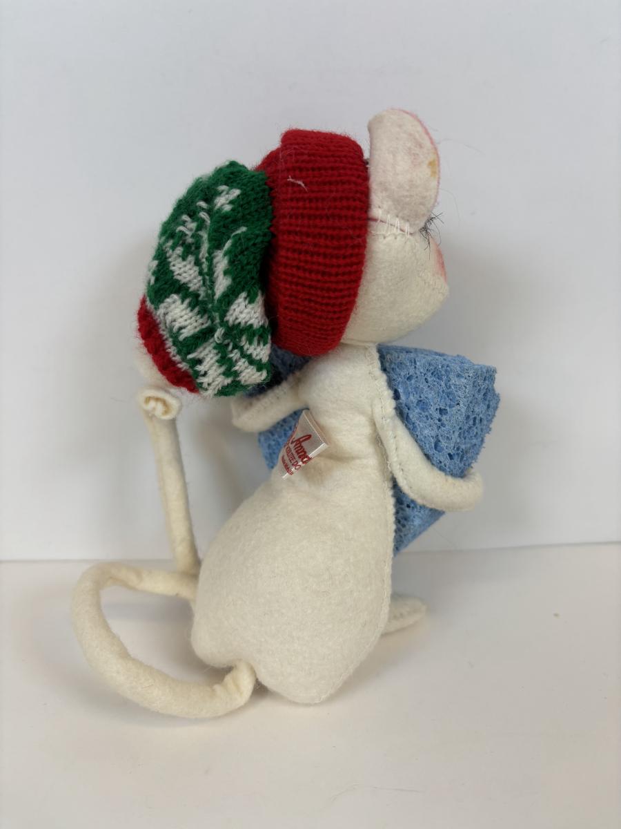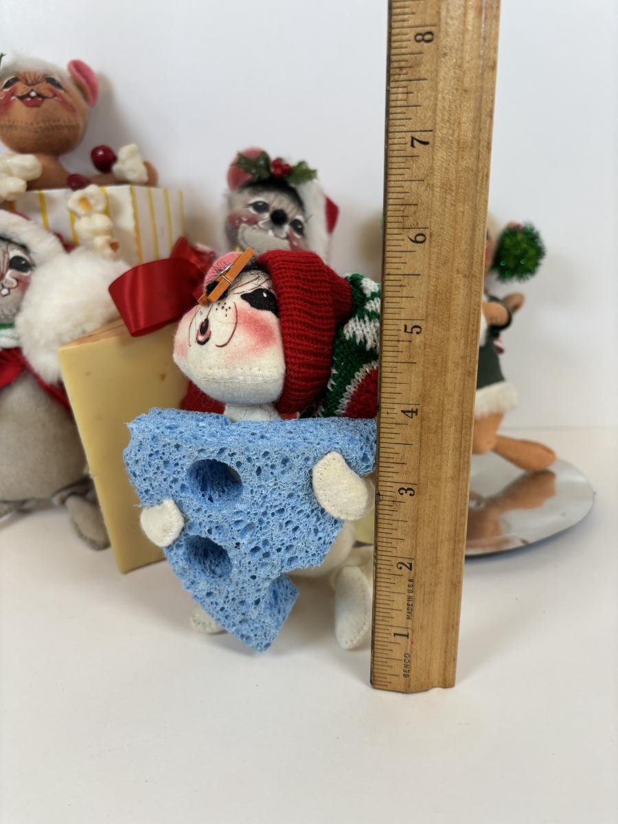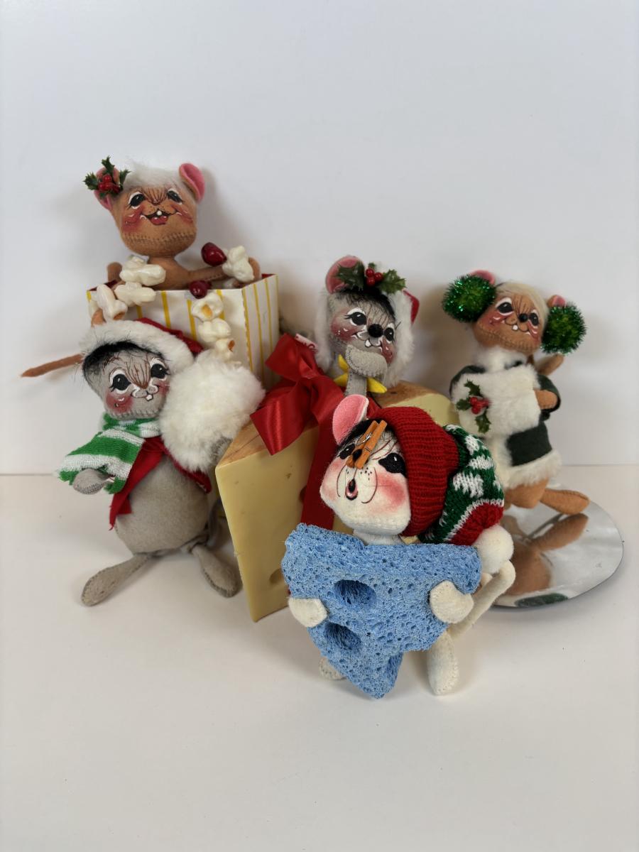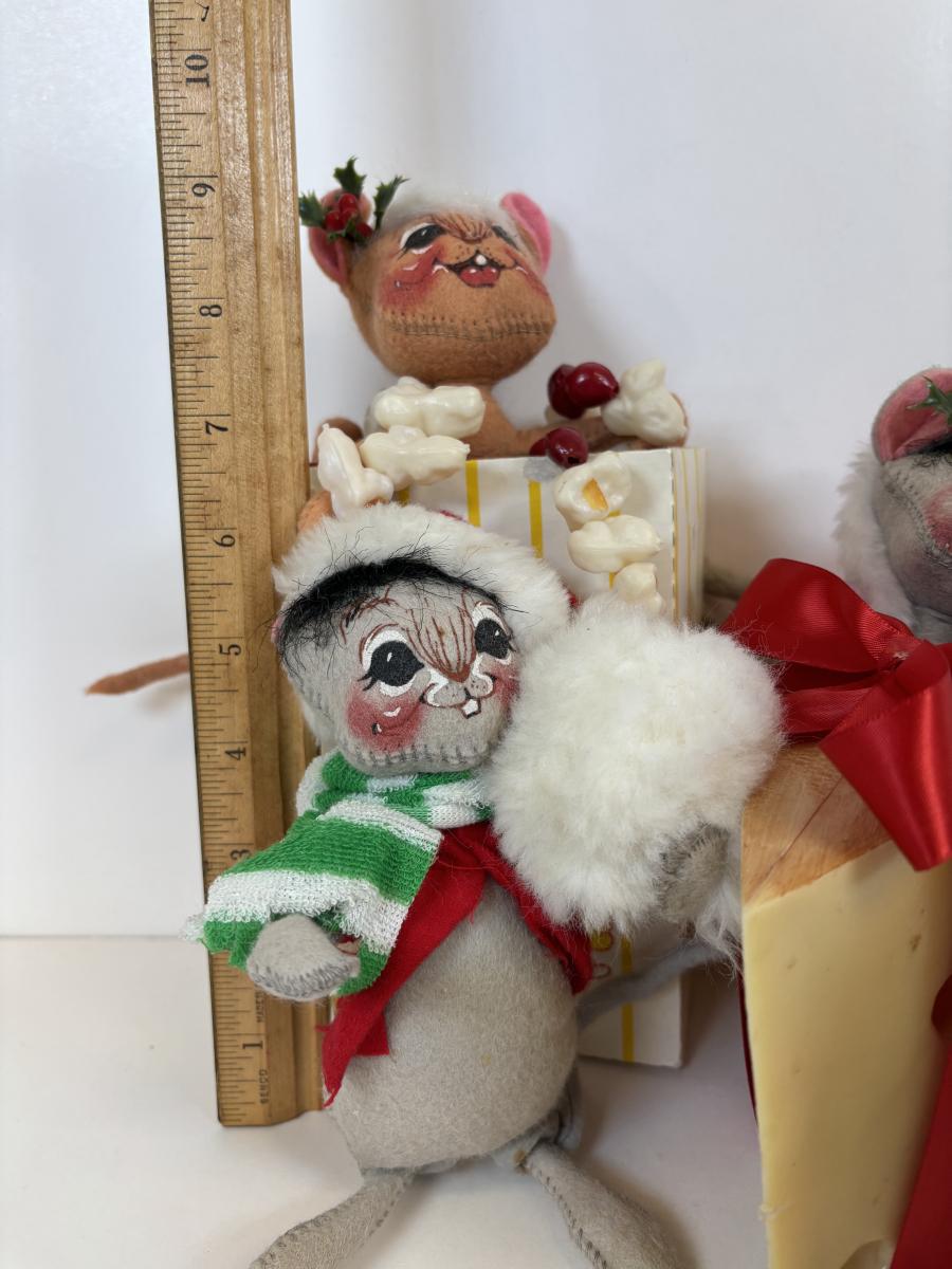 LOT 85: Vintage Annalee Collection: 1992 Country Mouse Cheese Wedge, 1997 Ice Skater, 1997 Popcorn, 2000 Stinky Cheese Mouse, Mouse w/Snowball
