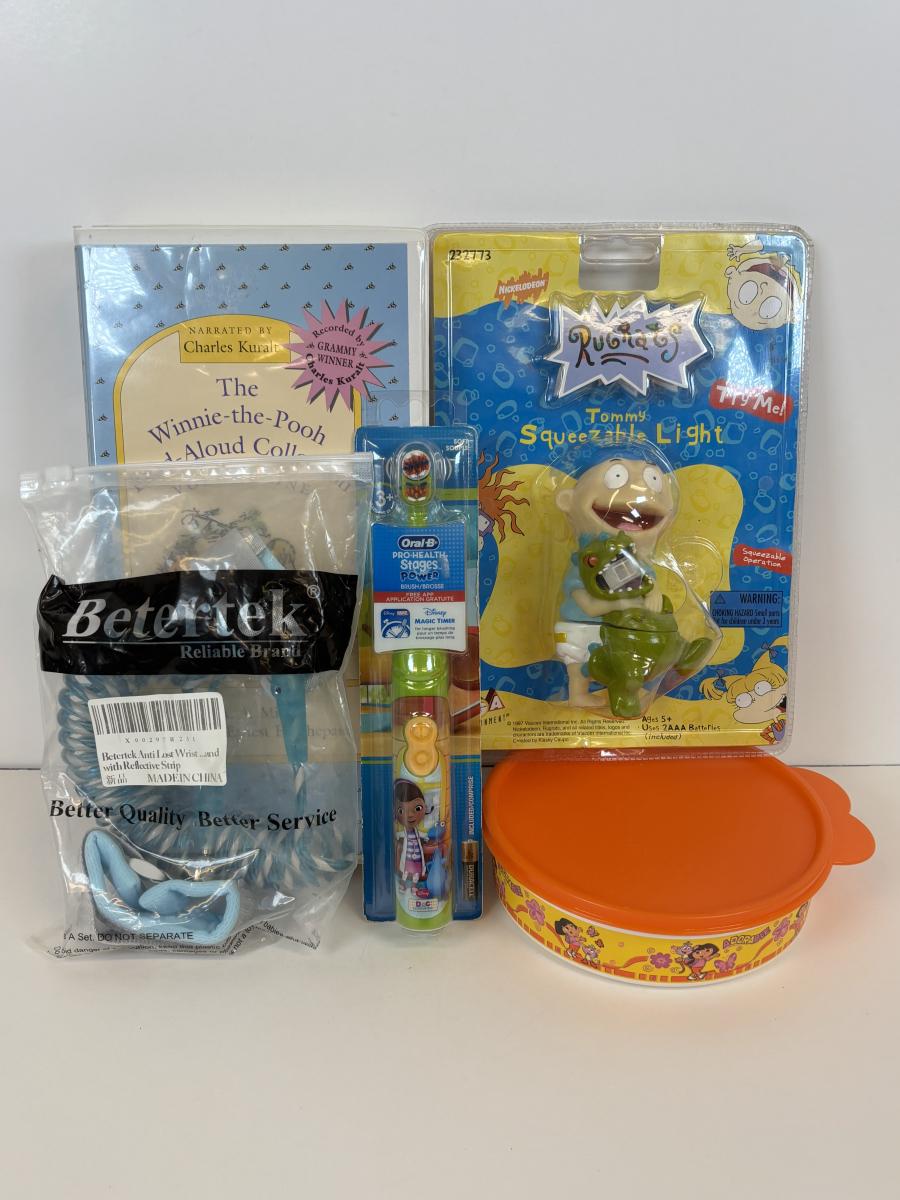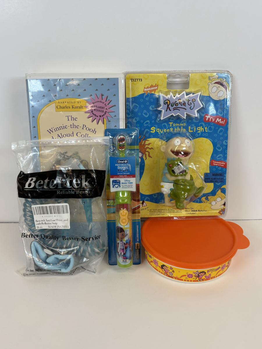 LOT 86: NIP Rug Rats Squeezable Tommy Light, NIP Oral-B Disney's Doc McStuffins Power Toothbrush, Winnie the Pooh Read Out-ALoud Collection, Tupperware Dora Container & More