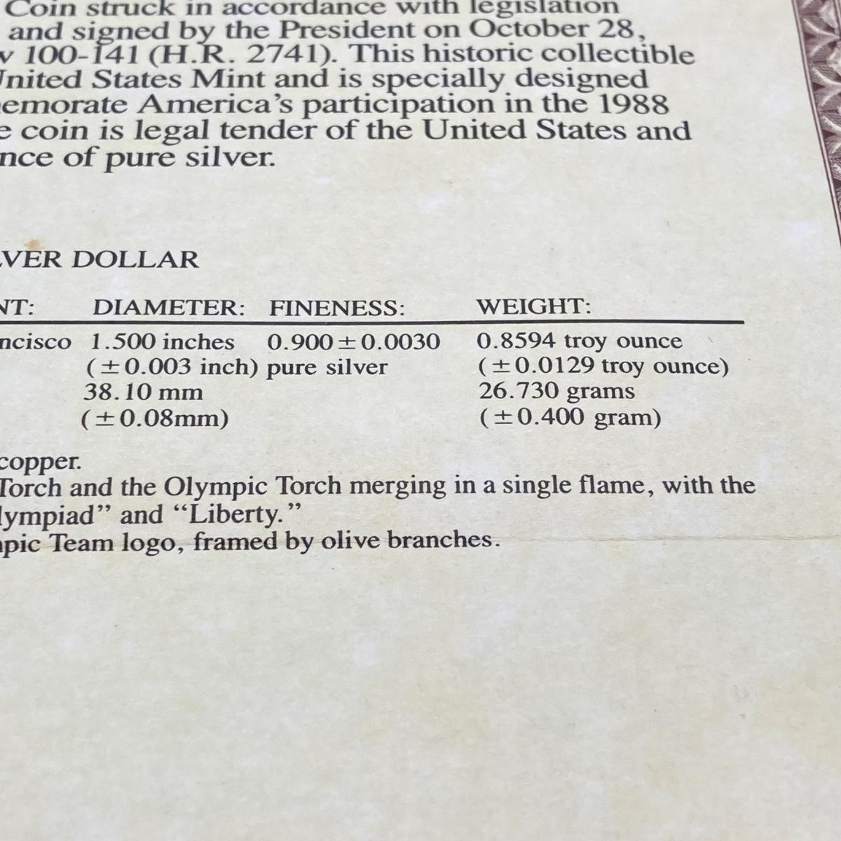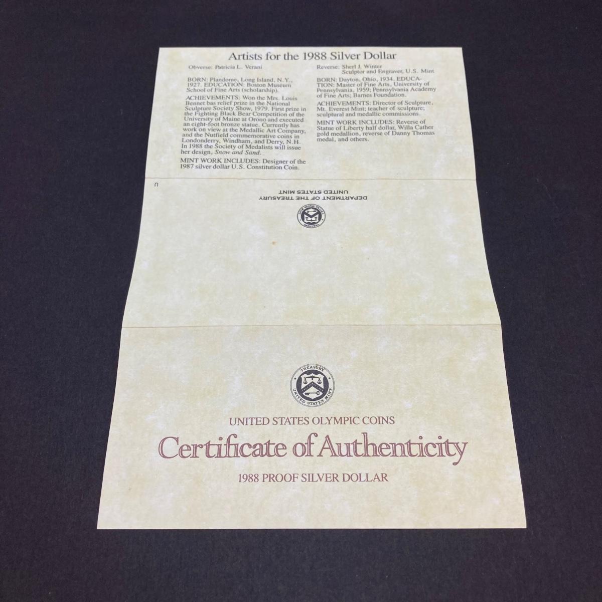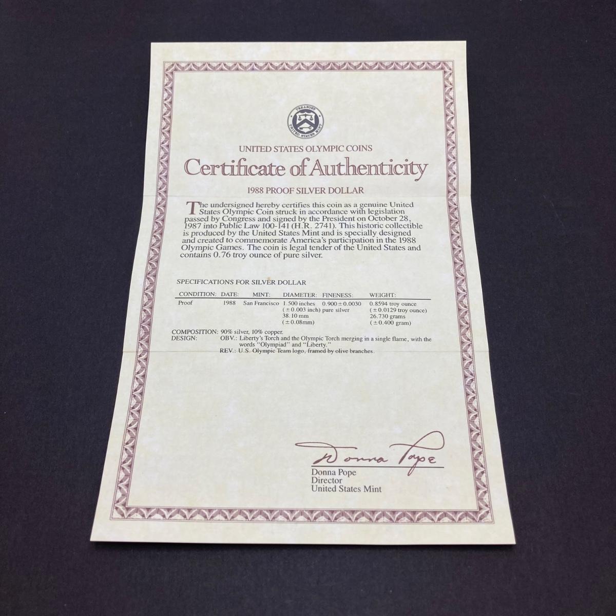 LOT 106: United States Mint 1988 Olympic Silver Dollar Proof Coin with Presentation Box and Certificate of Authenticity