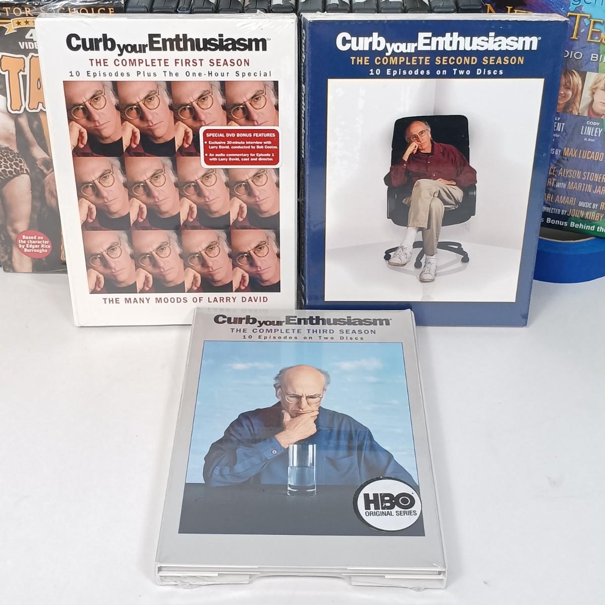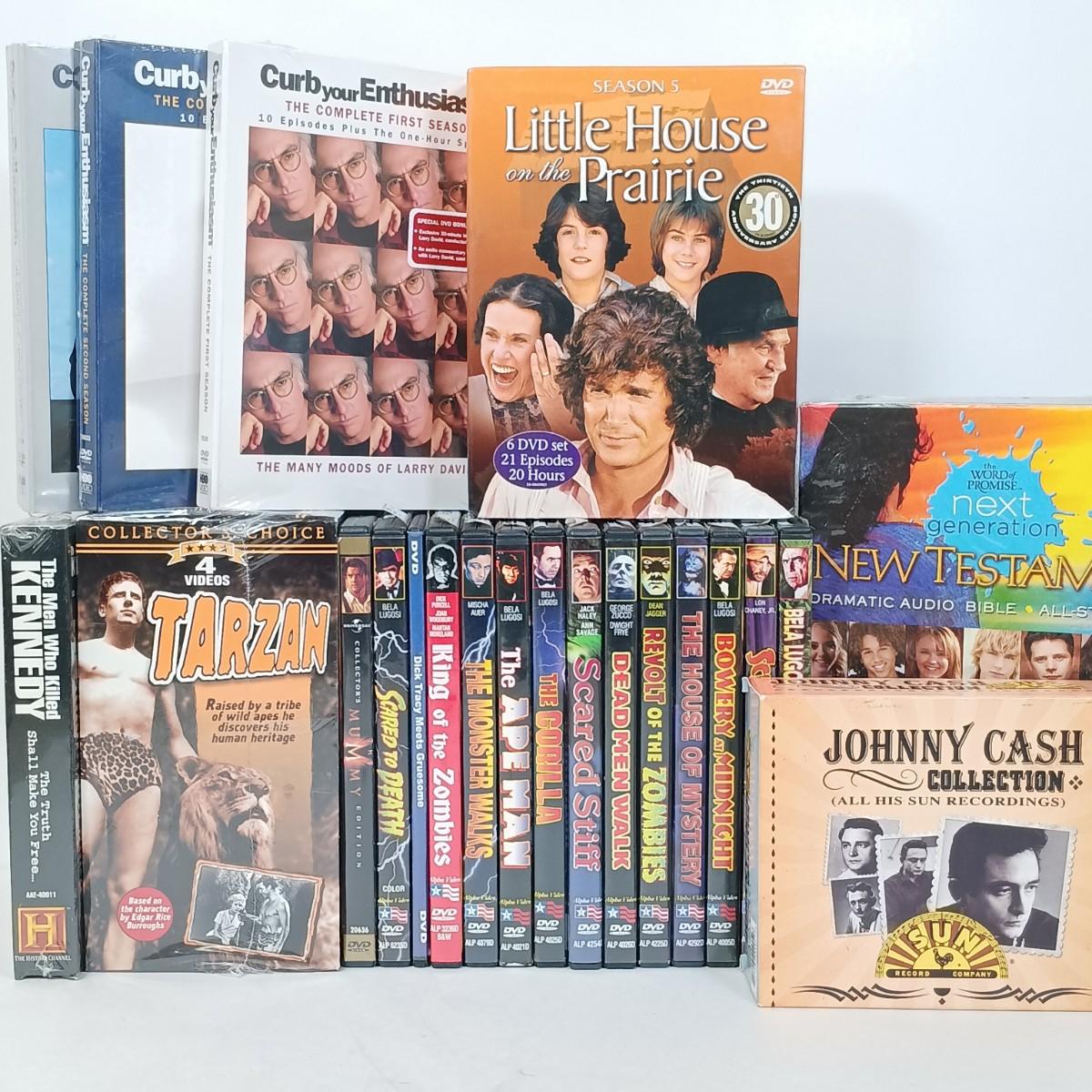 LOT 116: Media Collection- NIP Curb Your Enthusiasm Seasons 1-3, NIP Little House on the Prairie Season 5, Vintage Horror DVDs & More