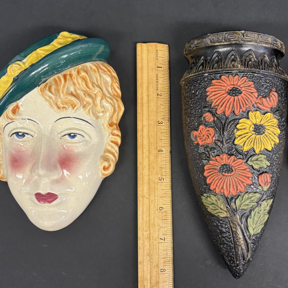 LOT 145: Vintage Art Deco Lady Wall Pockets along with a Vintage Floral Wall Pocket