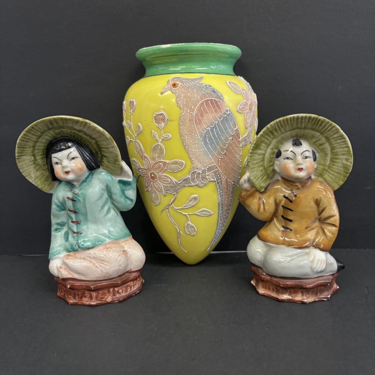 LOT 147: Vintage Moriage Bird Wall Pocket & Hand-Painted Figural Wall Pockets
