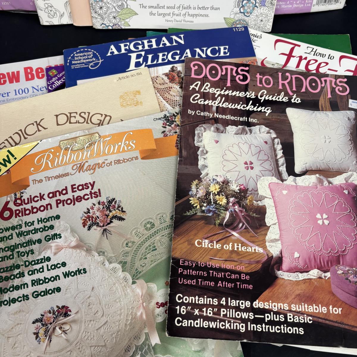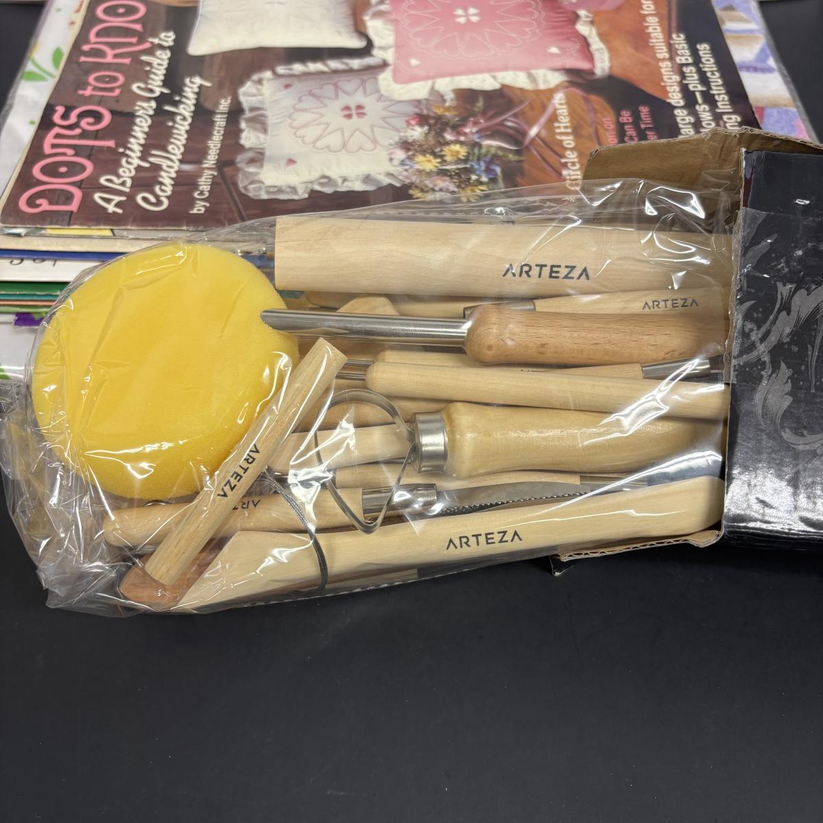 LOT 150: Plastic Canvas Kits, Color Art Books, Pottery/Clay Tools (NIP) and Craft Pattern Magazines